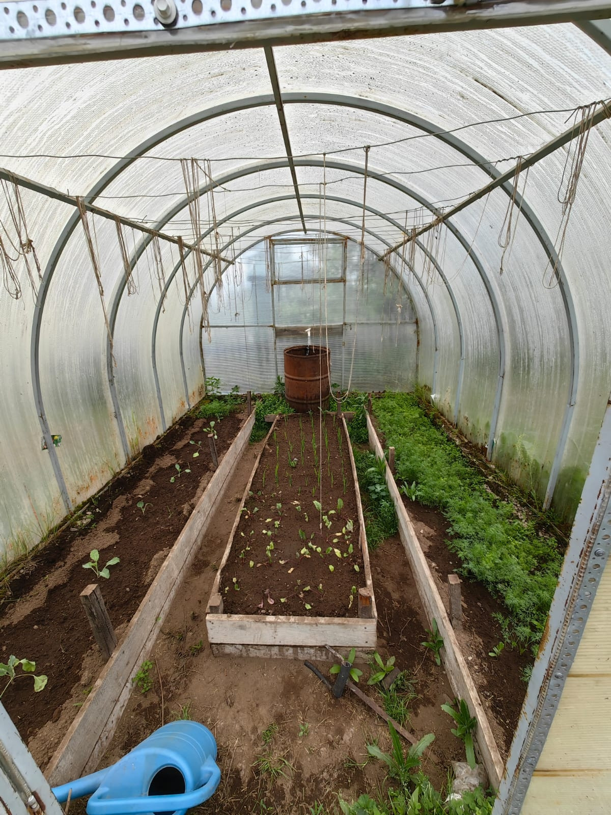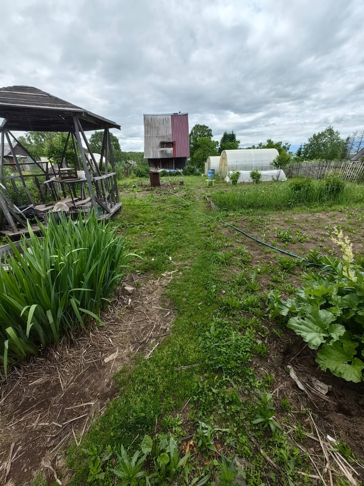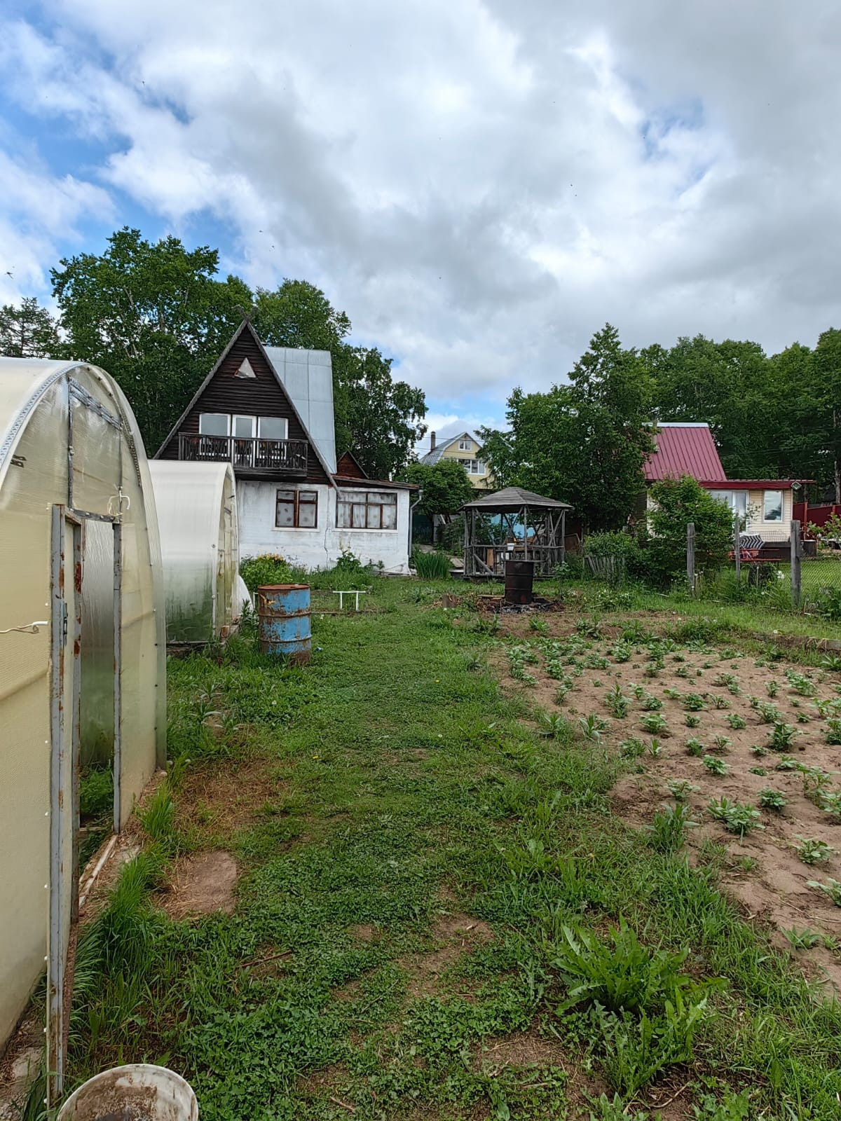 На участке две теплицы  с поликарбоната на фундаменте с выведеными кранами для подачи воды в бочки, что не маловажно!!!