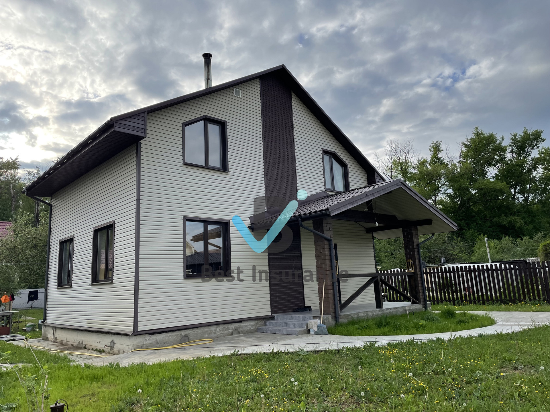 Фундамент - Ленточный железобетонный фундамент. Стены - неотесанное бревно 240 мм , утеплитель 100 , сайдинг, крыша — металлочерепица , окна пластиковые.
