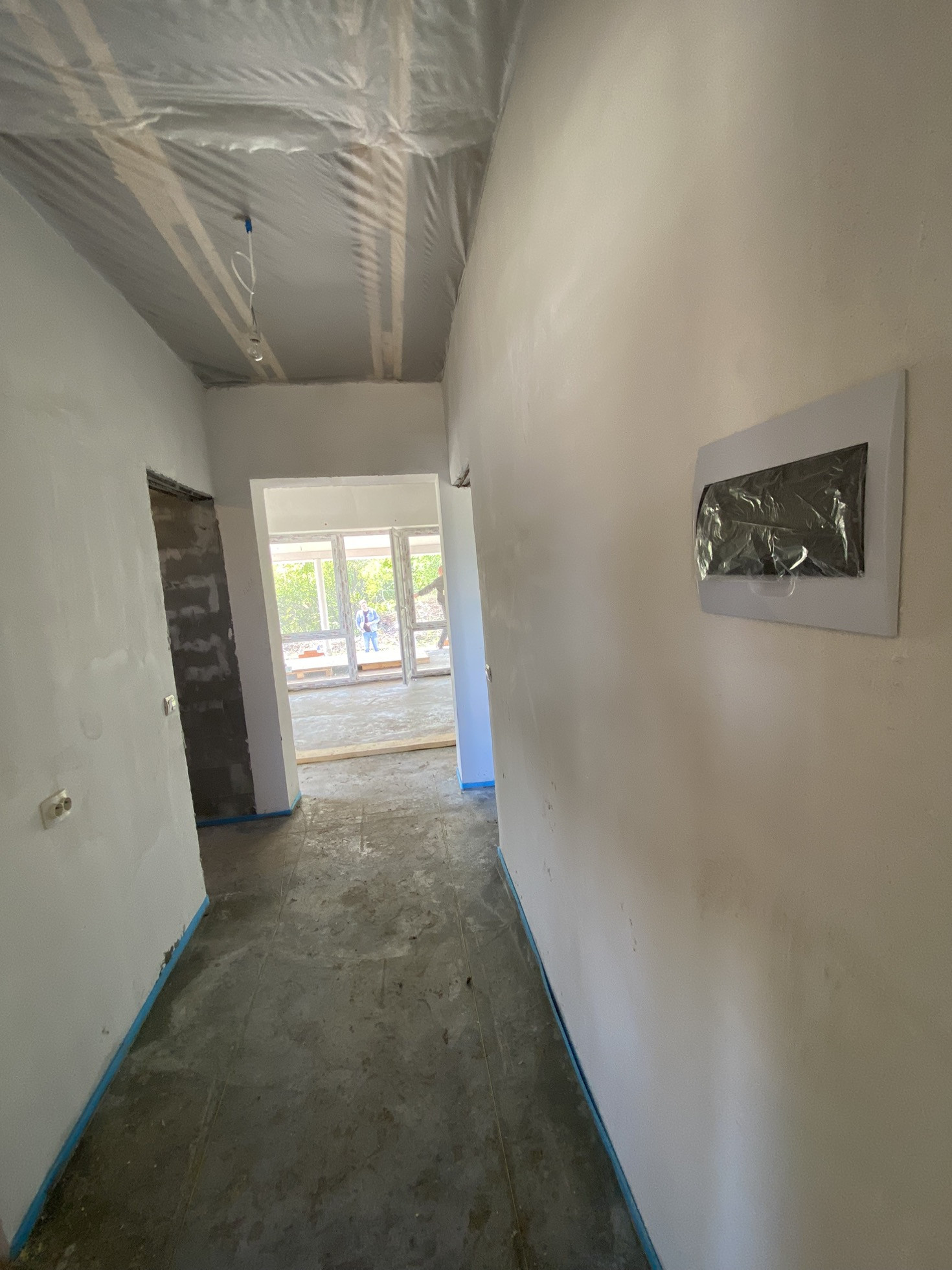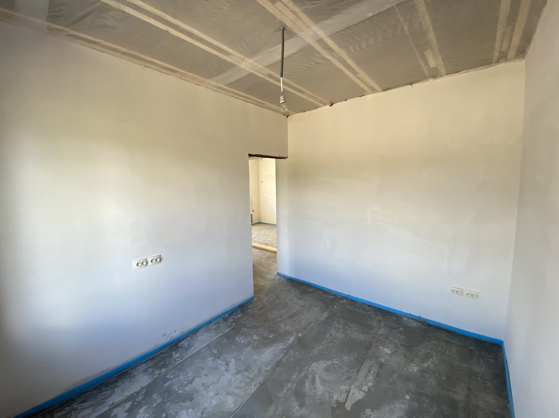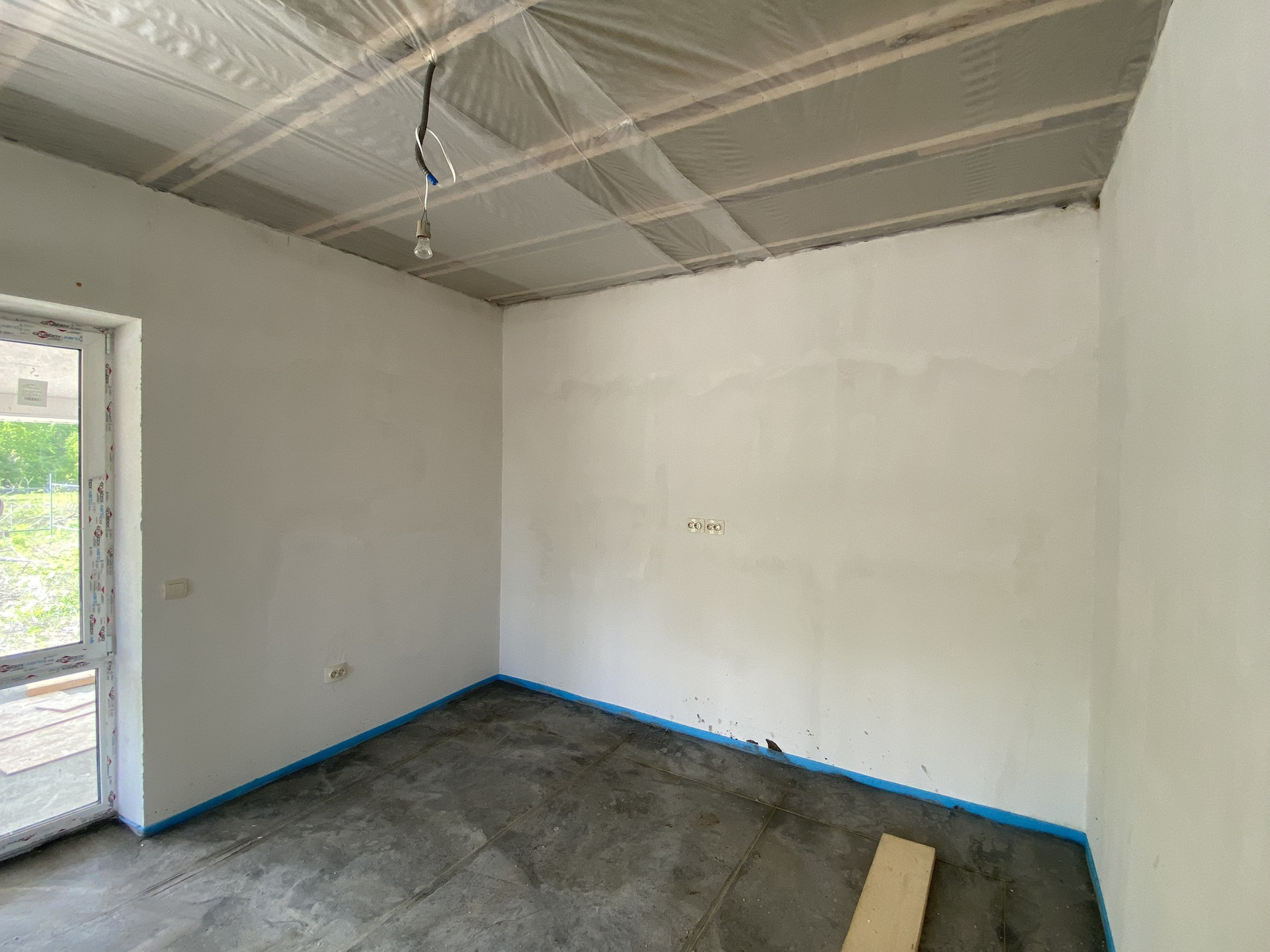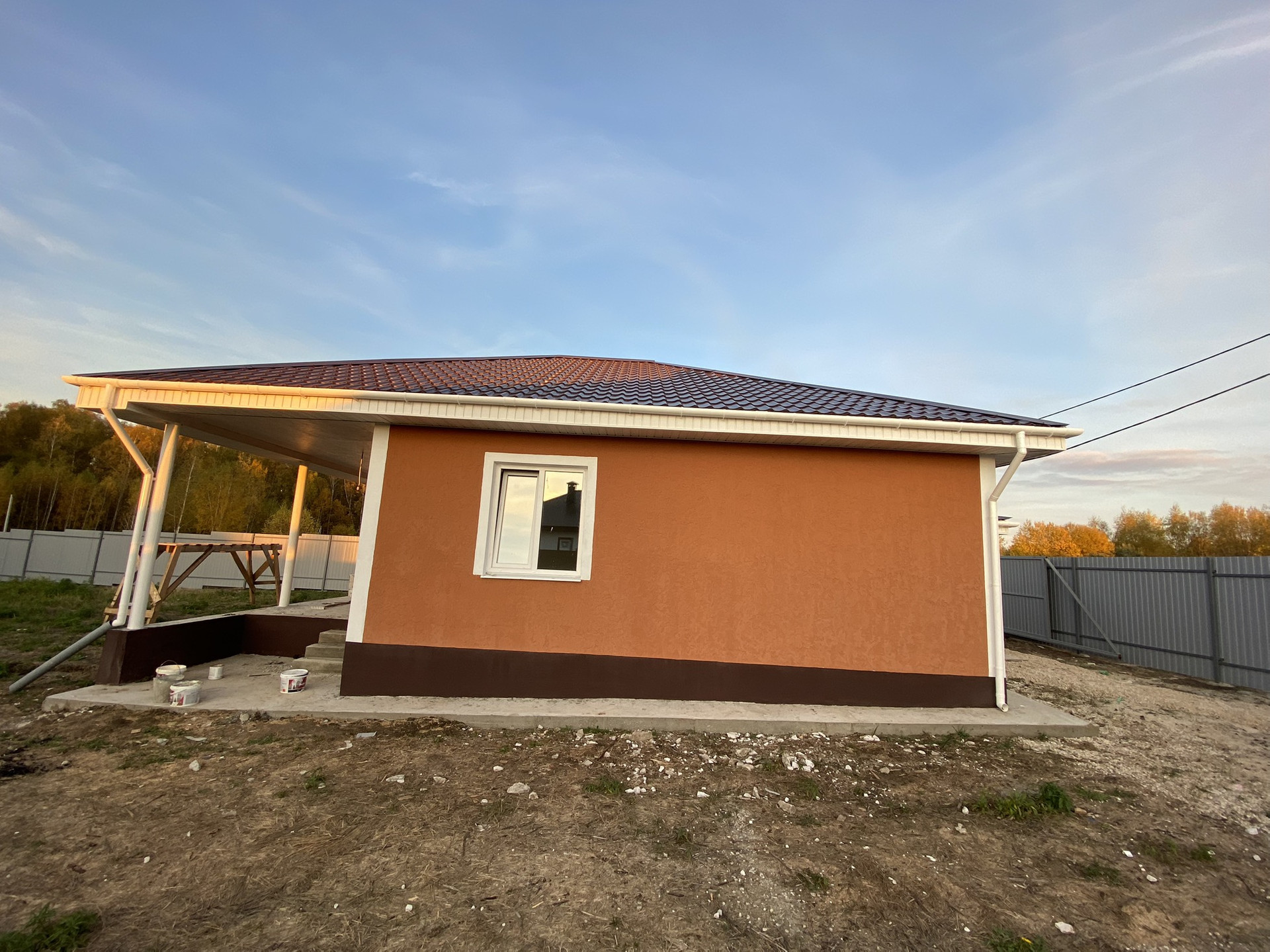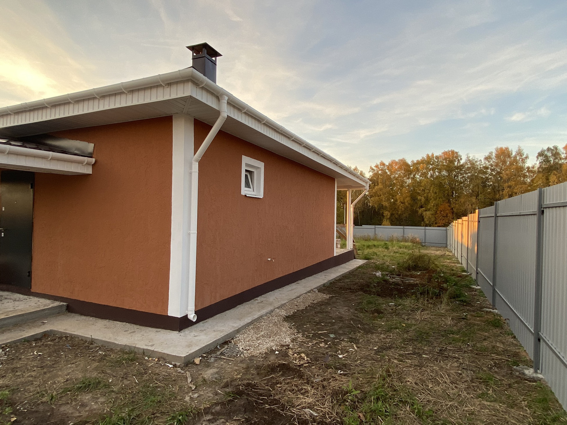 -Входная дверь  -уличная с терморазрывом.                                                          - Отделка внутренняя: стены оштукатурены, стяжка пола везде, электрический котёл;                       - ОТОПЛЕНИЕ ДОМА тёплым полом, радиаторов нет вообще; разводка электричества по всему дому.                                                                  - забор из профлиста с 4-х сторон, с фасада предусмотрены раздвижные ворота и калитка.