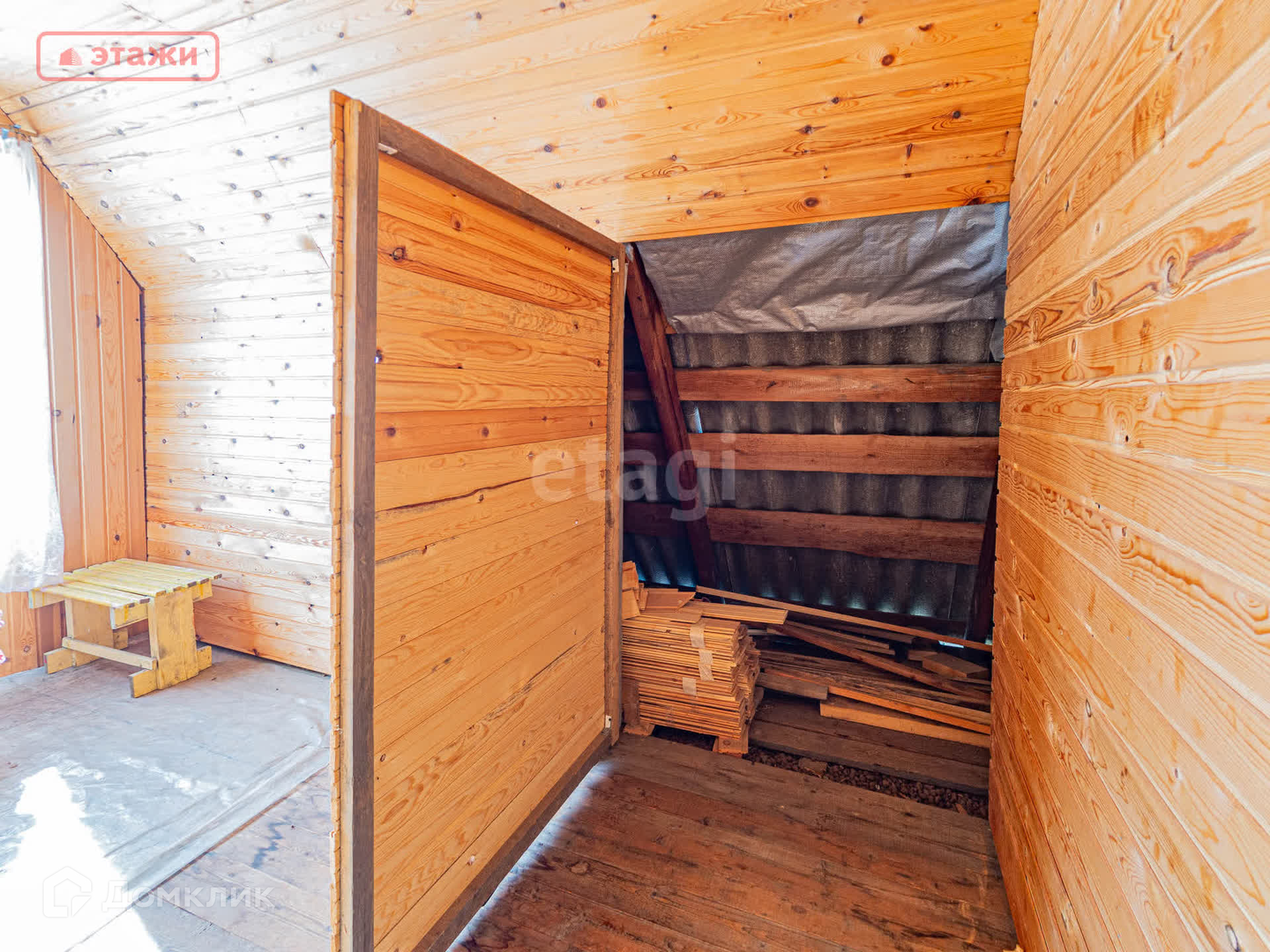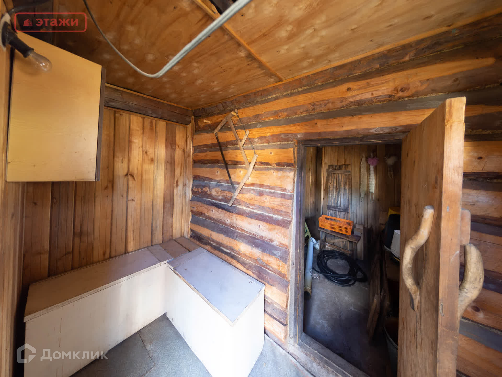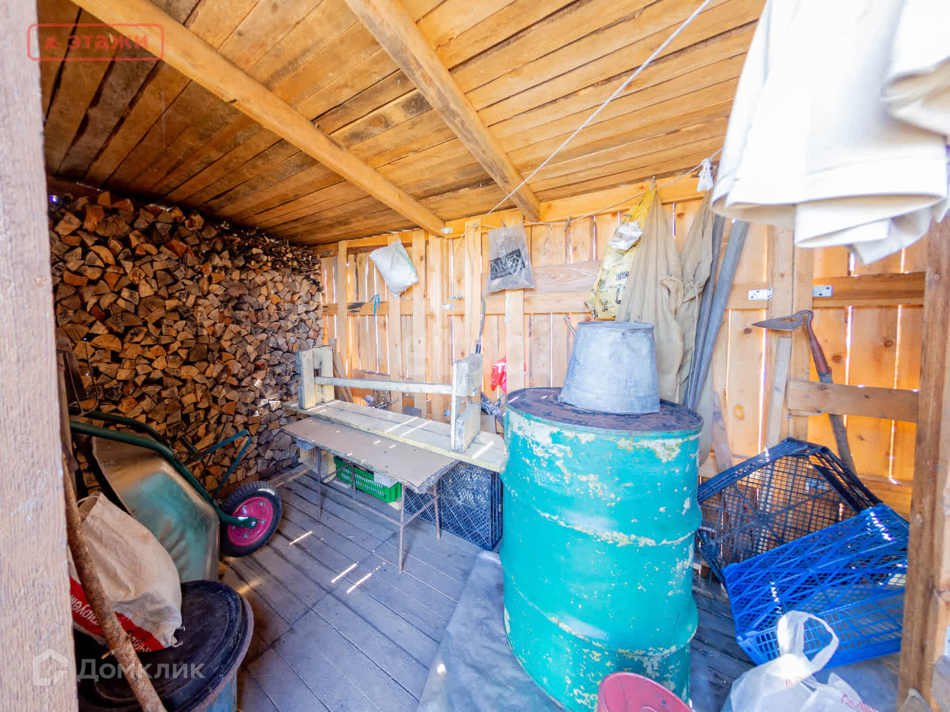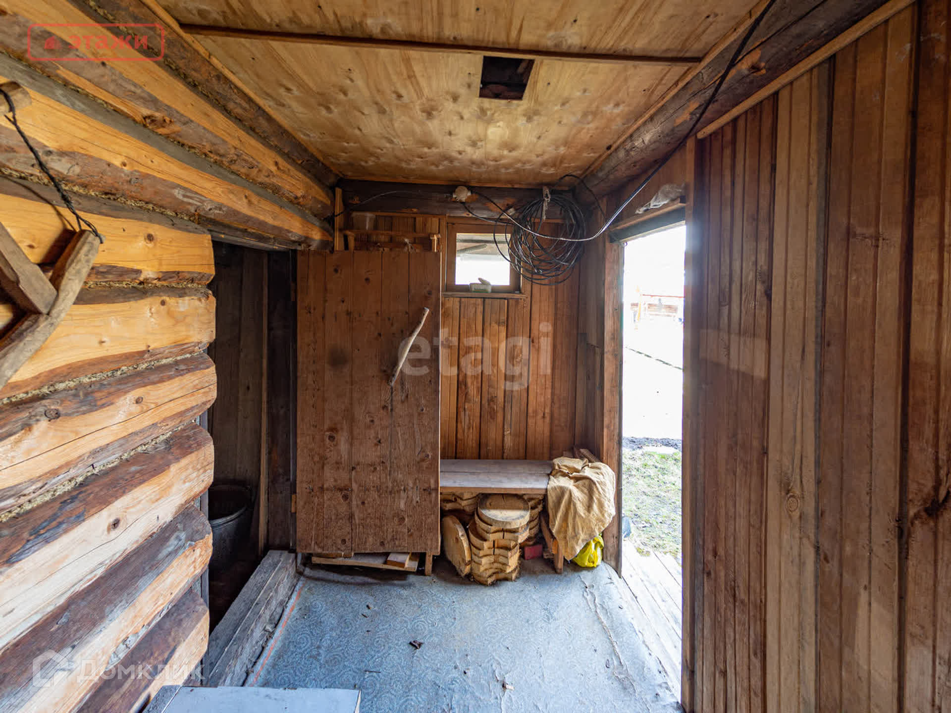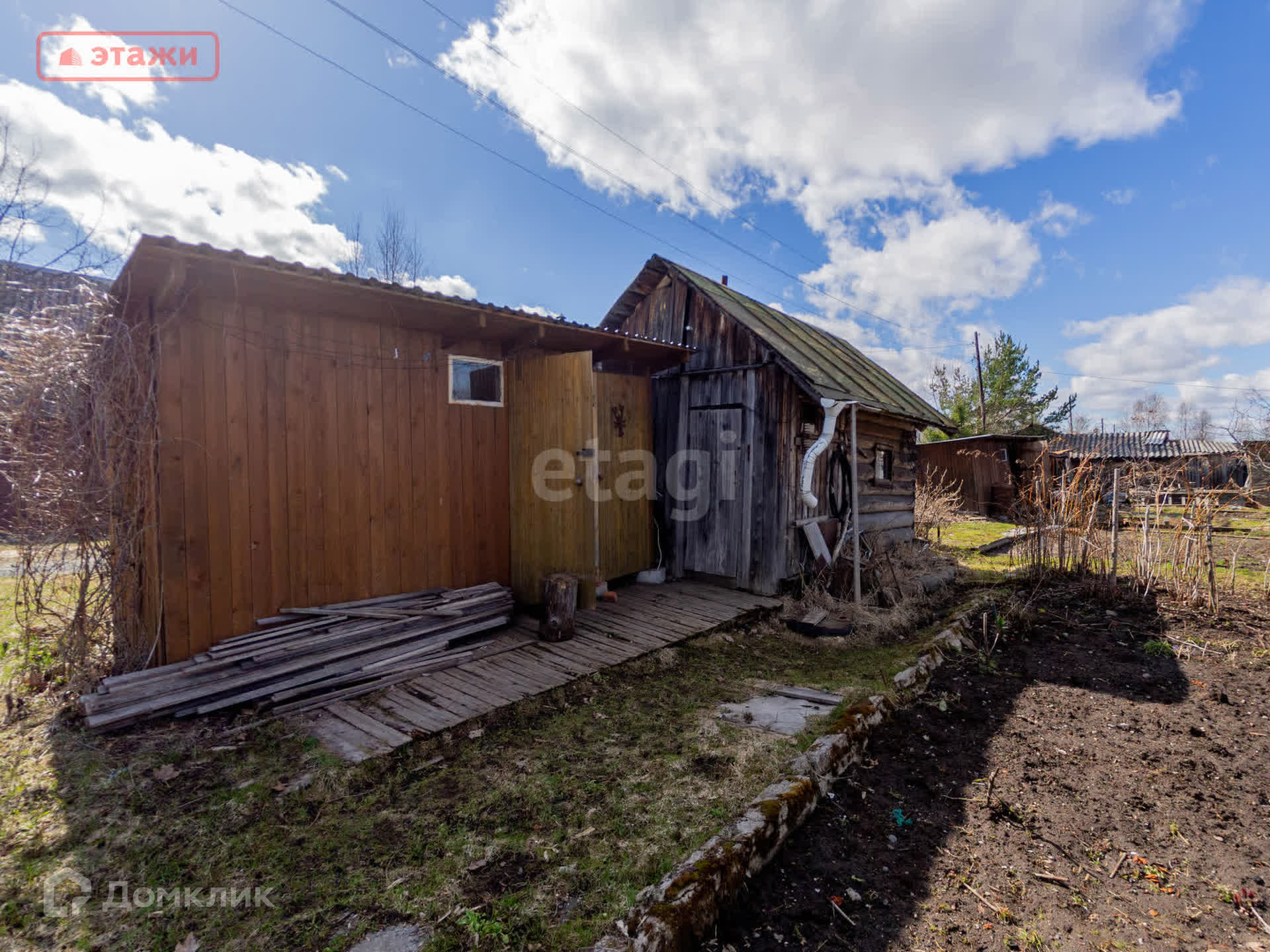 На участке, противоположной стороне от дома, сарай- дровяник, рядом помещение для био туалета и баня.