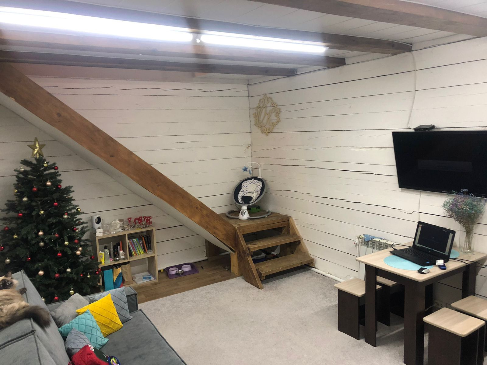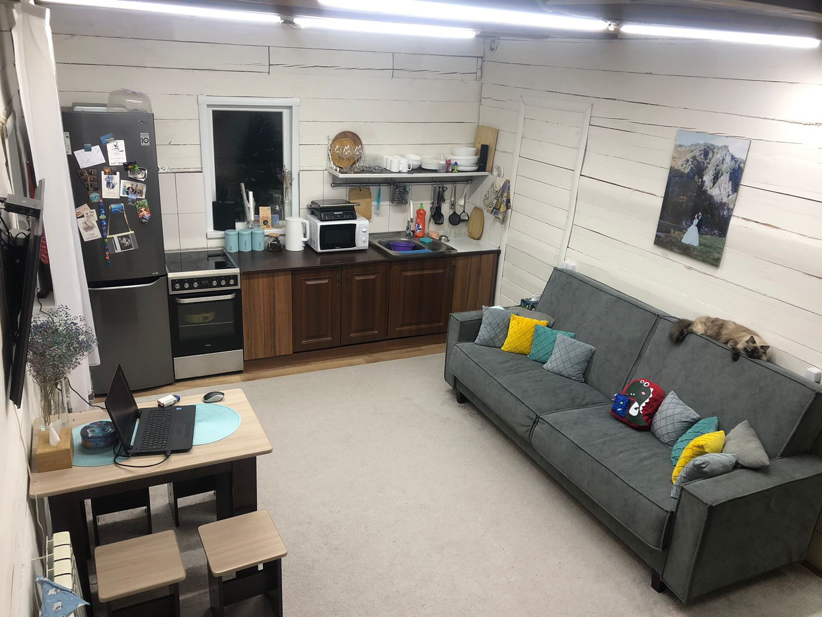 Дом построен из 18-го бруса, 2 полноценных этажа. На первом этаже расположены прихожая, ванная комната, кухня-гостиная. На втором этаже небольшой хол и две комнаты.
