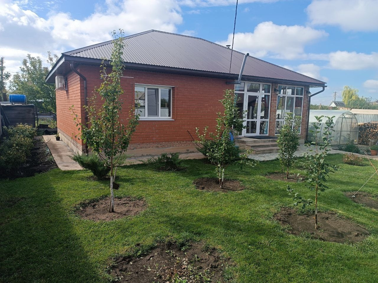 Участок правильной формы 5 соток с насаждениями. Перед домом посажен газон, имеется теплица. При въезде установлен огромный навес для двух машин, с хозблоком для инвентаря. Отдельное внимание заслуживает забор, с откатными воротами и автоматикой фирмы «DoorHan»