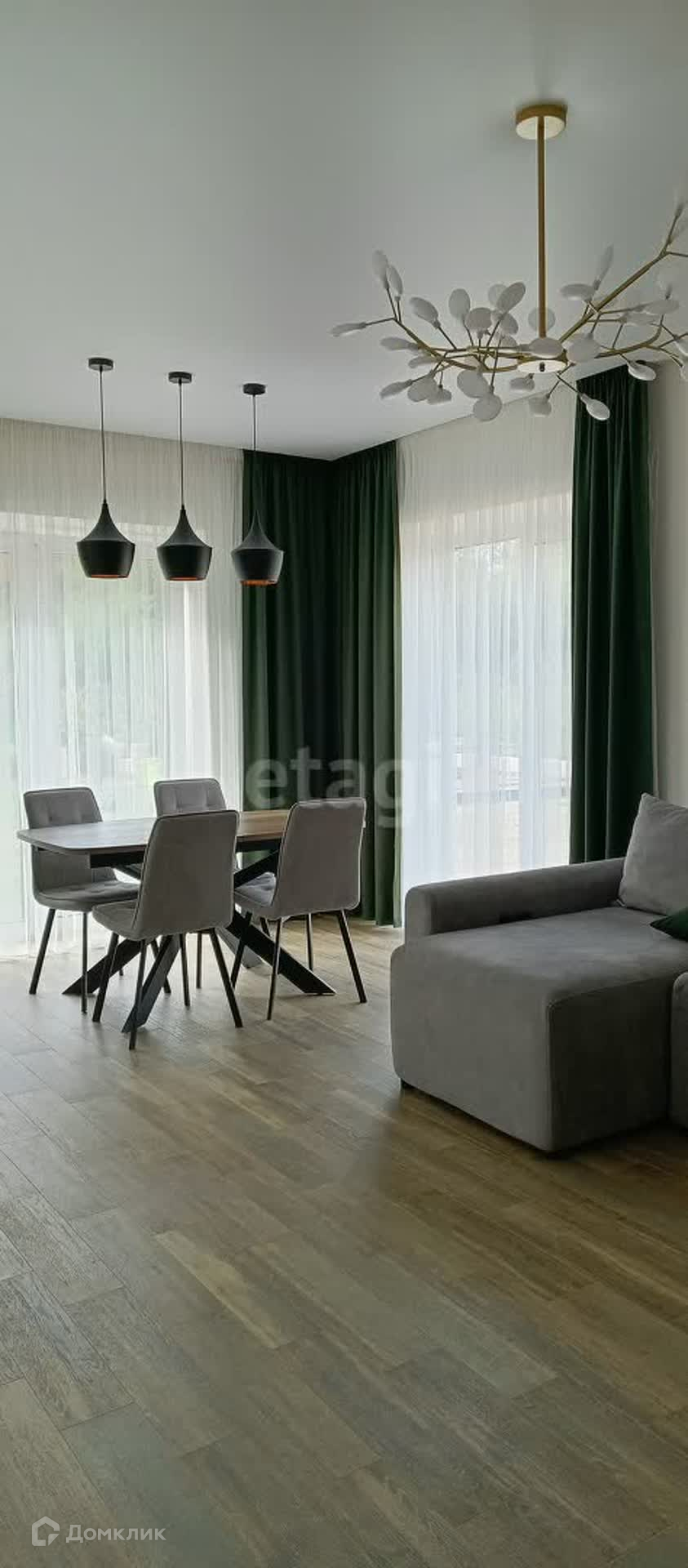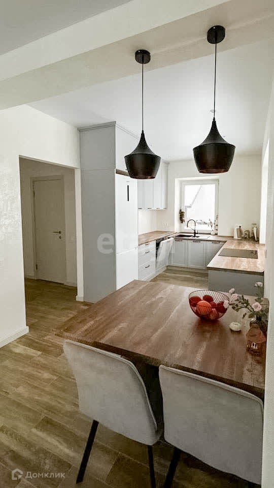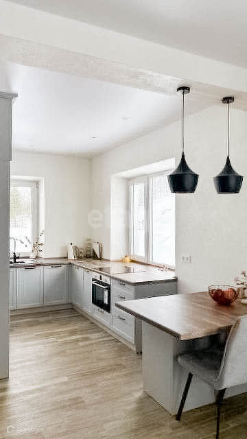 Первый этаж: стены - декоративная штукатурка, пол - керамогранит Еstimа, натяжные потолки матовые,теплый пол по всей площади. Кухонный гарнитур со встроенной бытовой техникой (на гарантии еще), большой диван и столовый уголок.