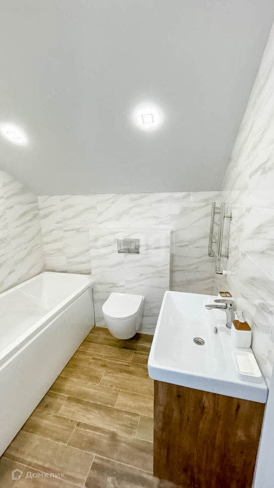 Второй этаж: стены - обои, пол - ламинат. натяжной потолок. Теплый пол в сан узлах.