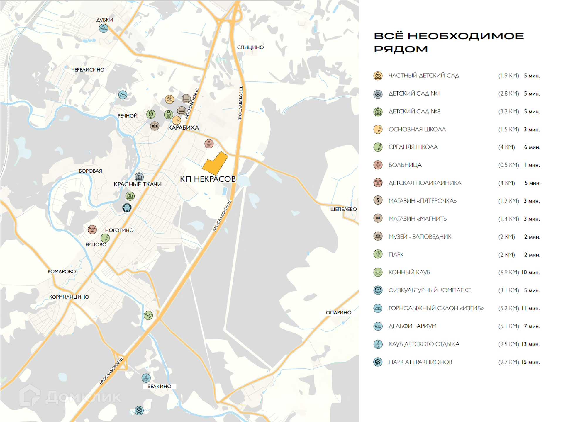 Дом расположен всего в 7 км от города Ярославль, в черте поселения Карабиха, где есть вся необходимая городская инфраструктура для комфортной жизни.