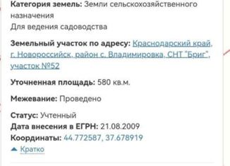 ПРОДАЁТСЯ СОБСТВЕННИКОМ Земельный участок, 5.8 соток. 2 километра от Новороссийска. Участок ровный. В собственности с 2009 года. Расположен в районе села Владировка. Место нахождения можно посмотреть на сайте росреестра по номеру, на фото есть. Категория земли - земли с/х назначения, разрешенное использование - садоводство или огородничество. Оформлен... |