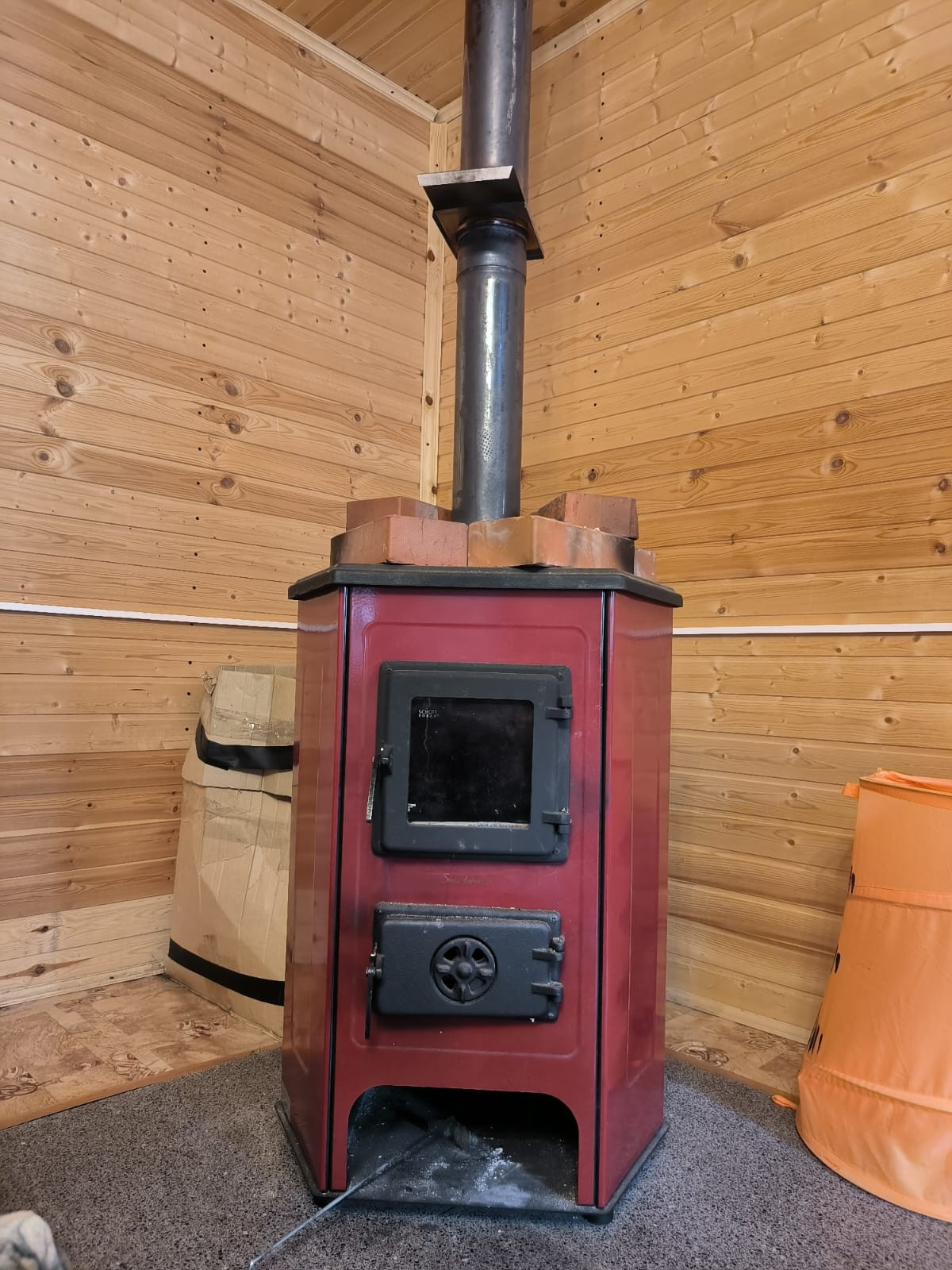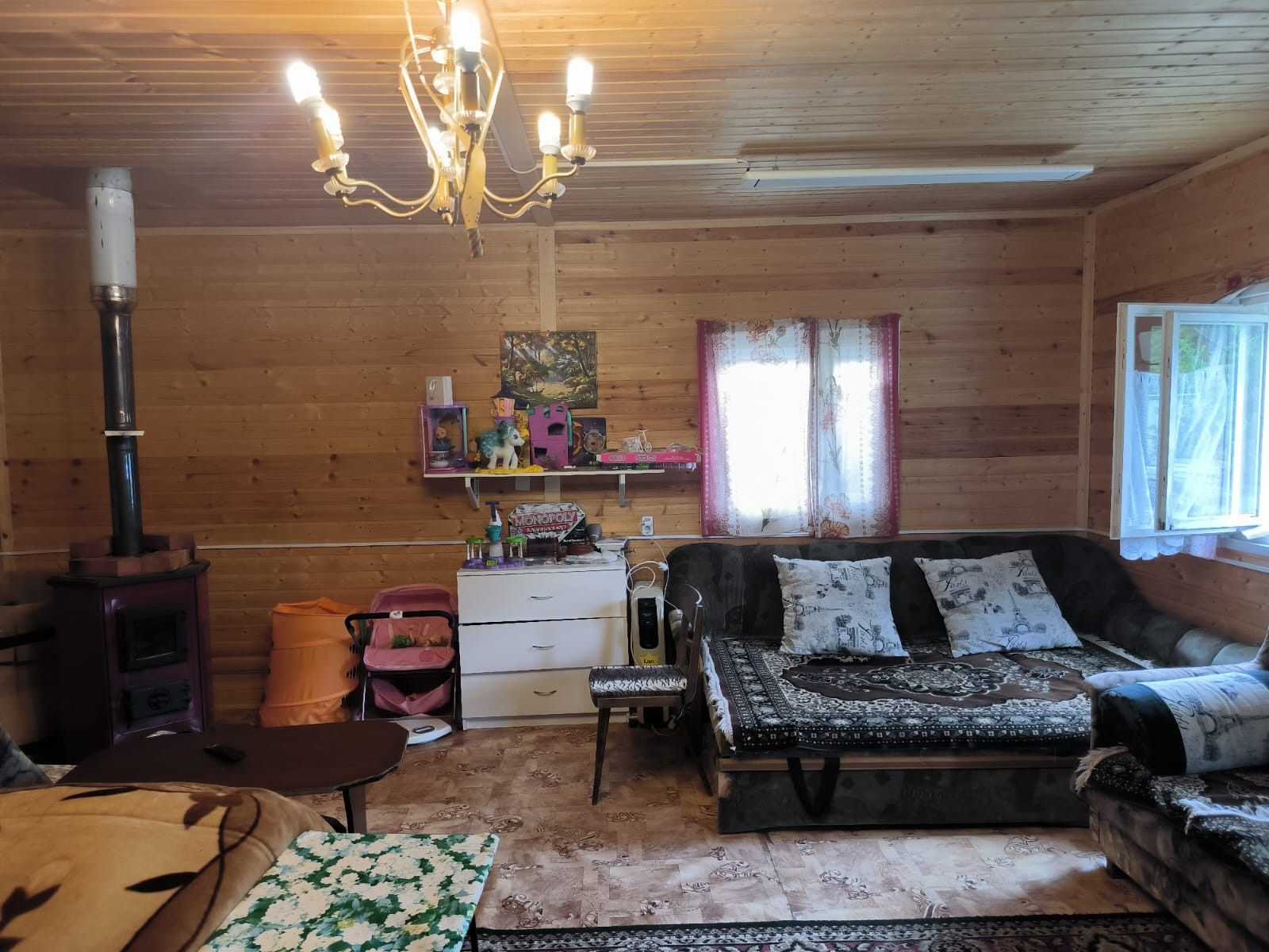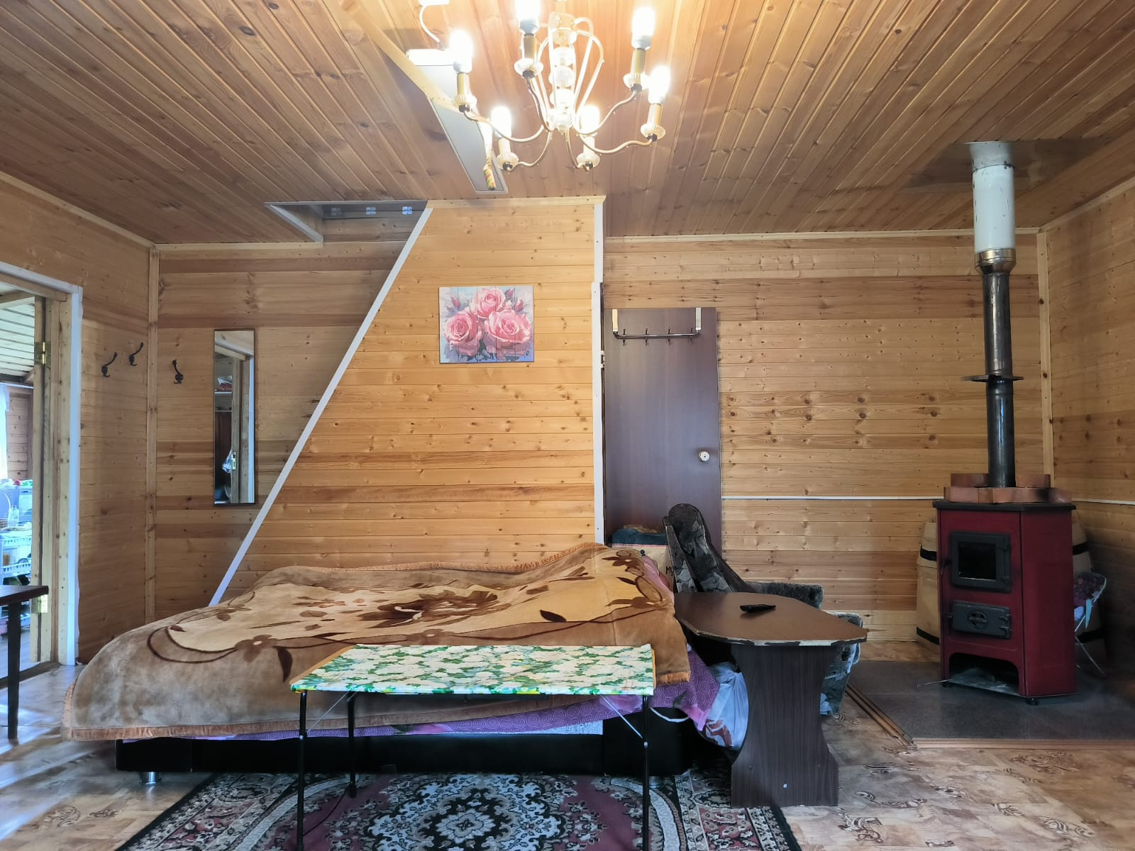 Домик каркасный обшит внутри вагонкой с утеплителем на 100 мм на бетонных сваях, крыша метало-черепица, отапливается печкой, инфракрасные обогреватели.