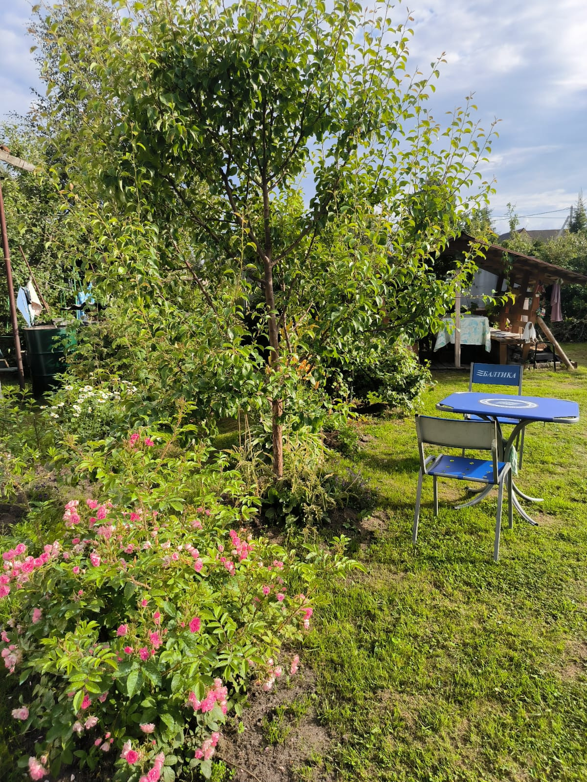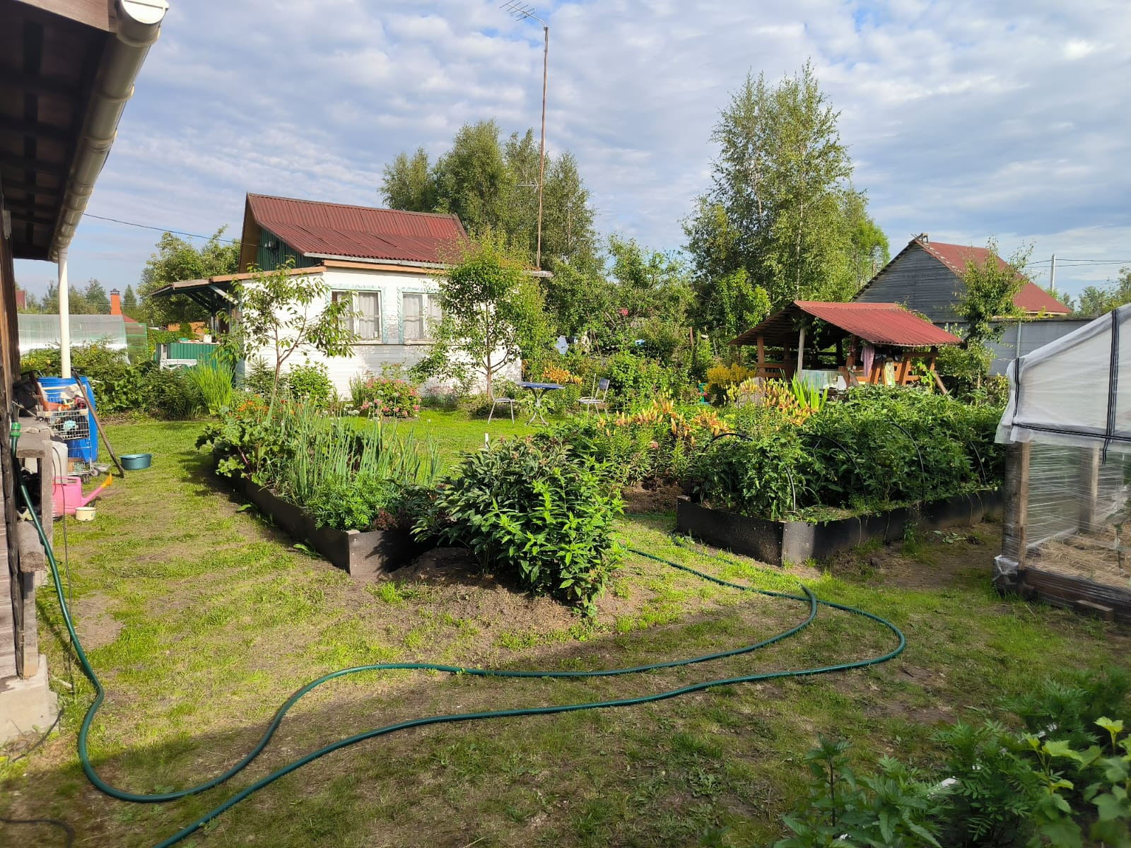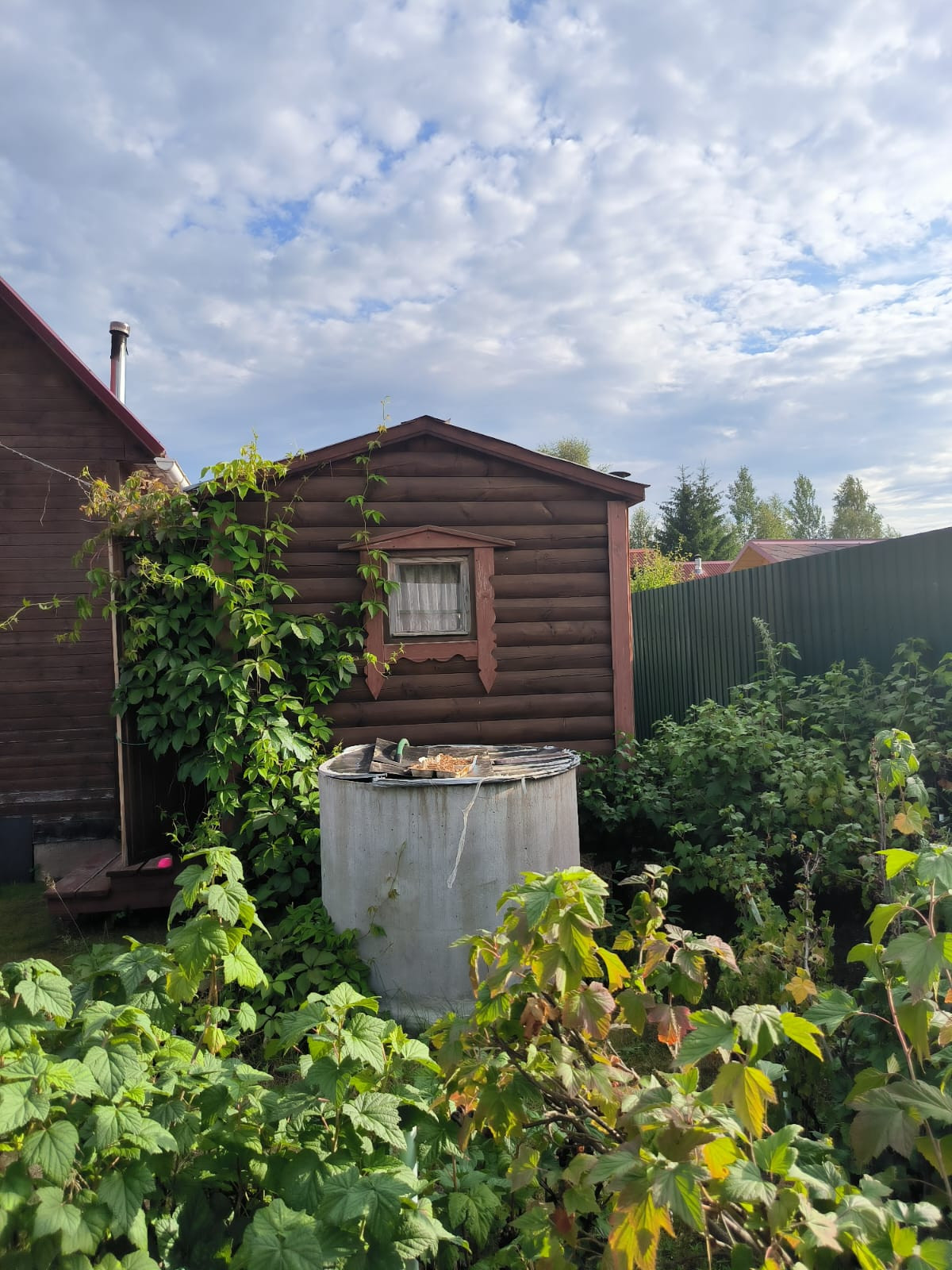 Много посадок,плодовые деревья и ягодные кустарники.Колодец для поливки. Летний душ.