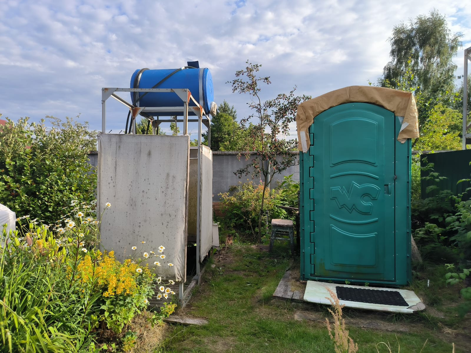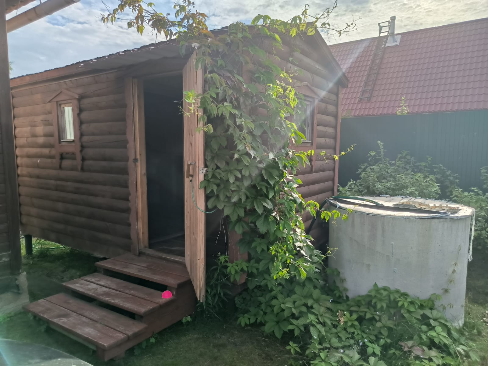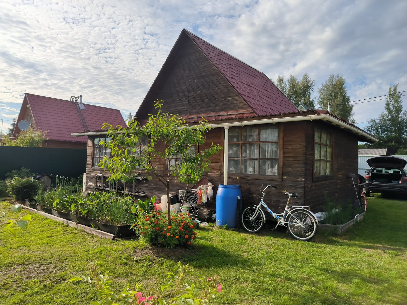 Много посадок,плодовые деревья и ягодные кустарники.Колодец для поливки. Летний душ.