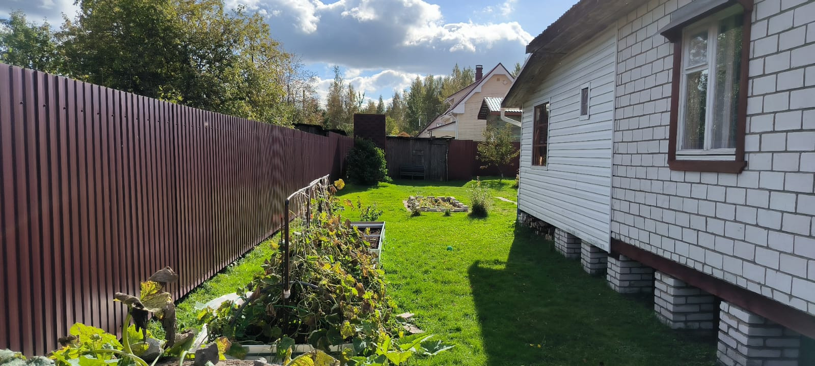Участок 14 соток разработан, огорожен забором из метало-профиля, с калиткой и въездными воротами.