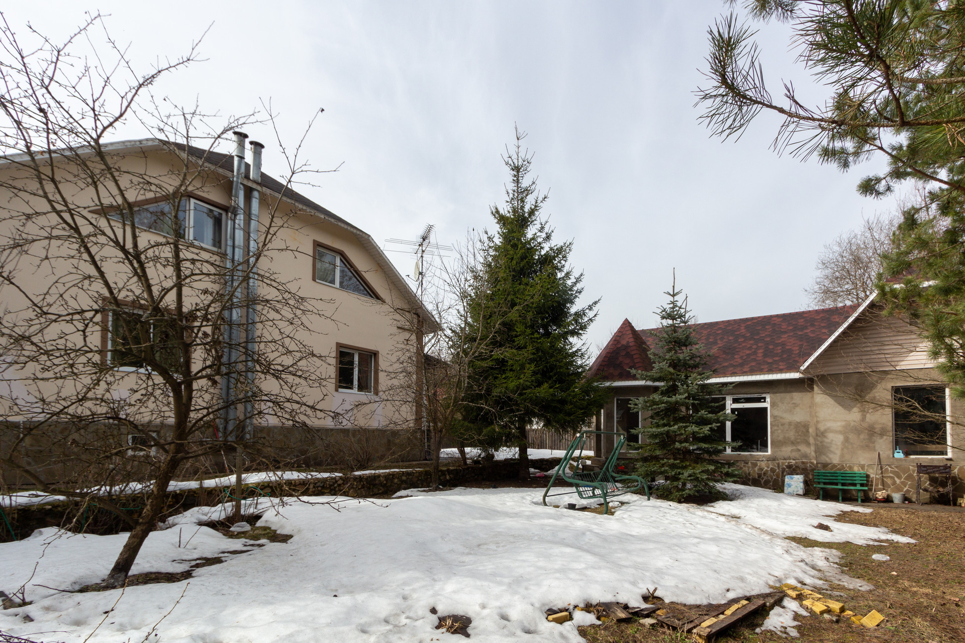 - Рядом с домом сделан ландшафтный дизайн сада с хвойными деревьями
