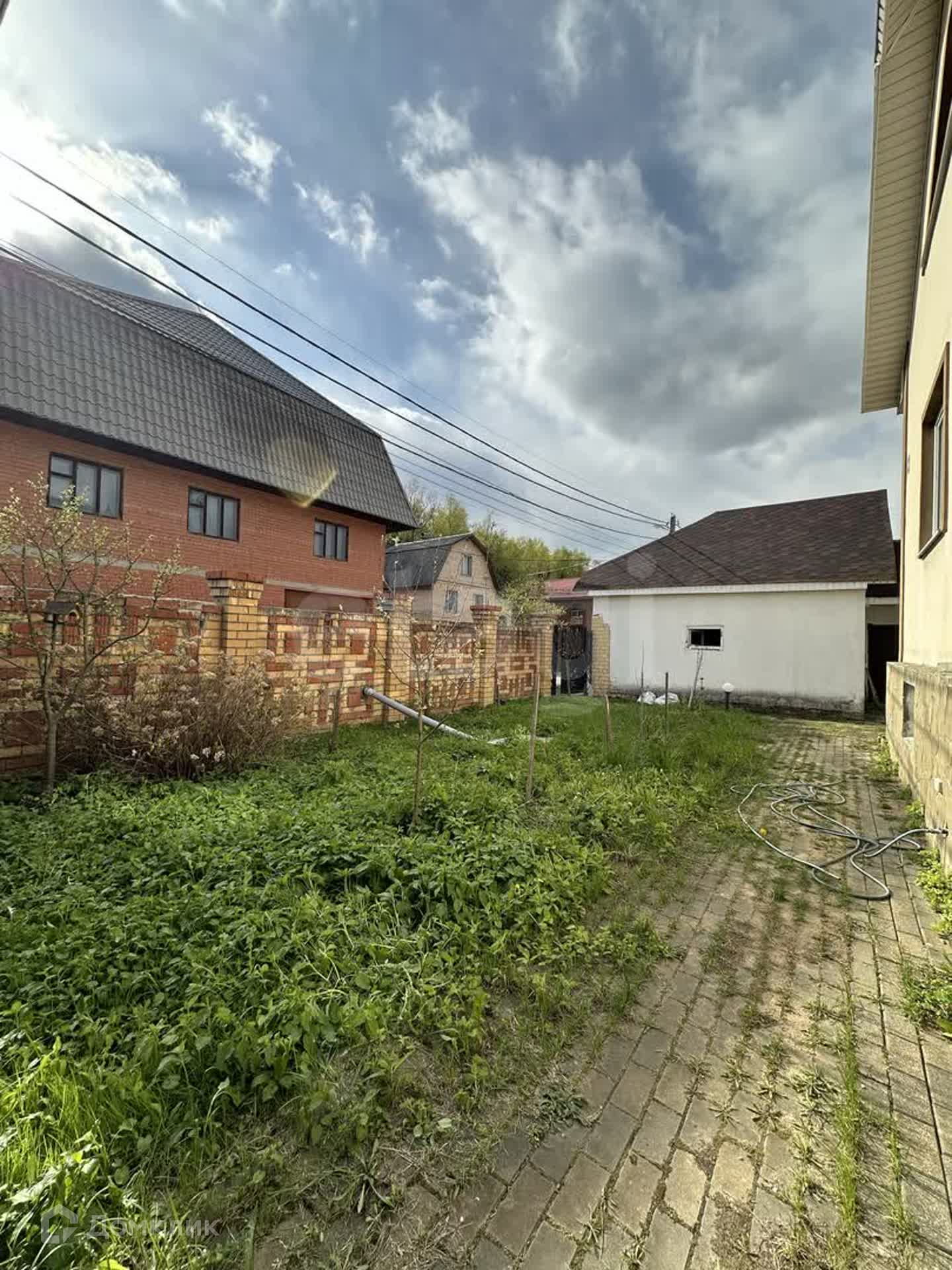 Забор кирпичный на фундаменте. Есть уличный навес для машин.
