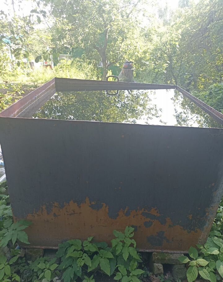На участке есть большая металлическая беседка со столом и двумя скамейками. Так же имеется большая емкость для воды.