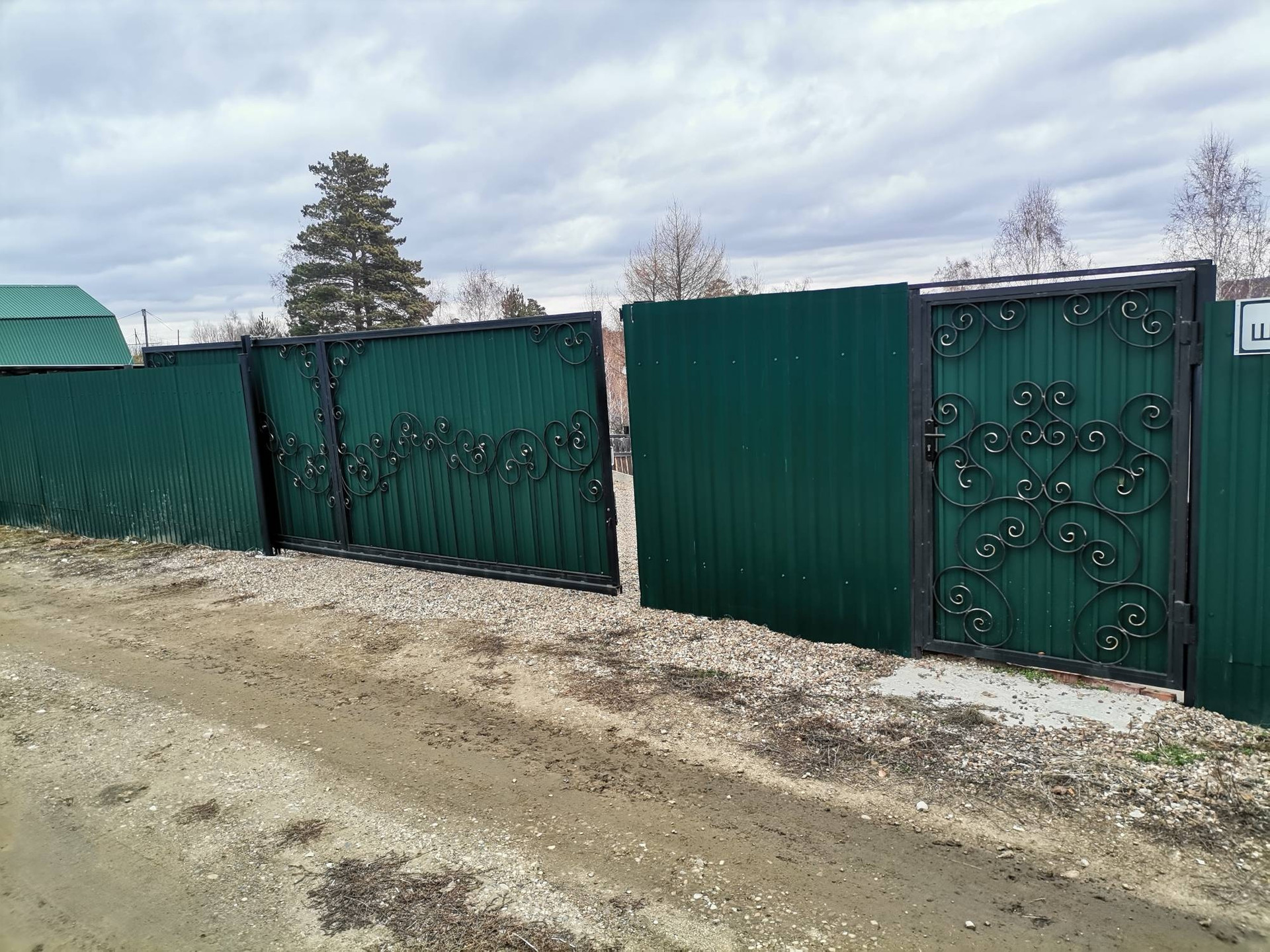 Участок огорожен забором из проф листа двухсторонней окраски со стороны улицы, ворота откатные украшены ковкой.
