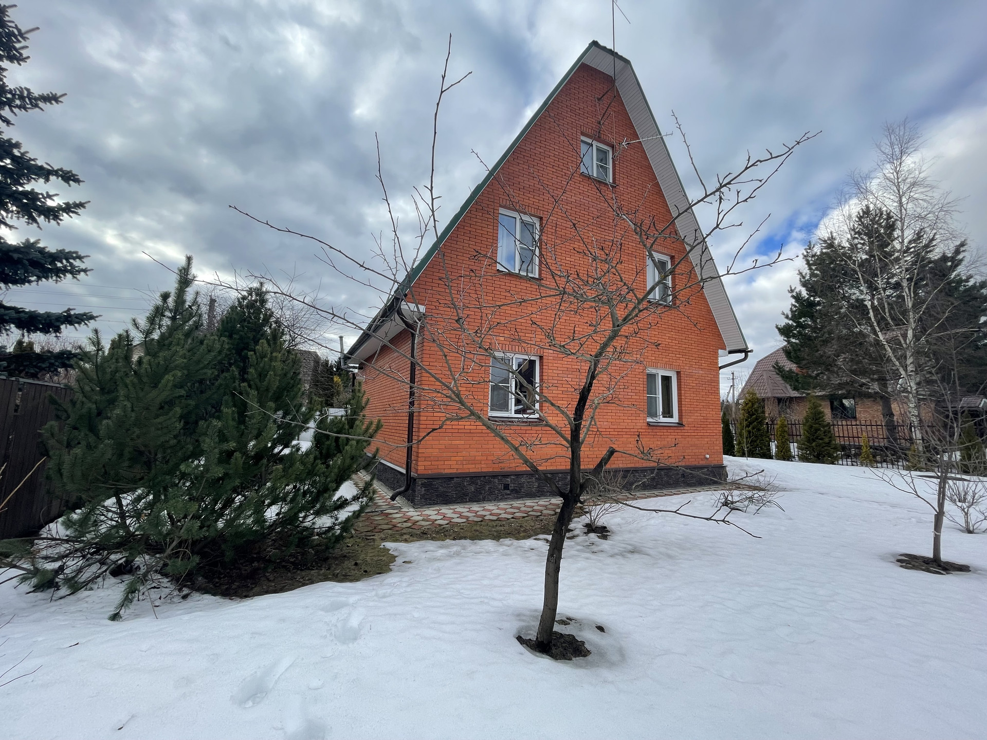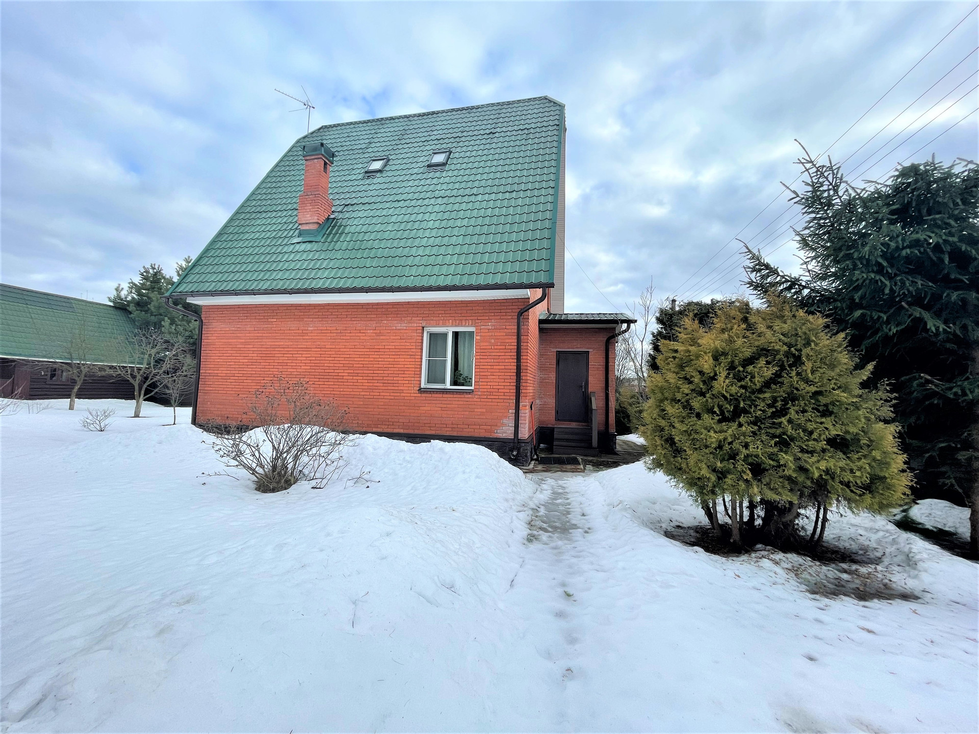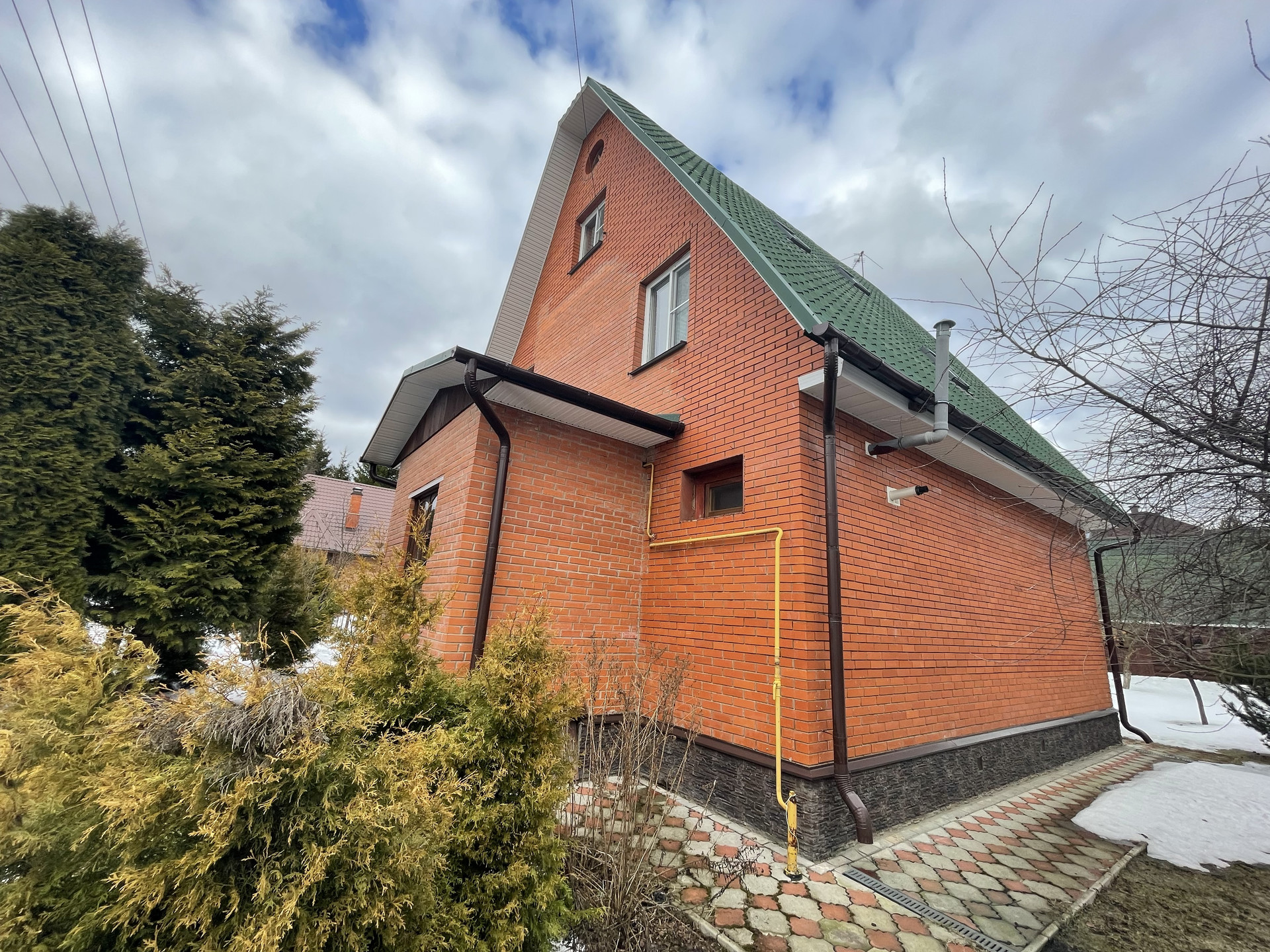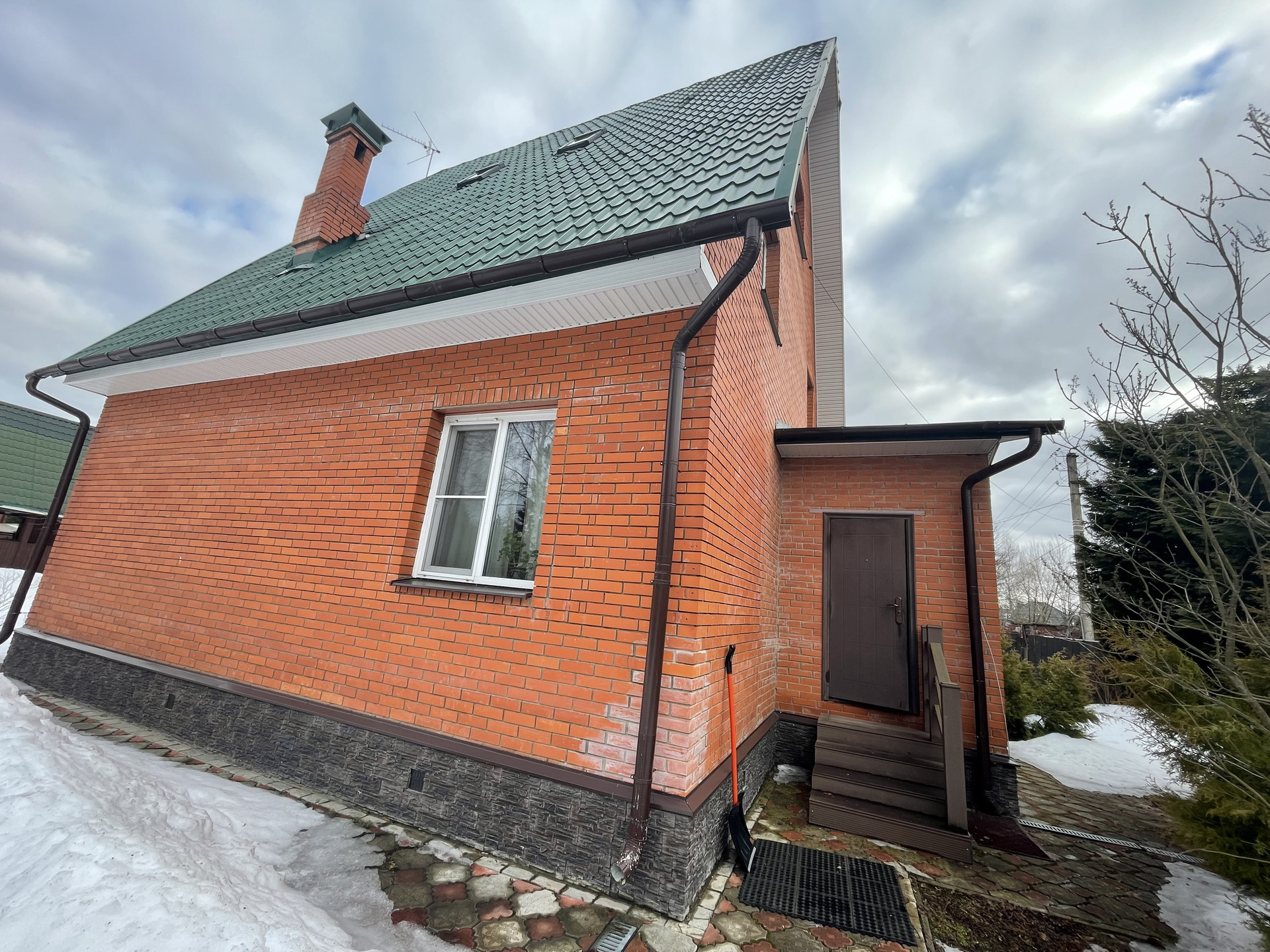 Материал стен дома – брус 200 мм, фасад из кирпича. Внутренняя отделка вагонкой.