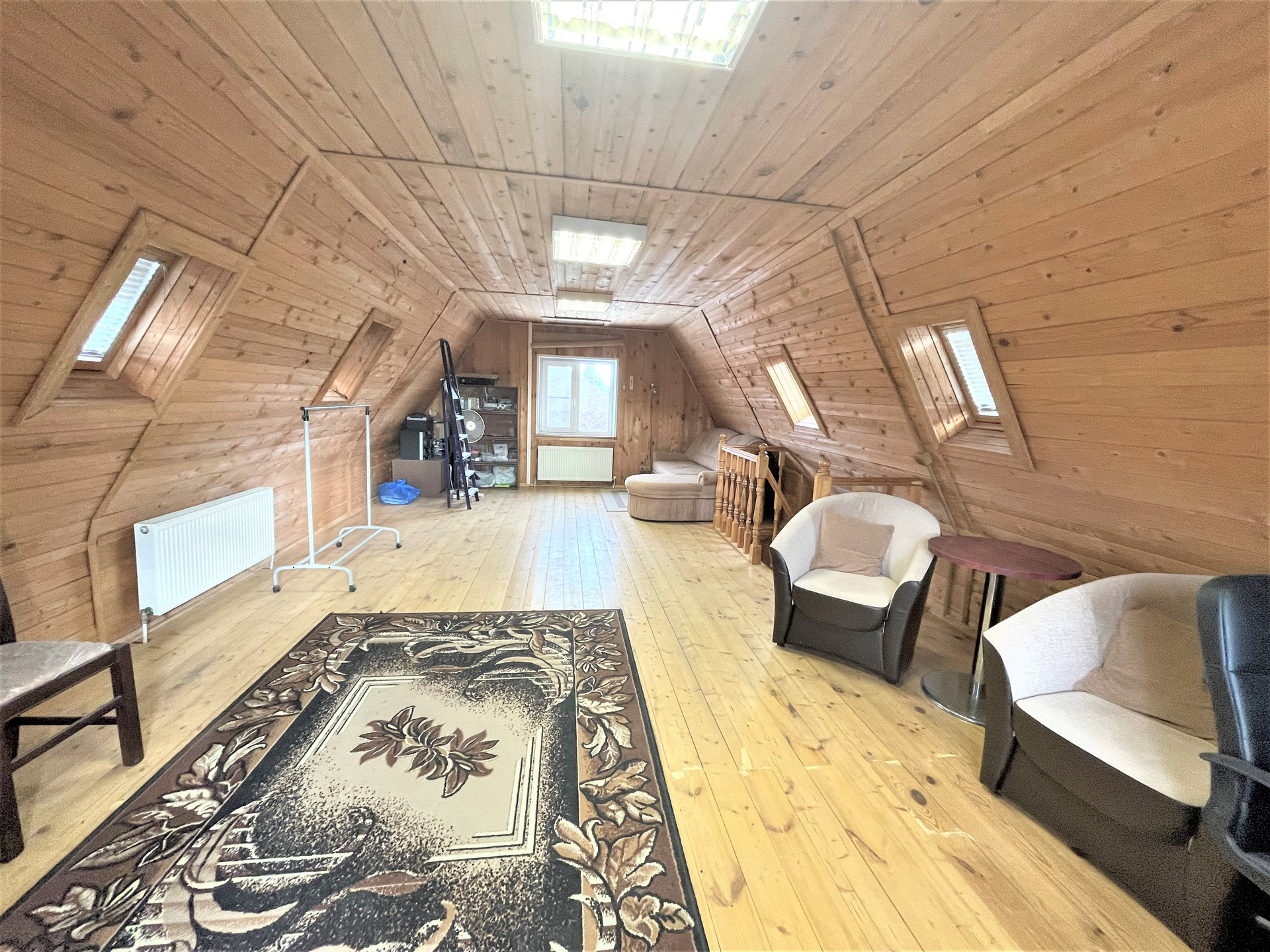 На первом этаже расположена гостиная с камином, кухня, спальня, прихожая, холл, сан.узел, бойлерная. Высокие потолки
