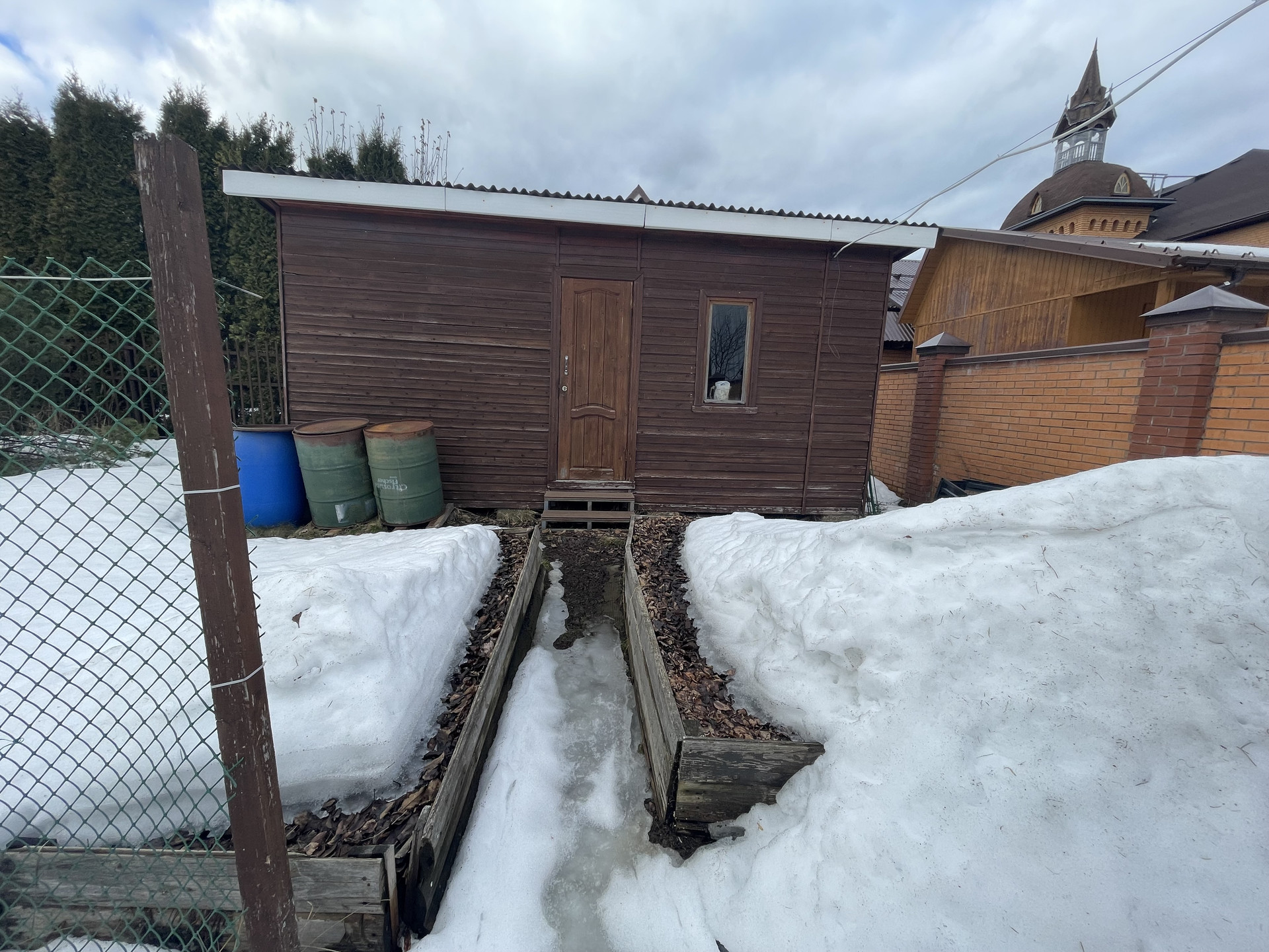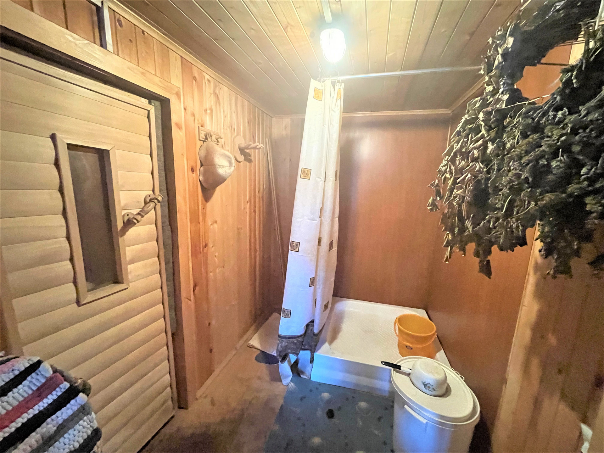 Двухэтажная баня 4х6 из бревна с большой парилкой и мансардным этажом. Сарай для хранения инвентаря.