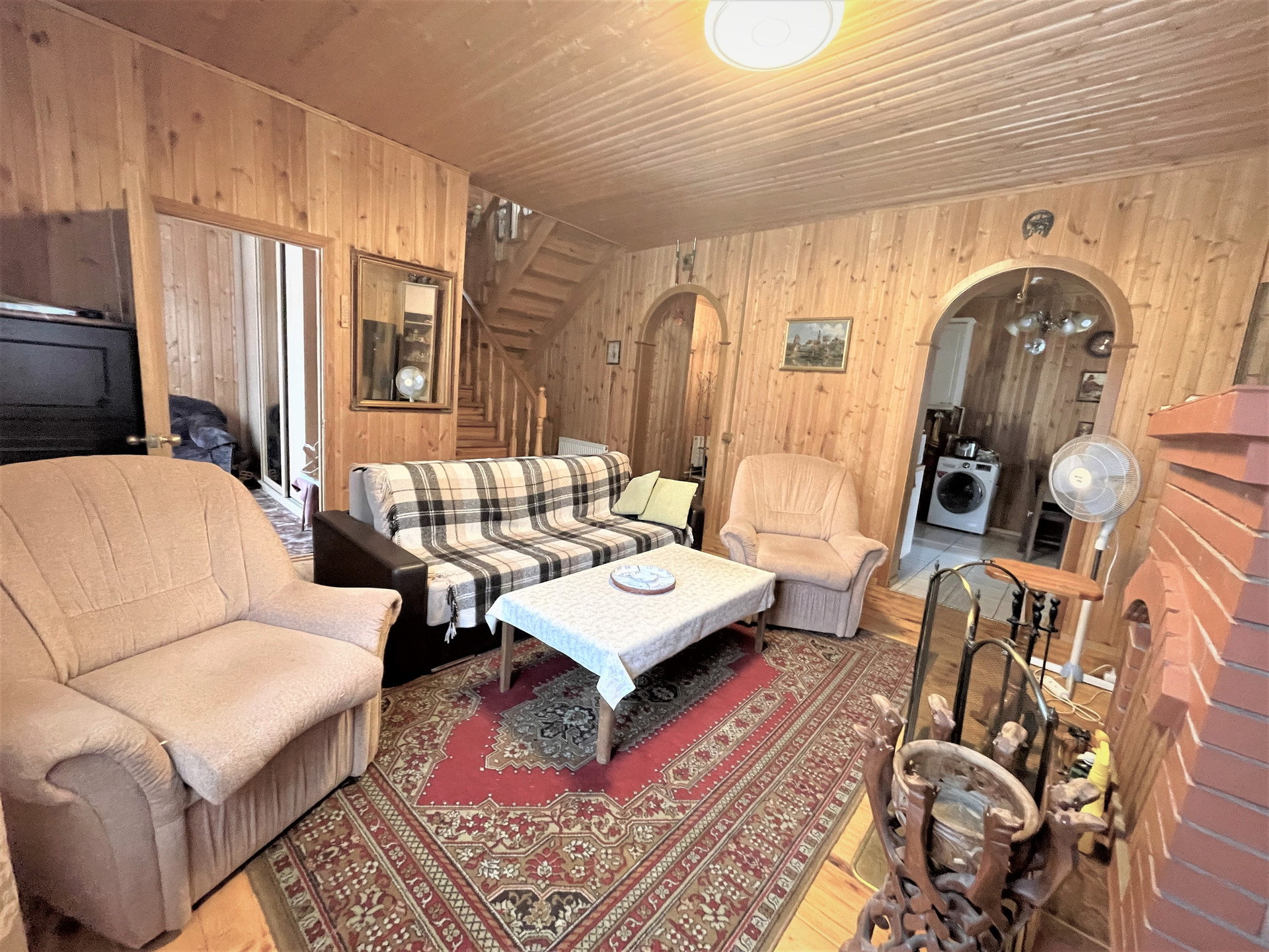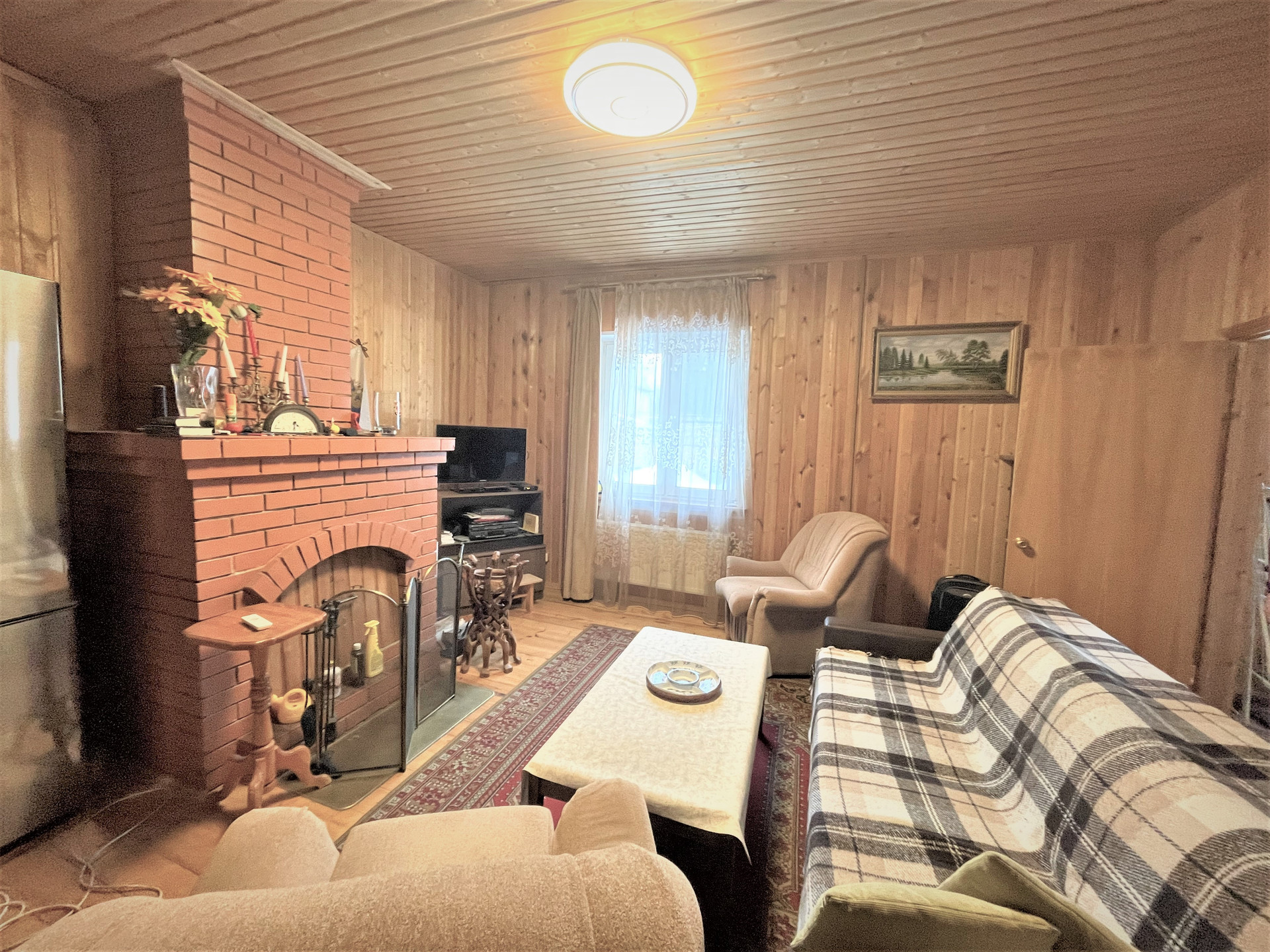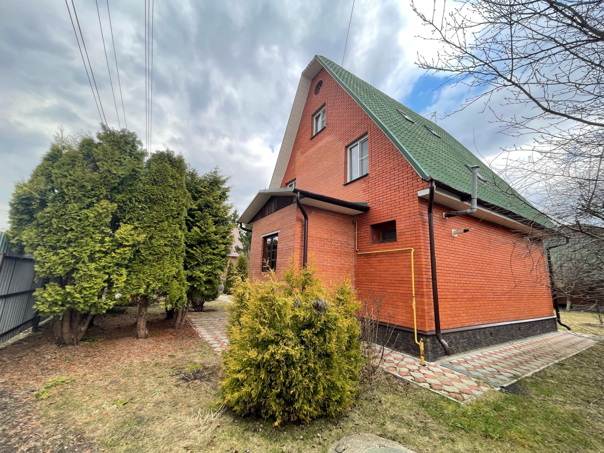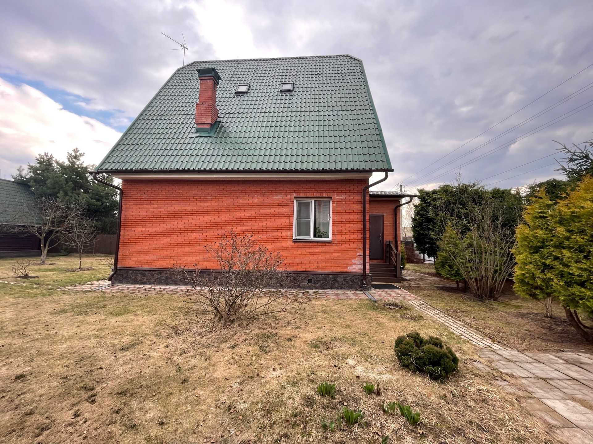 Материал стен дома – брус 200 мм, фасад из кирпича. Внутренняя отделка вагонкой.