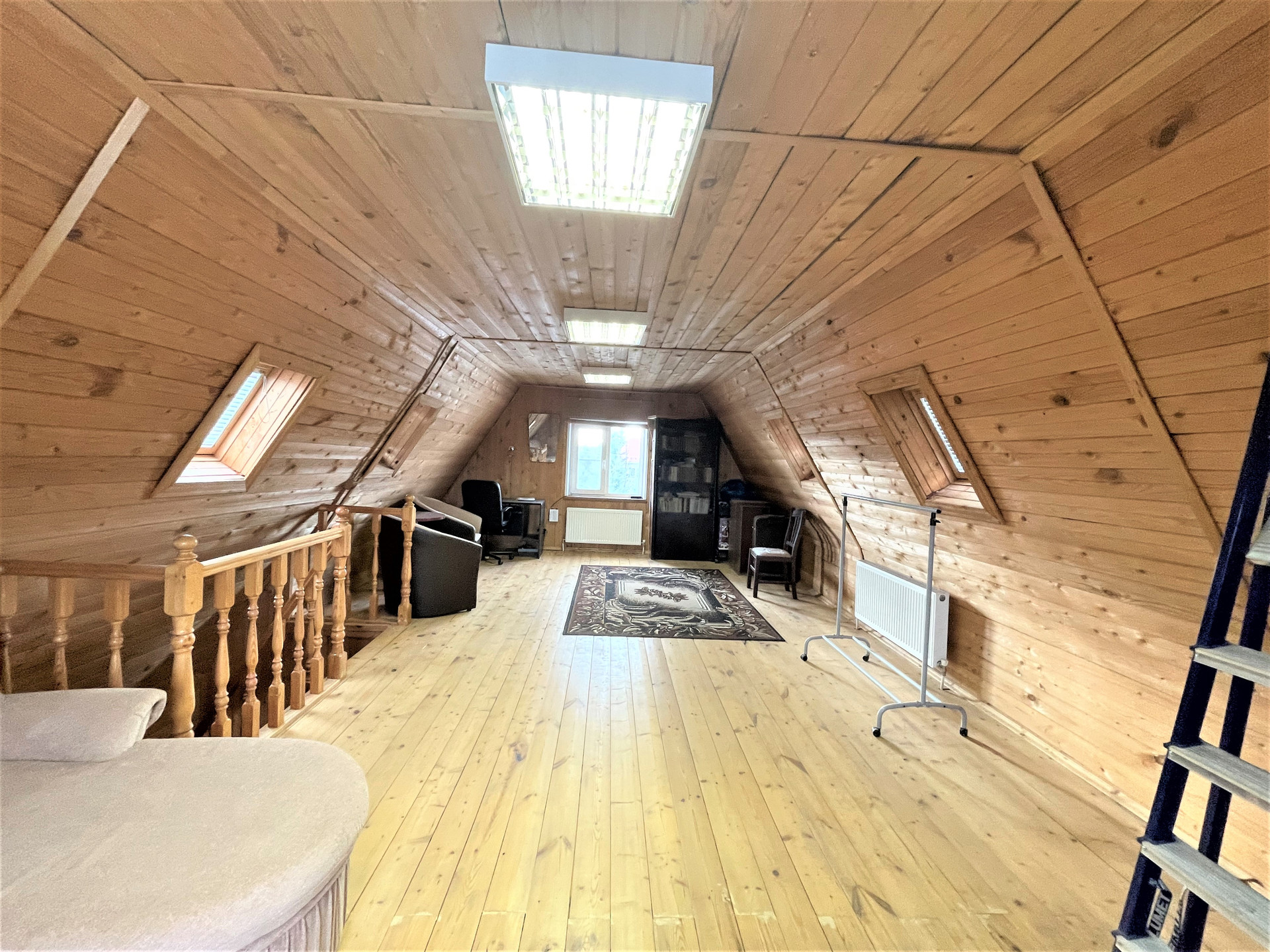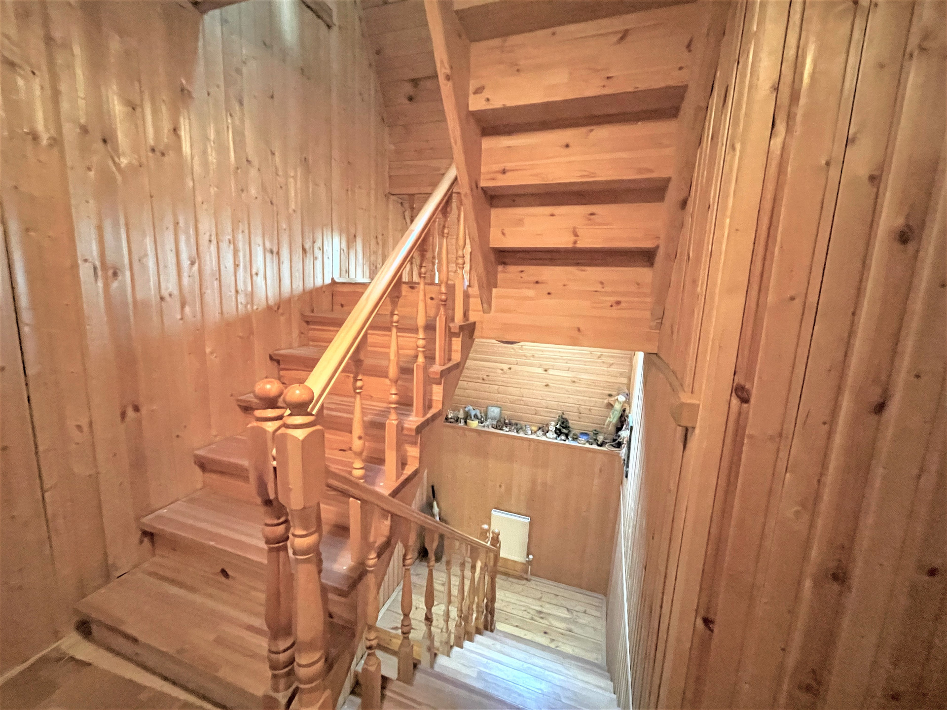 На первом этаже расположена гостиная с камином, кухня, спальня, прихожая, холл, сан.узел, бойлерная. Высокие потолки