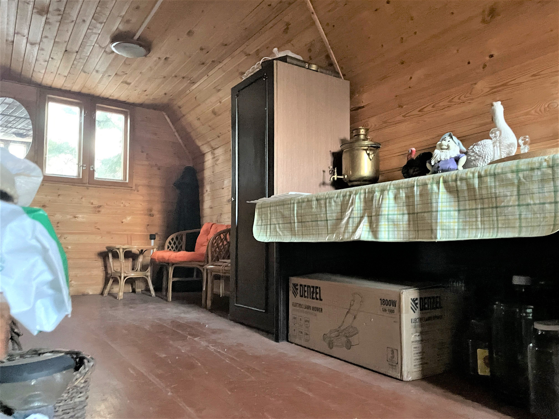 Двухэтажная баня 4х6 из бревна с большой парилкой и мансардным этажом. Сарай для хранения инвентаря.
