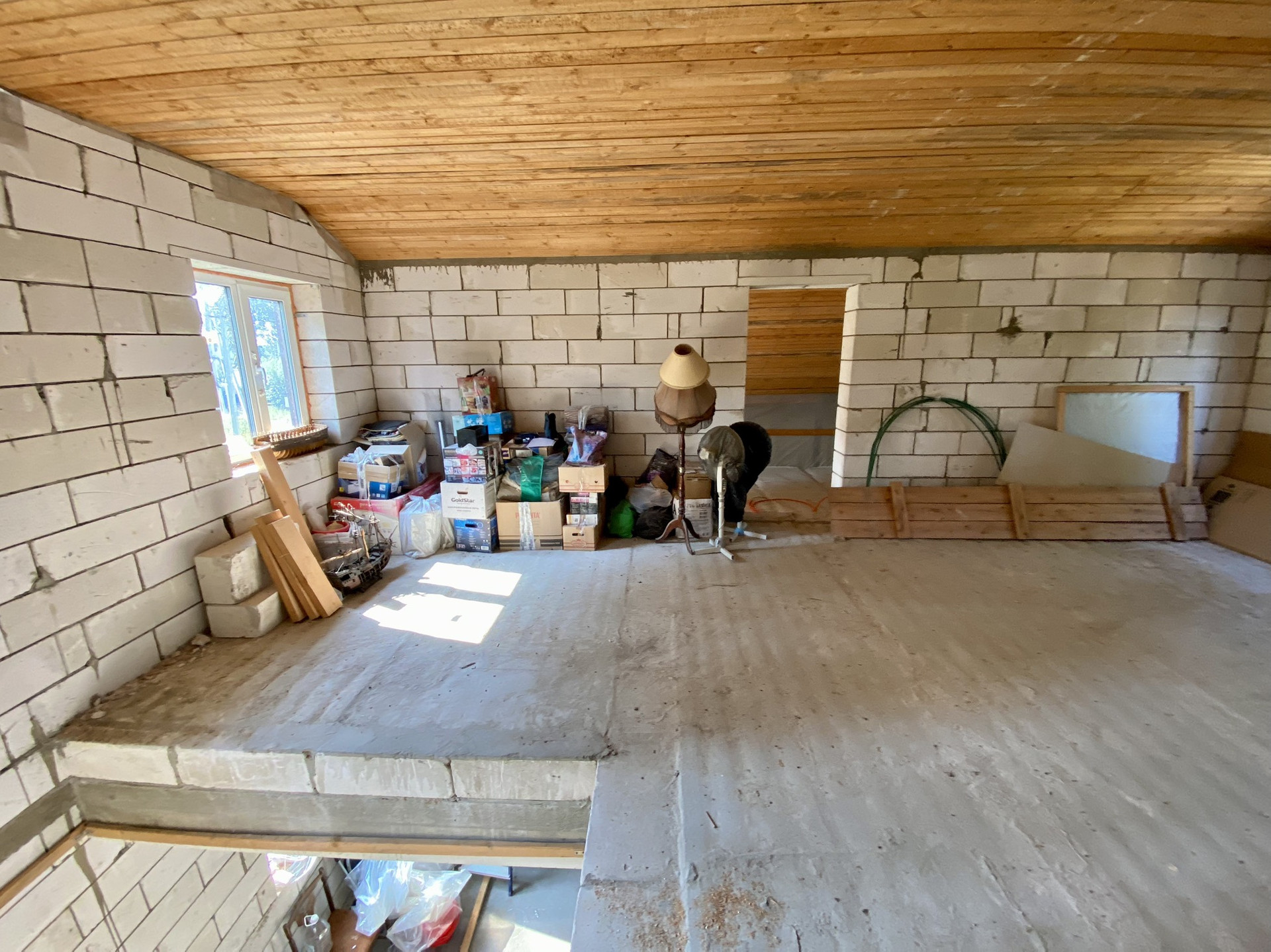 На цокольном этаже расположена бойлерная я с котлом «Китурами» на пеллетах (не подключен), сан узел, кладовая, комната с баком для воды (вода- свой колодец заведен в дом по зимнему). 1-й этаж: просторная прихожая –веранда, зал-гостинная, На 2-м этаже: не разделенное пространство, можно сделать по собственному желанию.