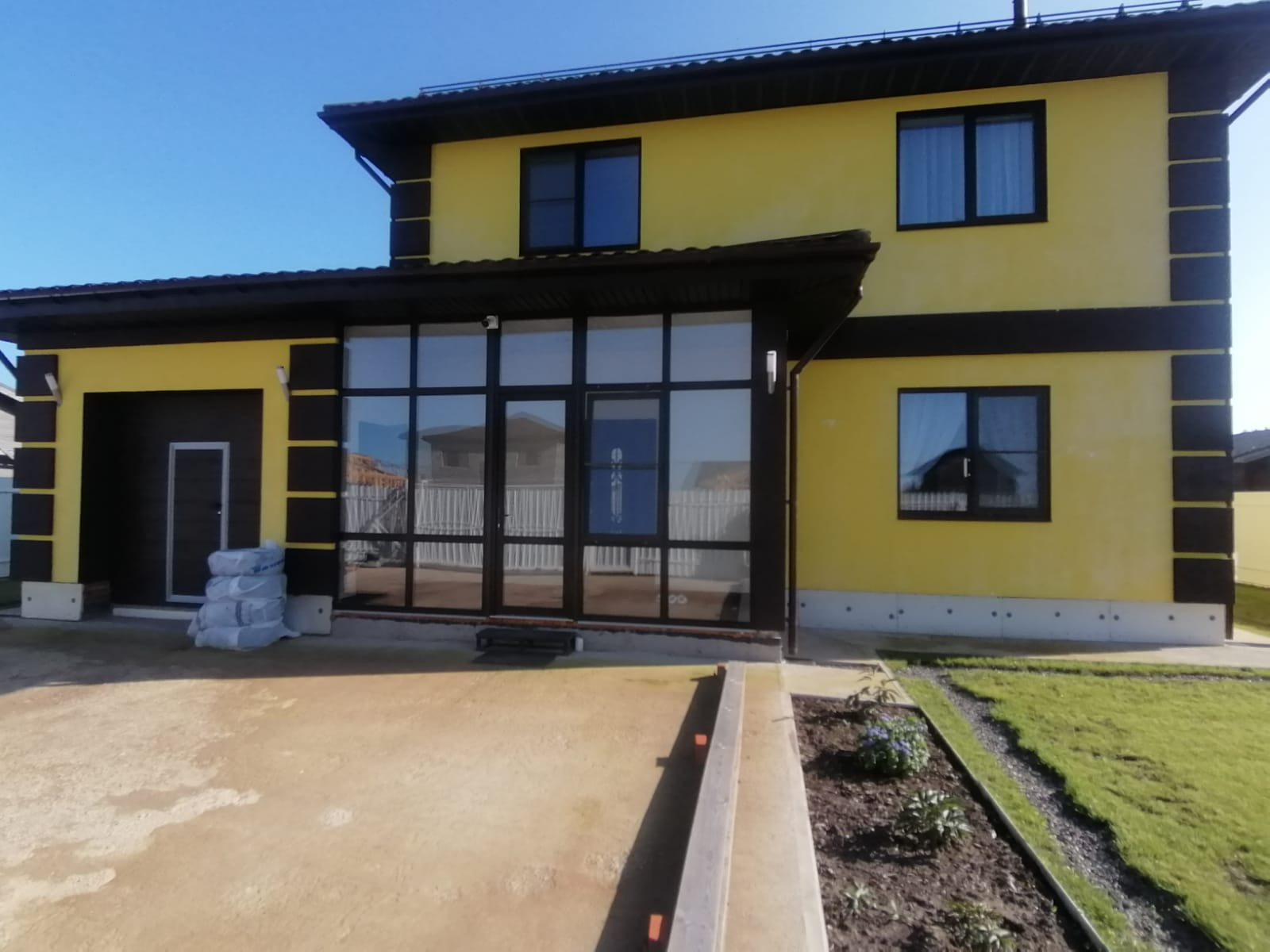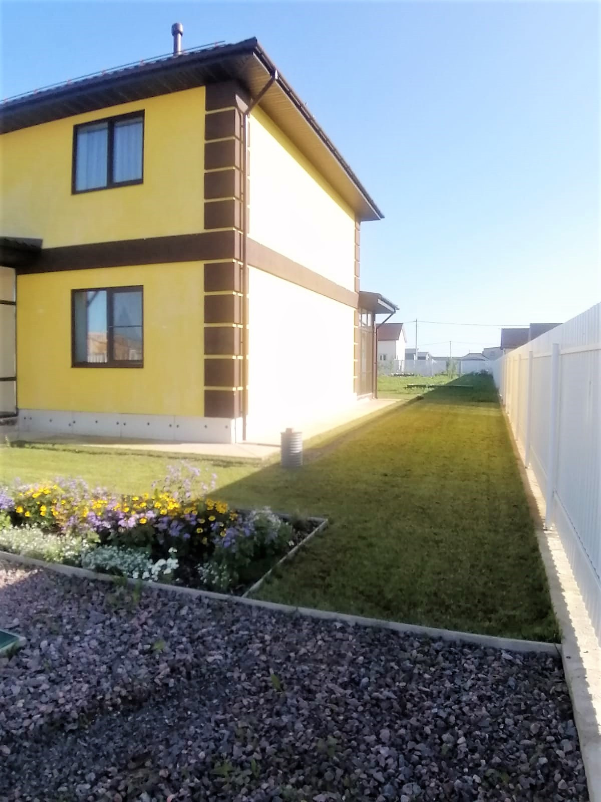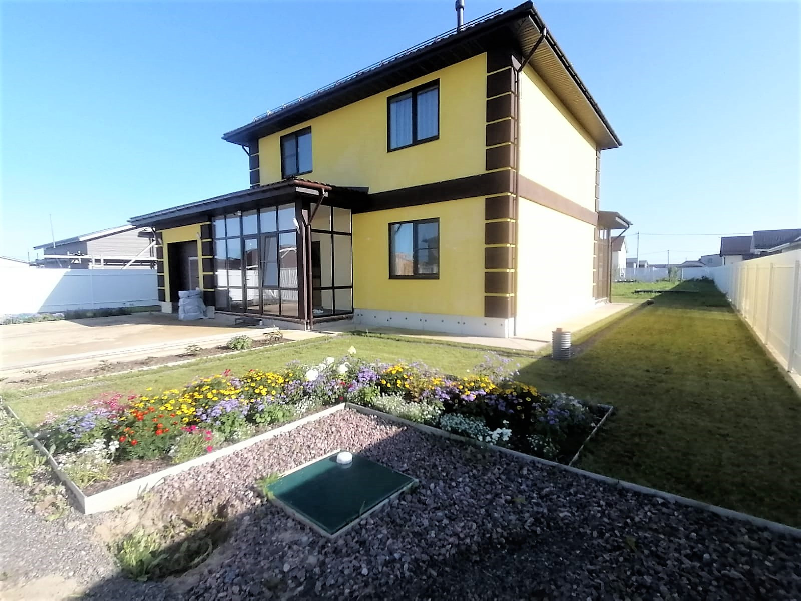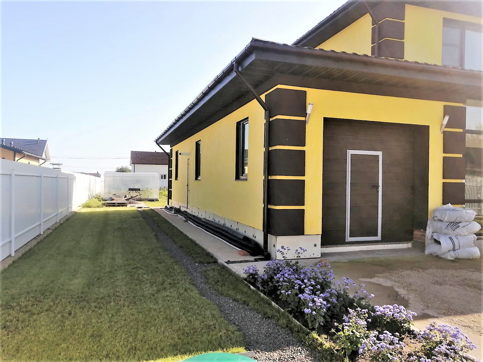 Подготовлено основание для укладки тротуарной плитки на въезде, парковке и вокруг дома.
