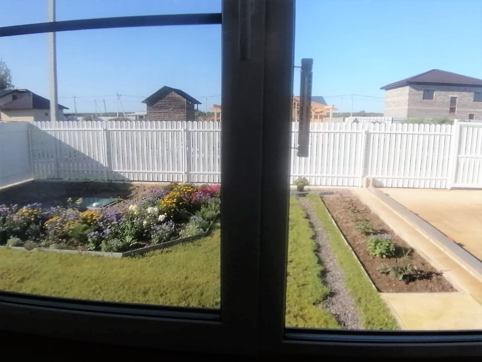 Забор на бетонной ленте, установлен евроштакетник на въездных сторонах, на границах с соседями - проф. лист.