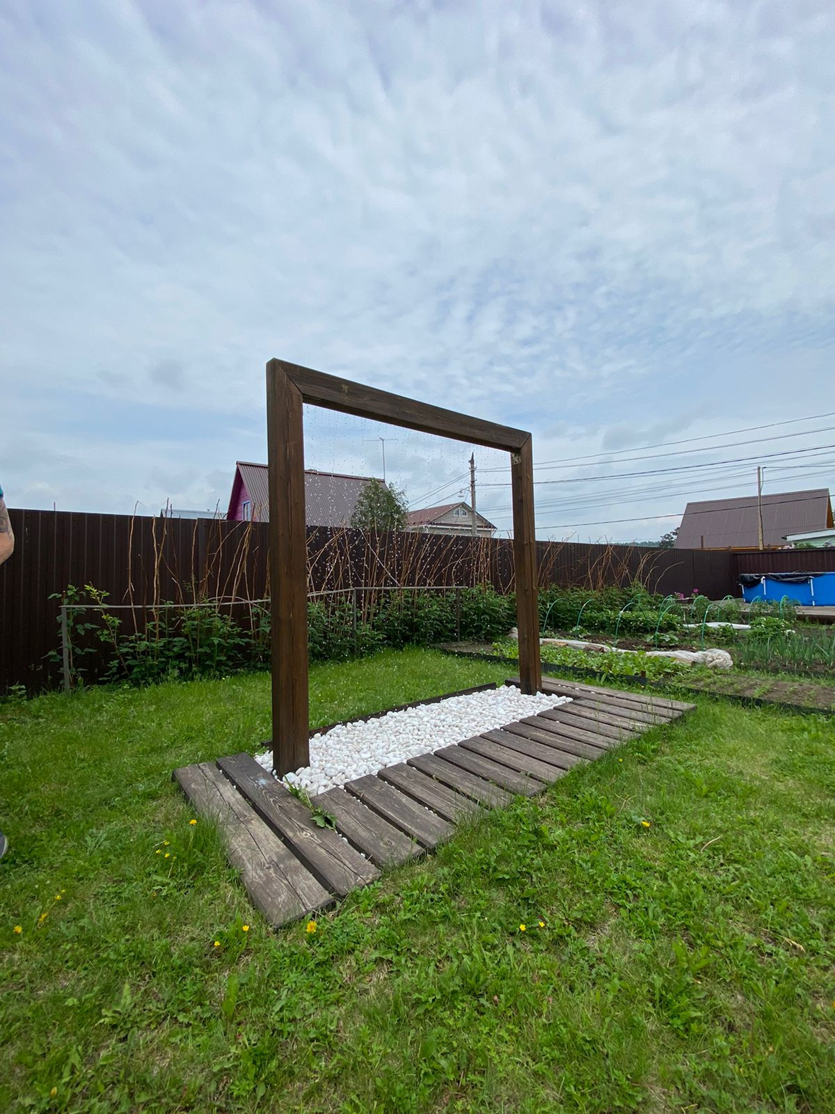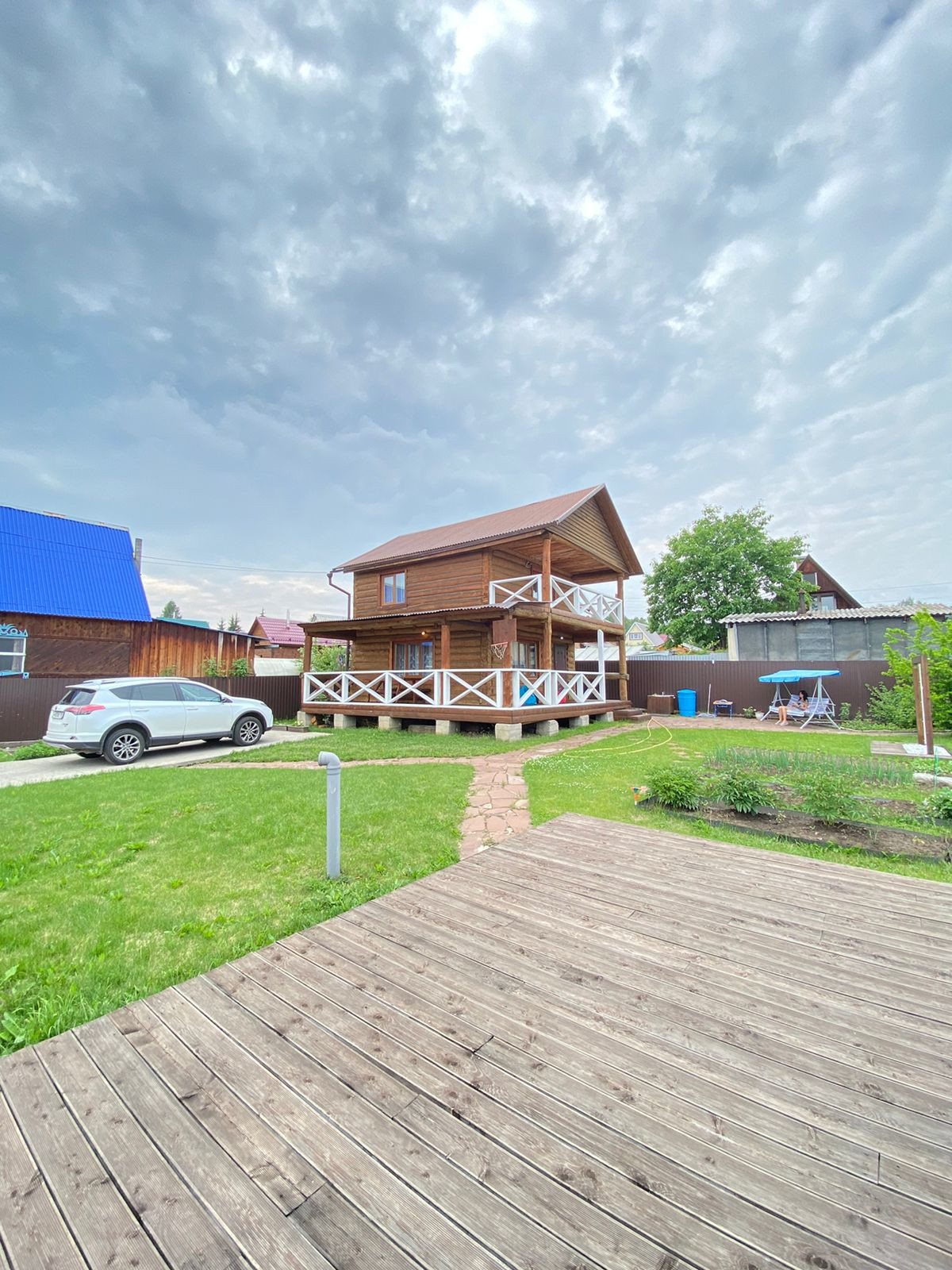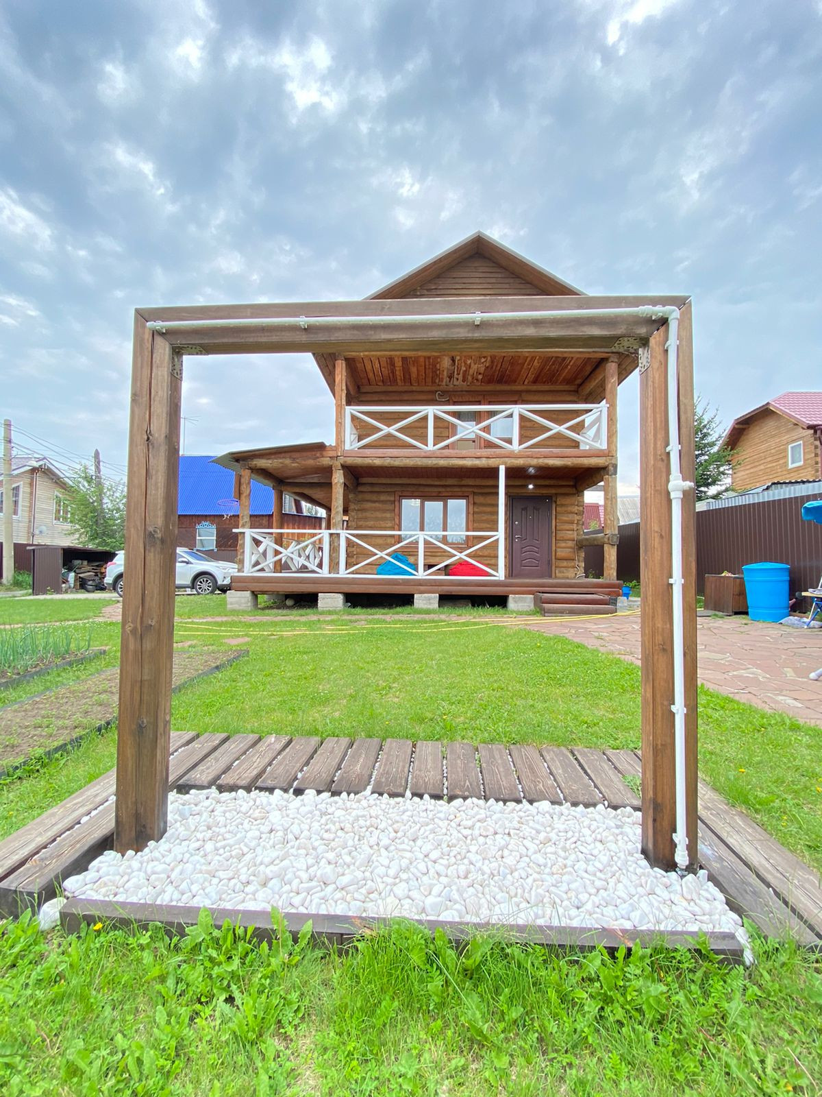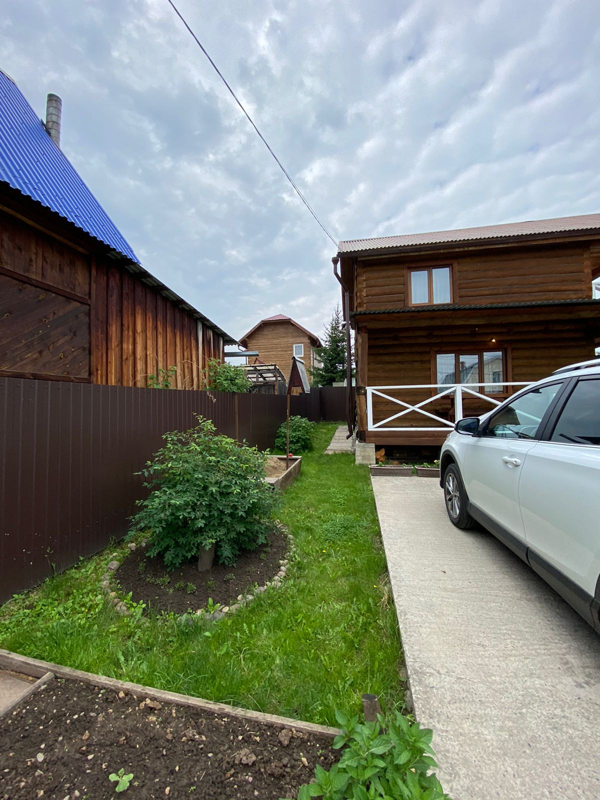 На территории установлен дизайнерский душ, грядки, деревья, все укрыто газоном, откатные ворота, парковочное место на 2 авто.