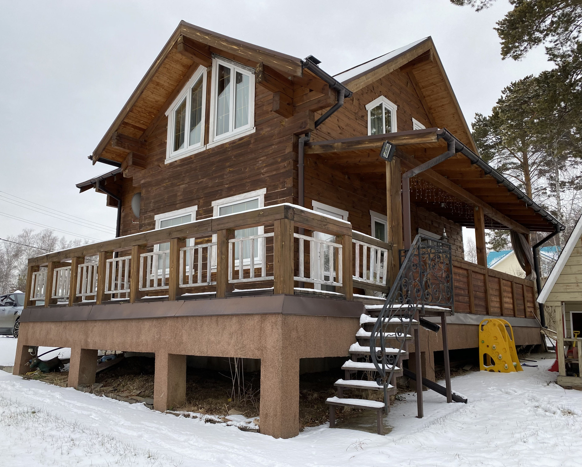 Дом из бруса 18х18, с большой открытой террасой. Фундамент ленточный. Крыша – мягкая кровля.