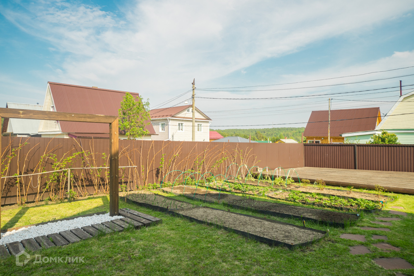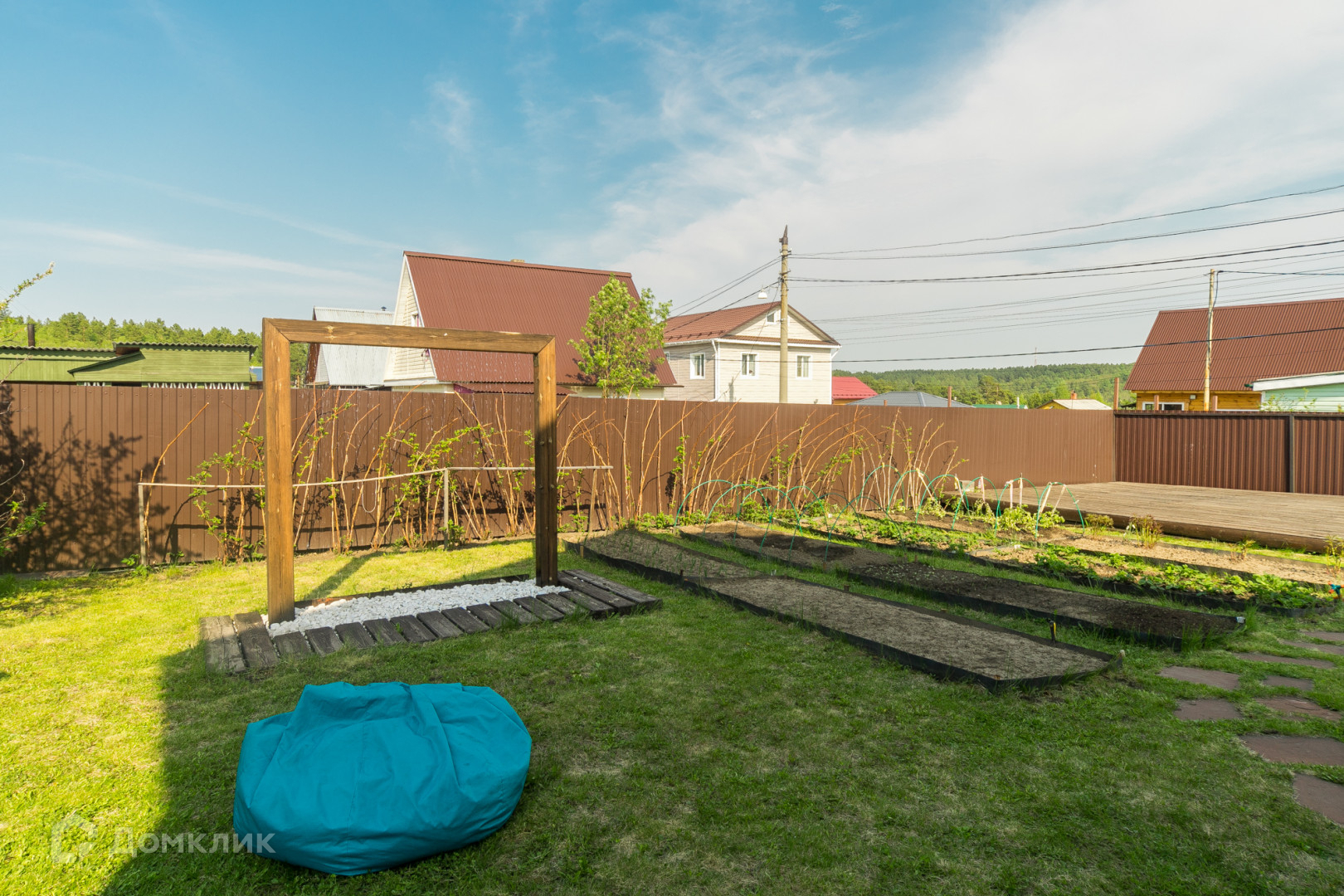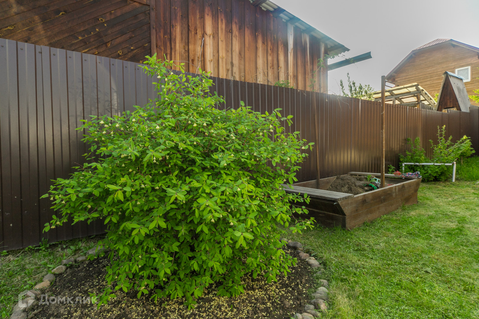 Общая площадь участка составляет 5 соток. Участок ровной формы, ухоженный, огорожен забором из металлопрофиля., установлены откатные ворота. Установлена площадка под каркасный бассейн.