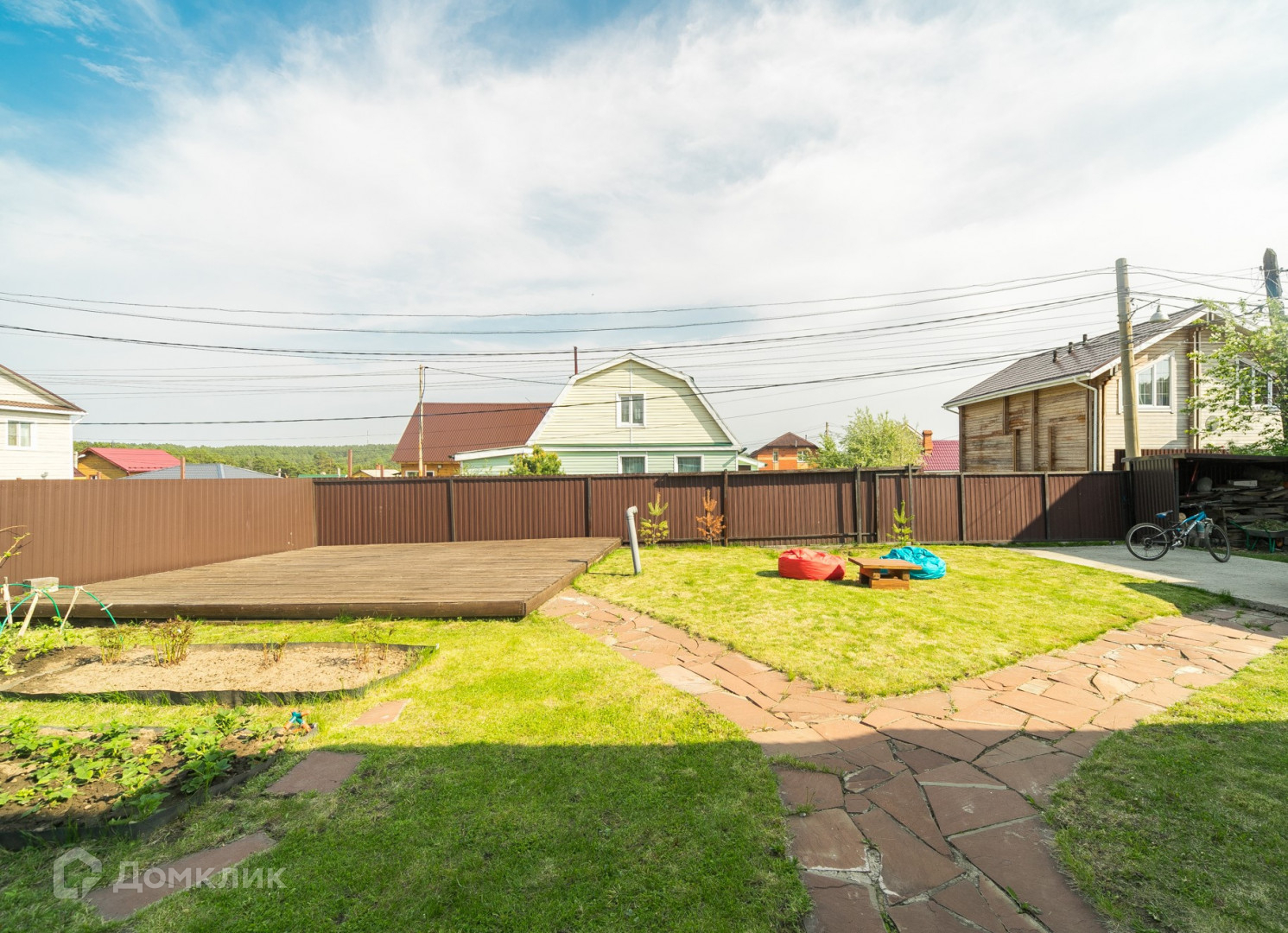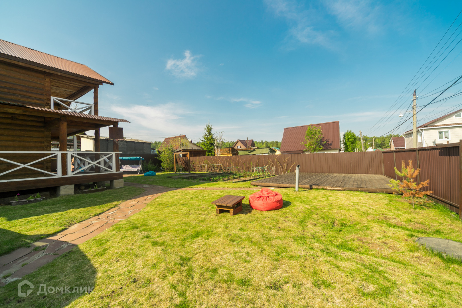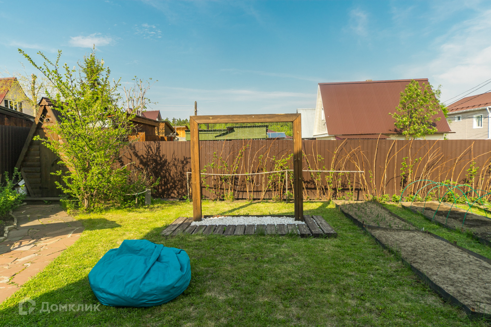 Общая площадь участка составляет 5 соток. Участок ровной формы, ухоженный, огорожен забором из металлопрофиля., установлены откатные ворота. Установлена площадка под каркасный бассейн.