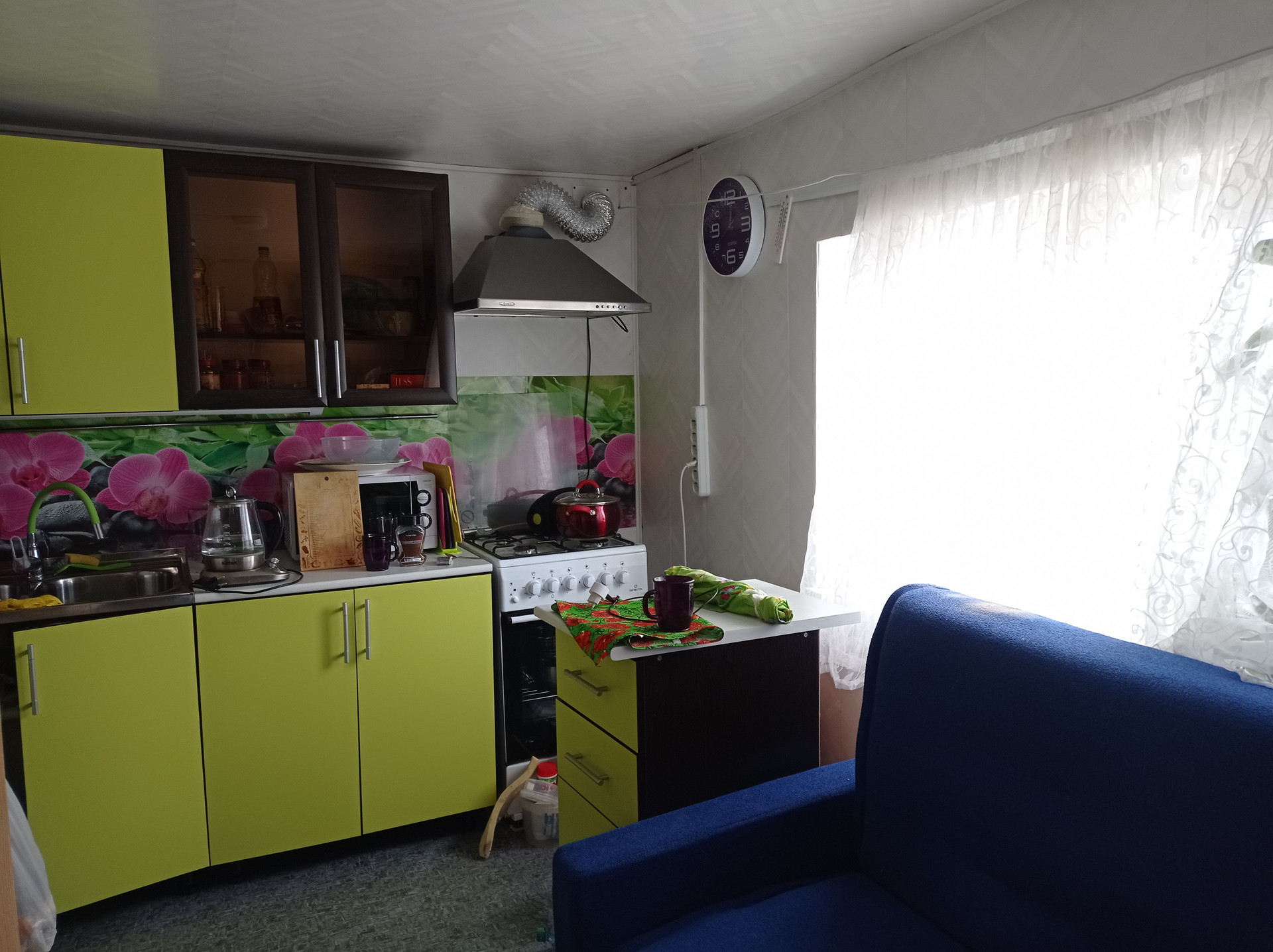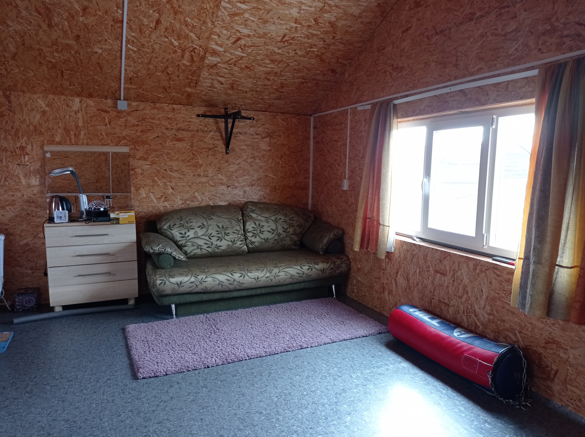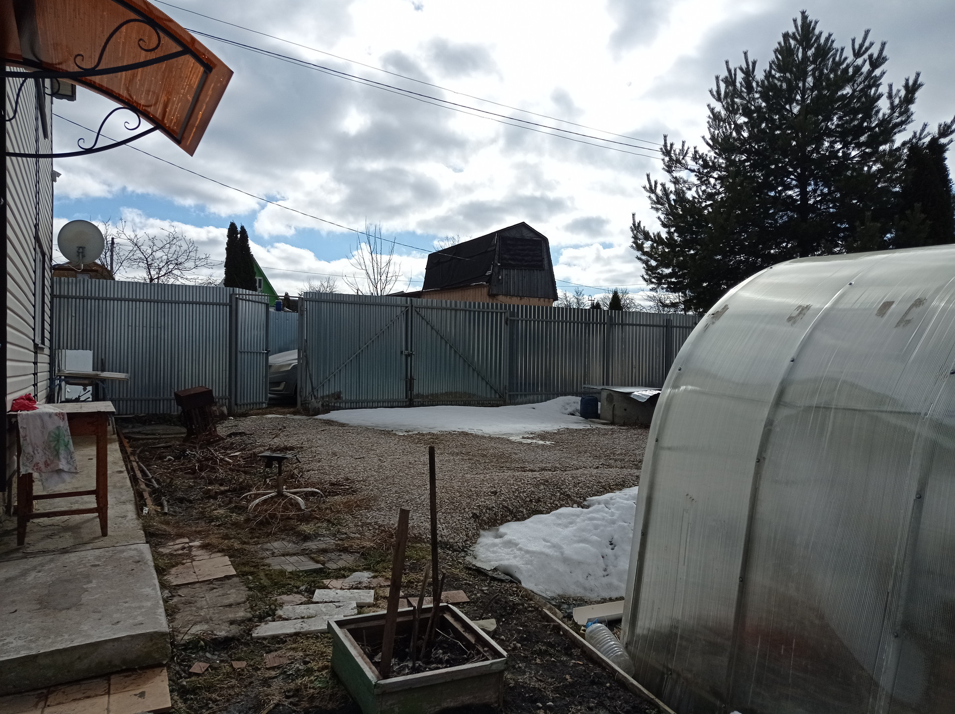 Высокий глухой забор по периметру, на участке парковочное место. Мебель остается.