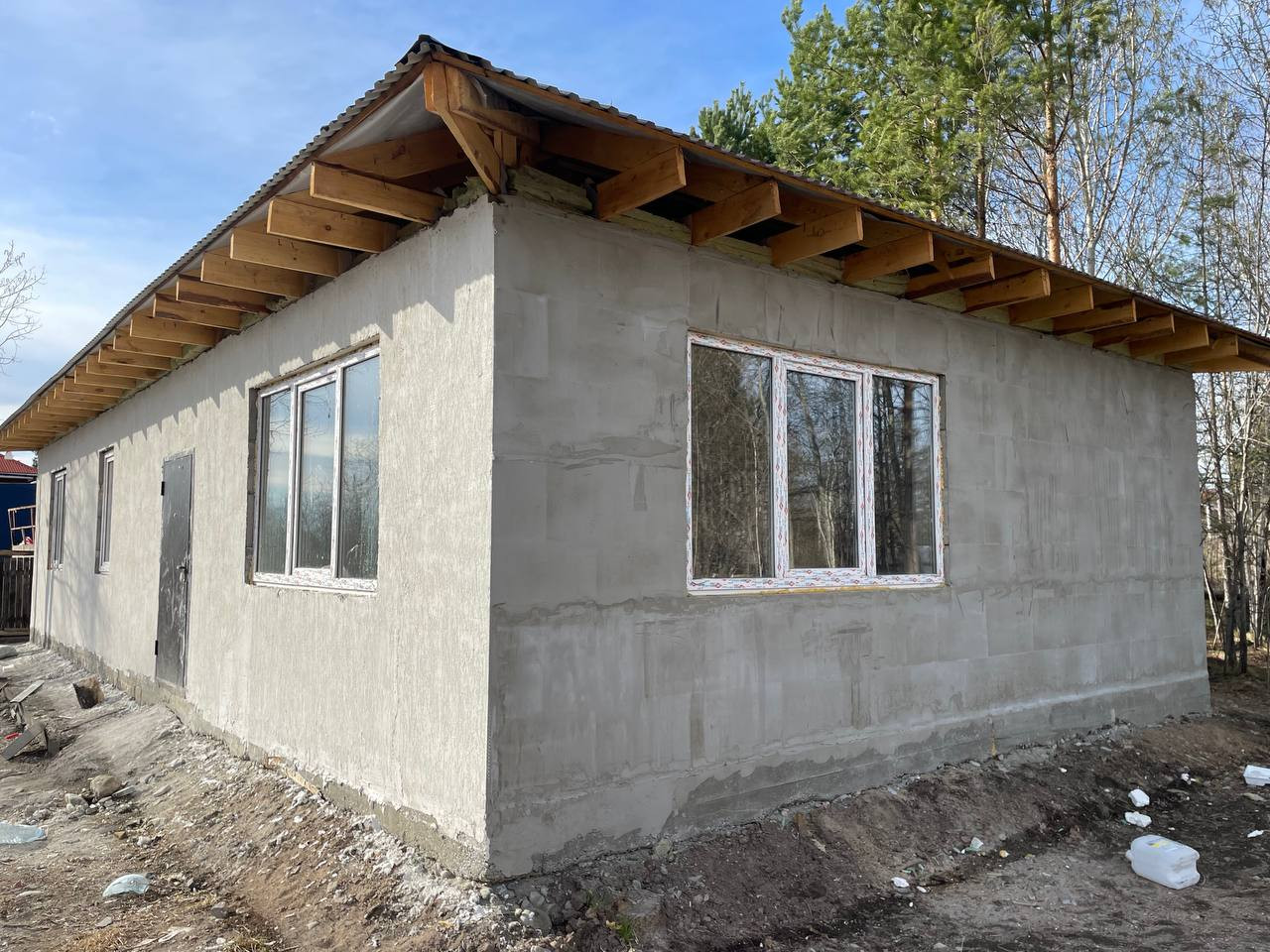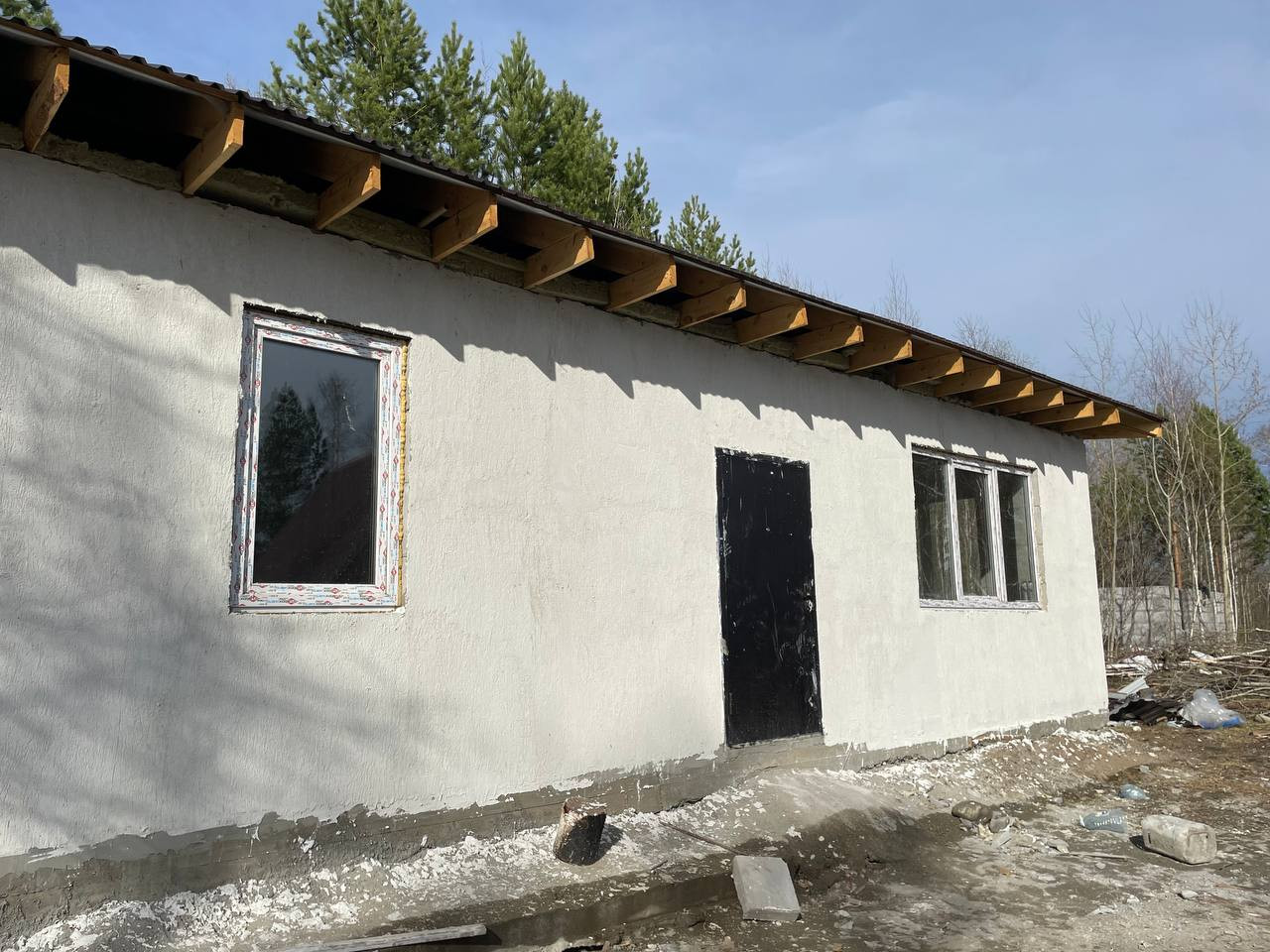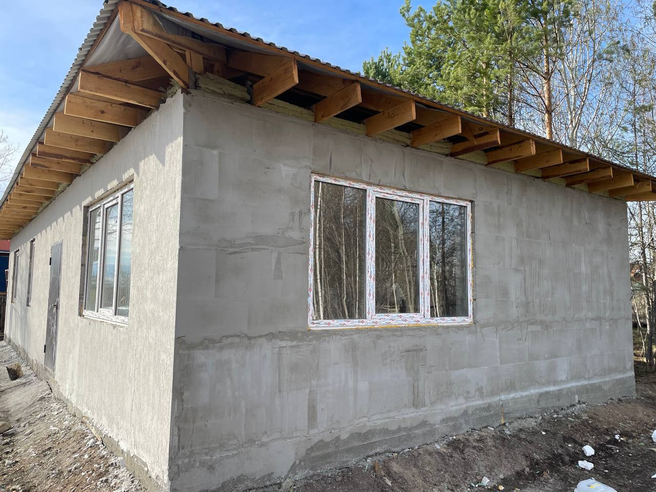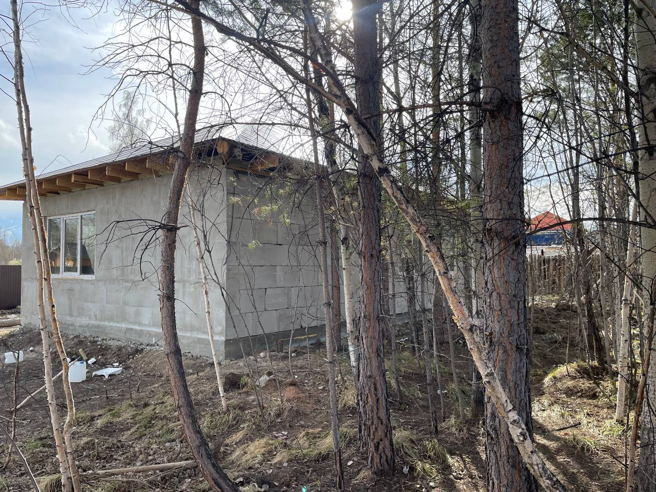 Черновая отделка. Фундамент монолитная плита. Материал стен - газоблок. Отопление - теплые водяные полы. В доме 3 спальни и кухня-гостиная, 2 санузла. На участке максимально сохранен лес, при этом есть возможность построить гараж, беседку, организовать зону отдыха.