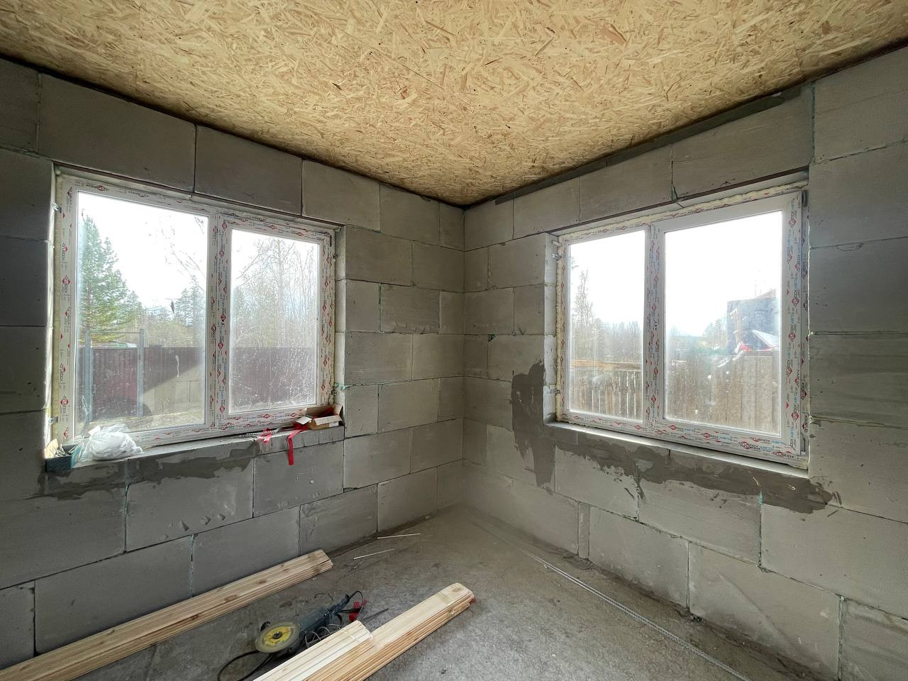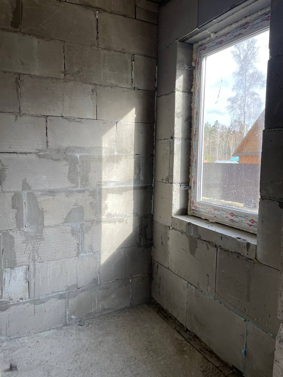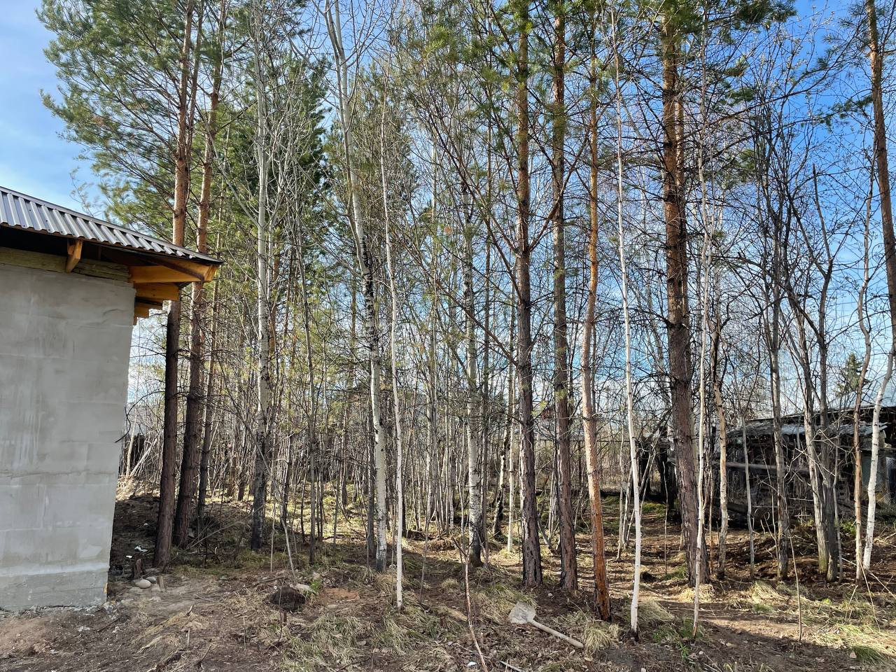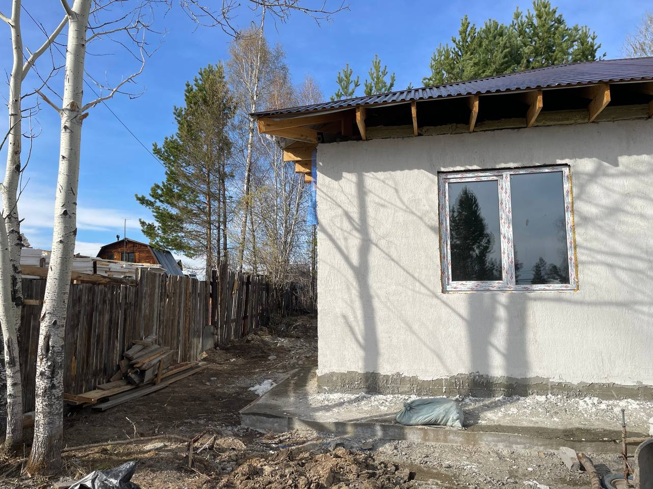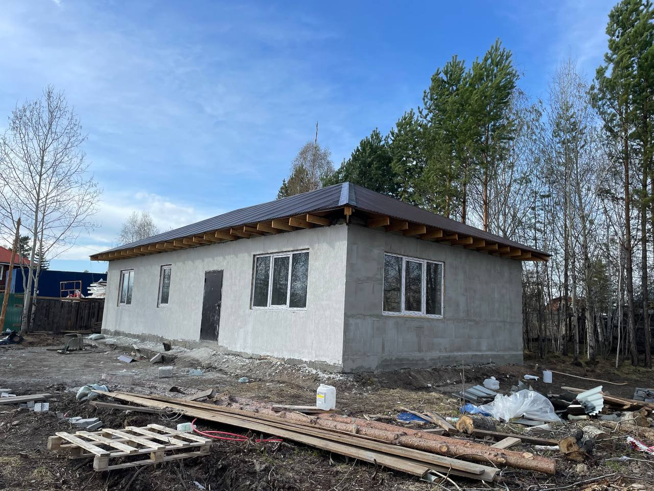Черновая отделка. Фундамент монолитная плита. Материал стен - газоблок. Отопление - теплые водяные полы. В доме 3 спальни и кухня-гостиная, 2 санузла. На участке максимально сохранен лес, при этом есть возможность построить гараж, беседку, организовать зону отдыха.
