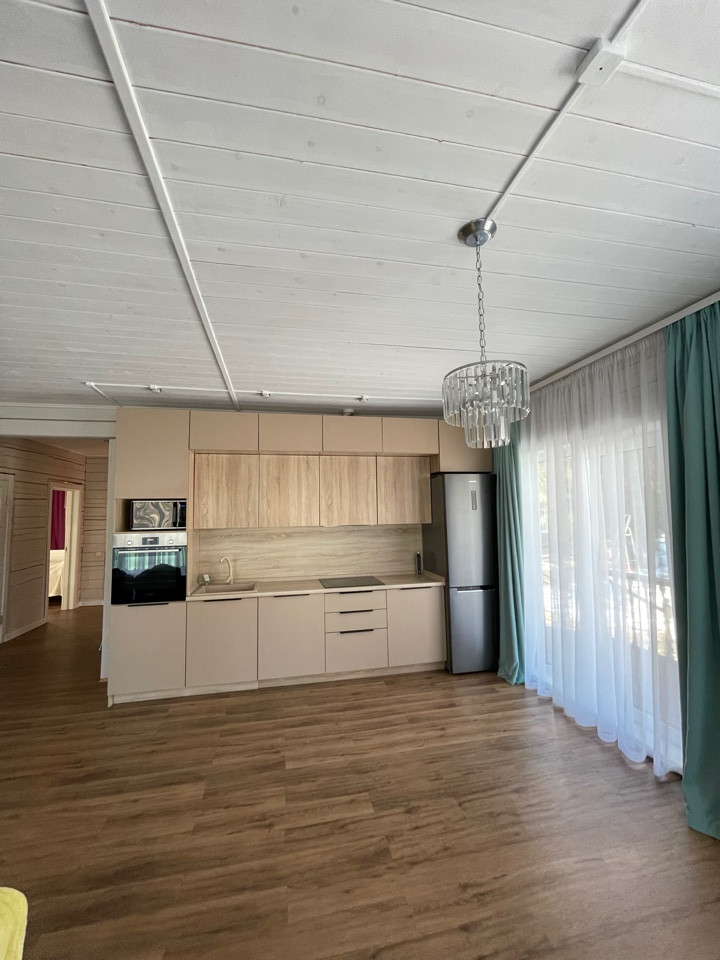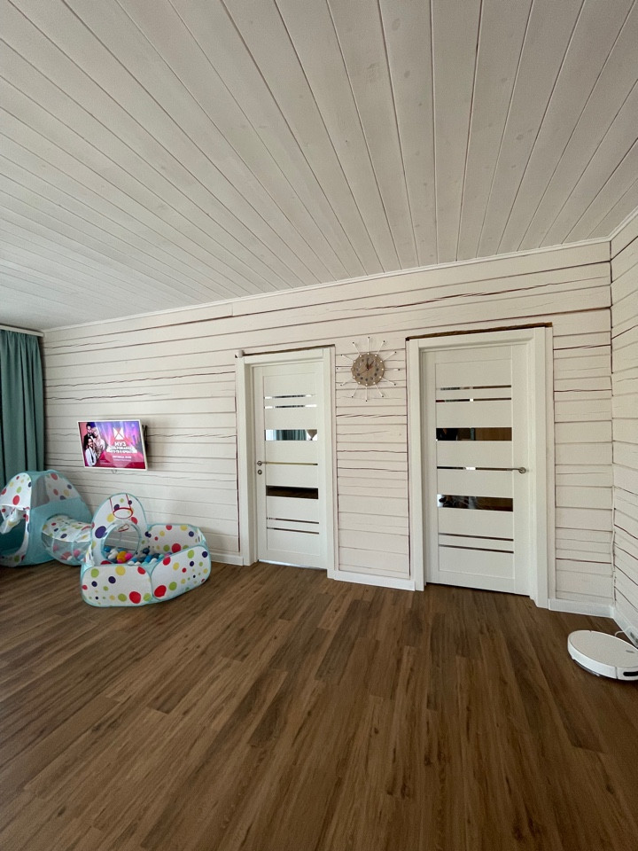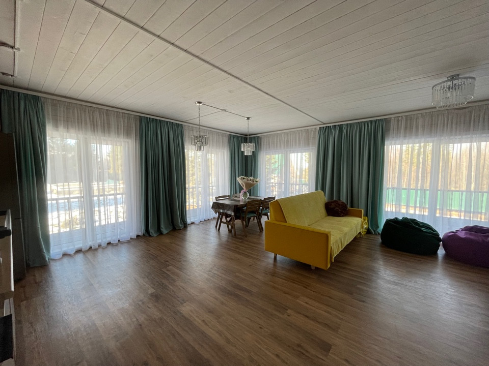 На полу- плитка ПВХ Интернет, спутниковое ТВ, сигнализация В доме есть просторная терраса (47 кв м) с двумя выходами из кухни-гостиной с витражными окнами.