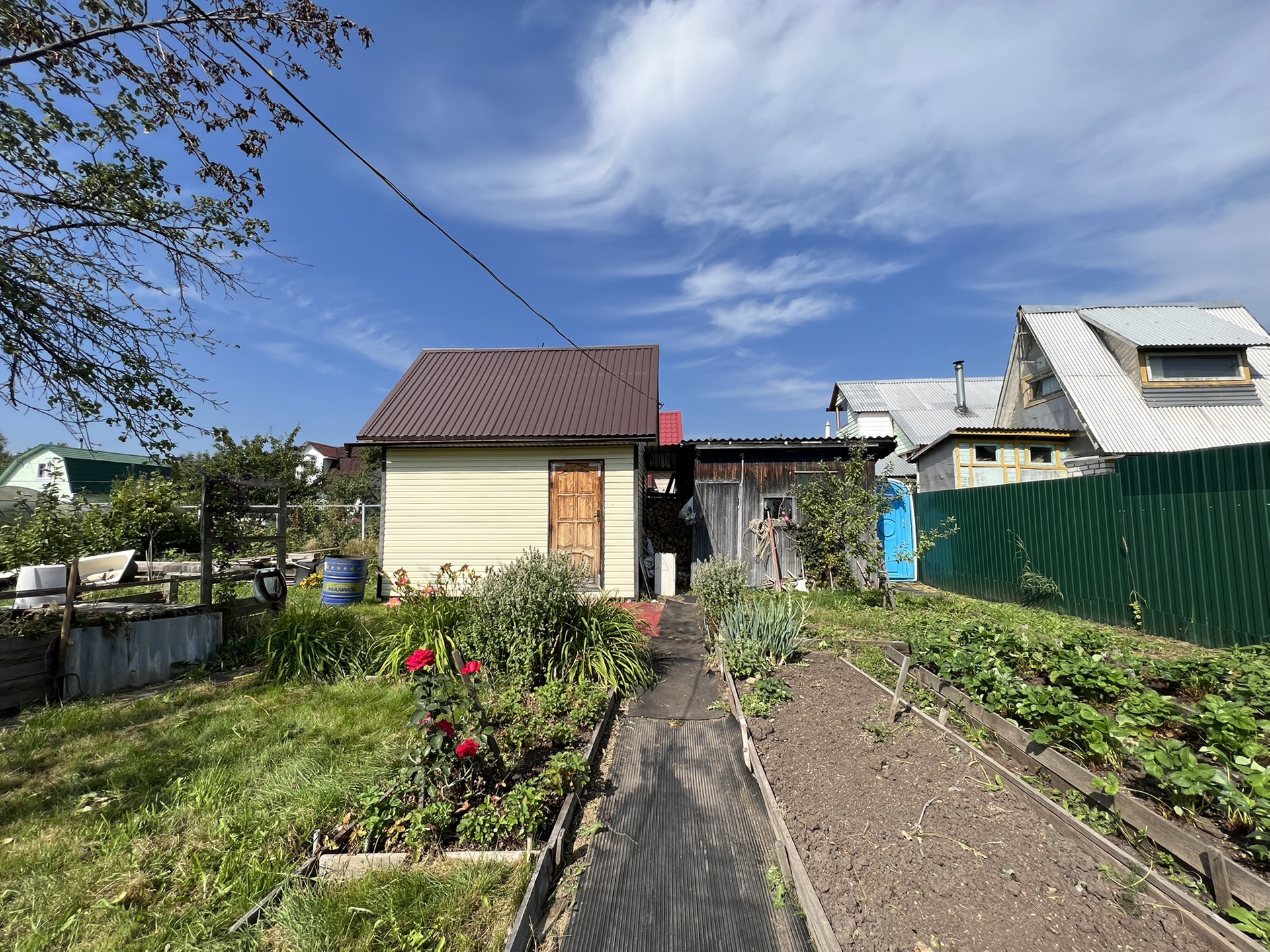 Участок ровный, правильной формы, сухой. Огорожен забором. Есть место для парковки автомобиля (вместимость 2 авто). Имеется летний водопровод и электричество 15 кВт.