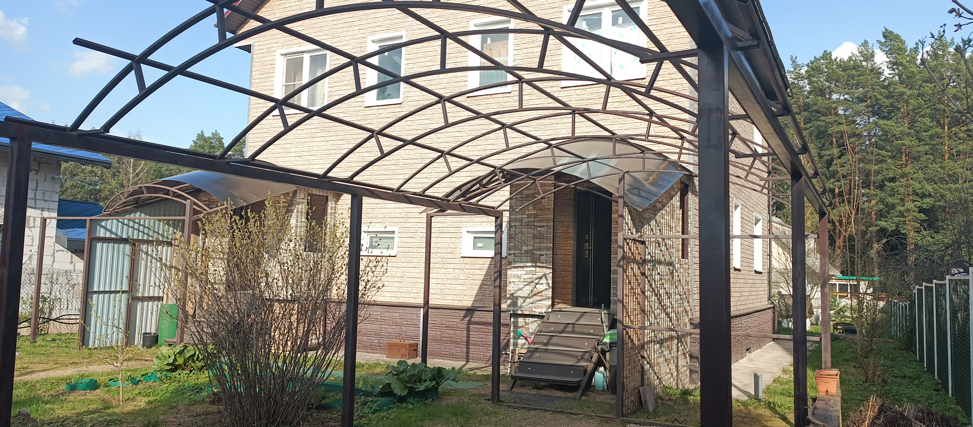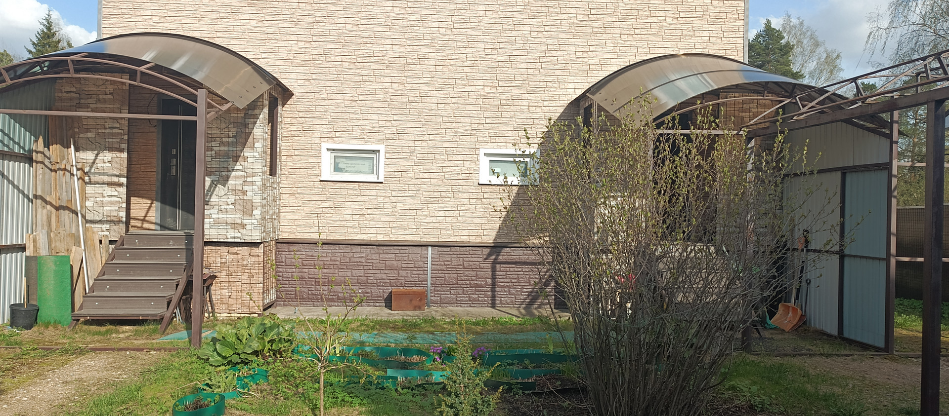 2 машиноместа(каждое 2 авто вмещает), 2 входные, въездные группы(2-ое ворот и калиток).