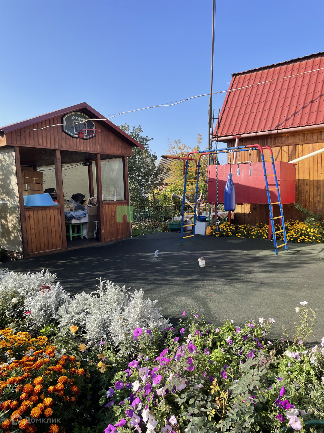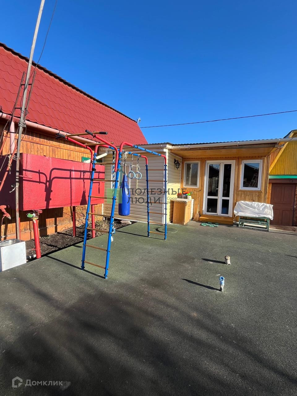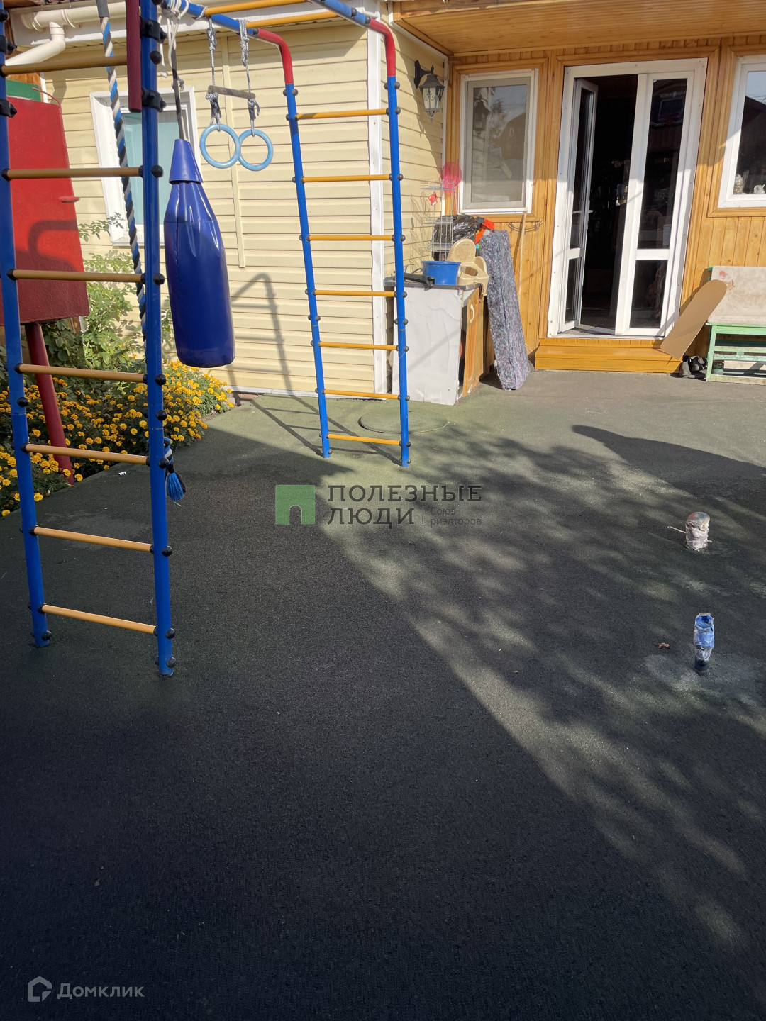 Во дворе площадка с резиновым покрытием, детский спортивный уголок.