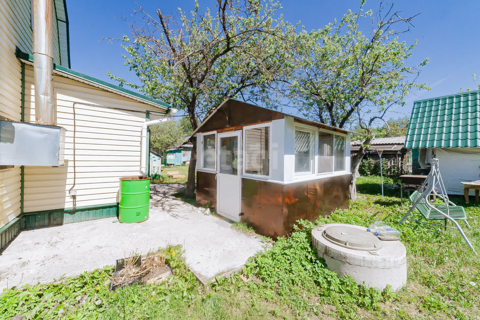 На участке много плодовых деревьев и кустарников.