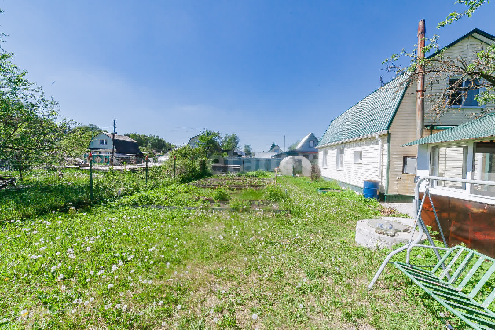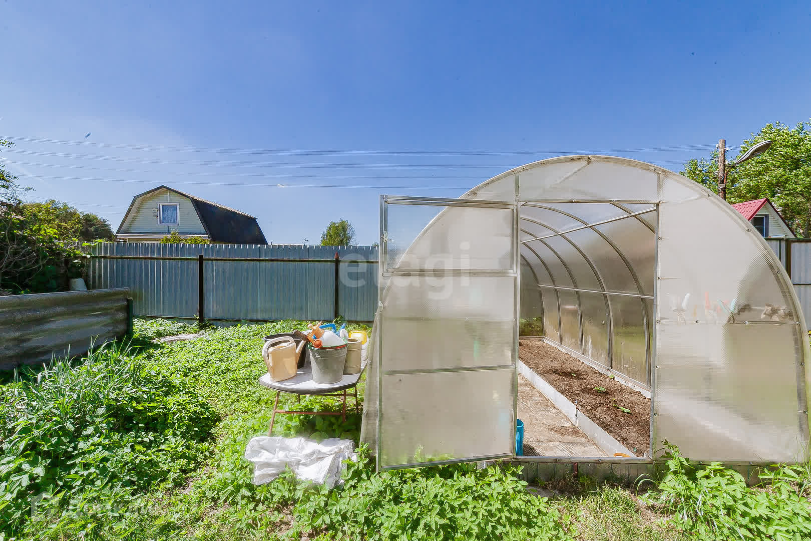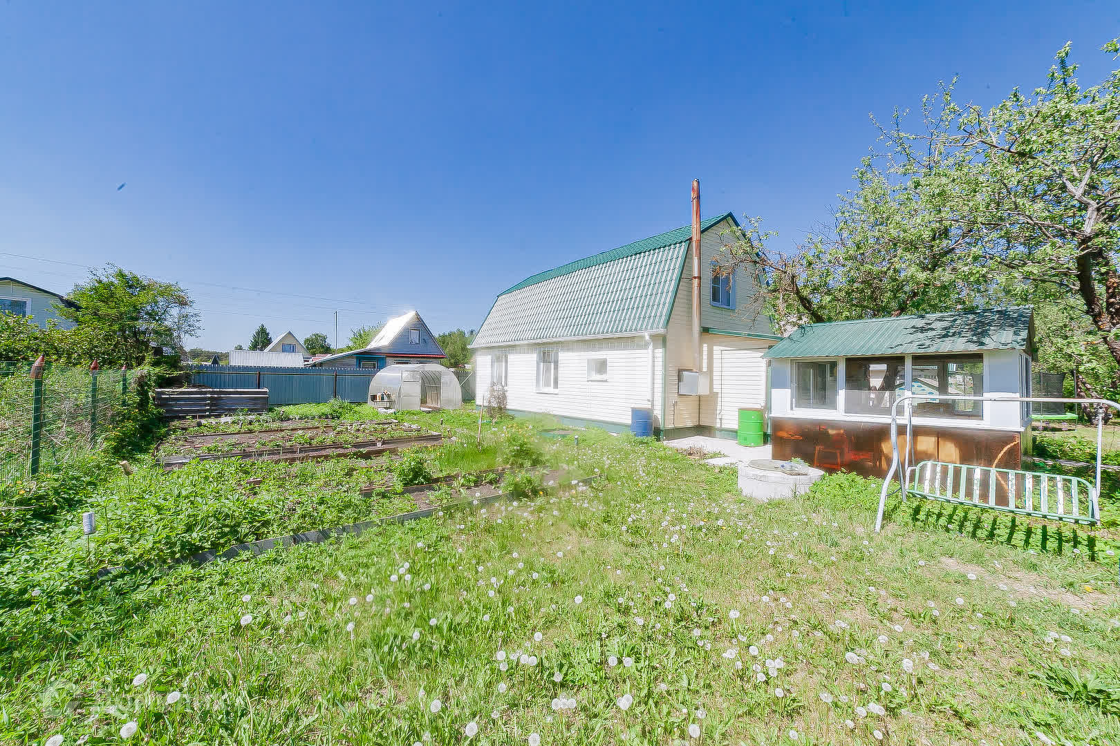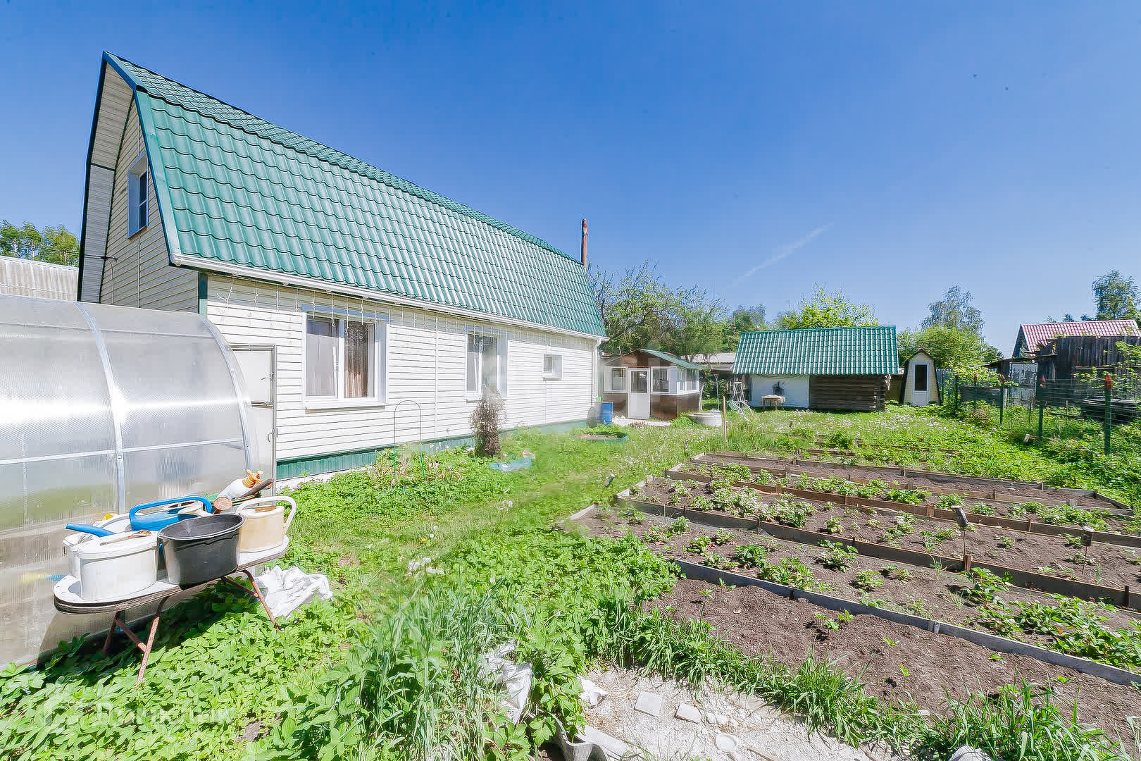 Участок разработан, есть 2 теплицы из поликарбоната, беседка, баня!
