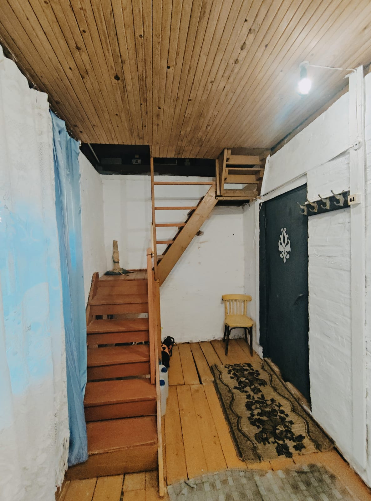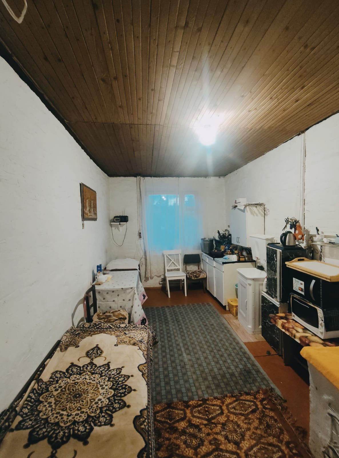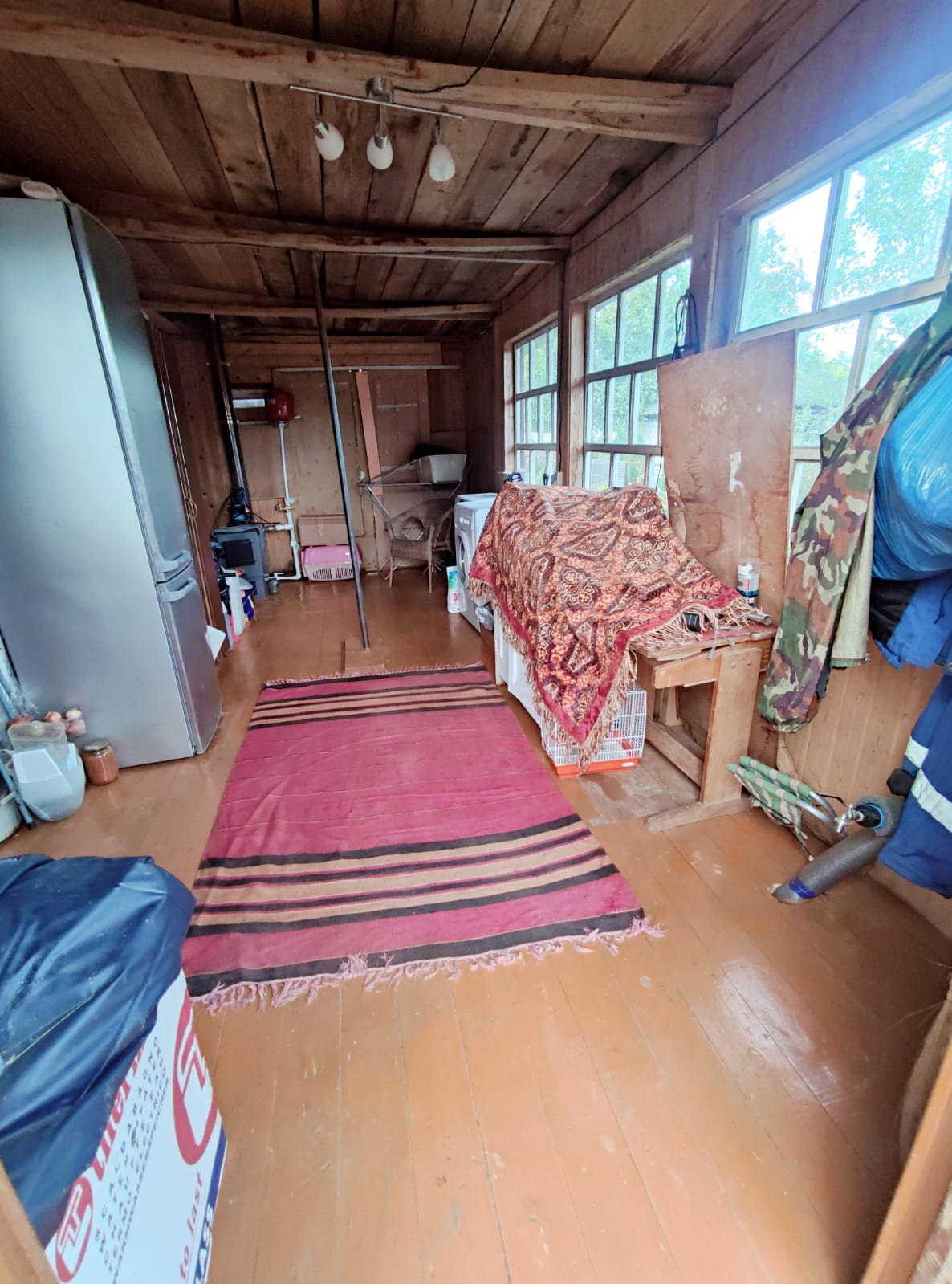 1-й этаж - большая веранда с установленным твердотопливным комбинированным котлом + холл 20 кв. метров, спальня и кухня с дровяной печкой.