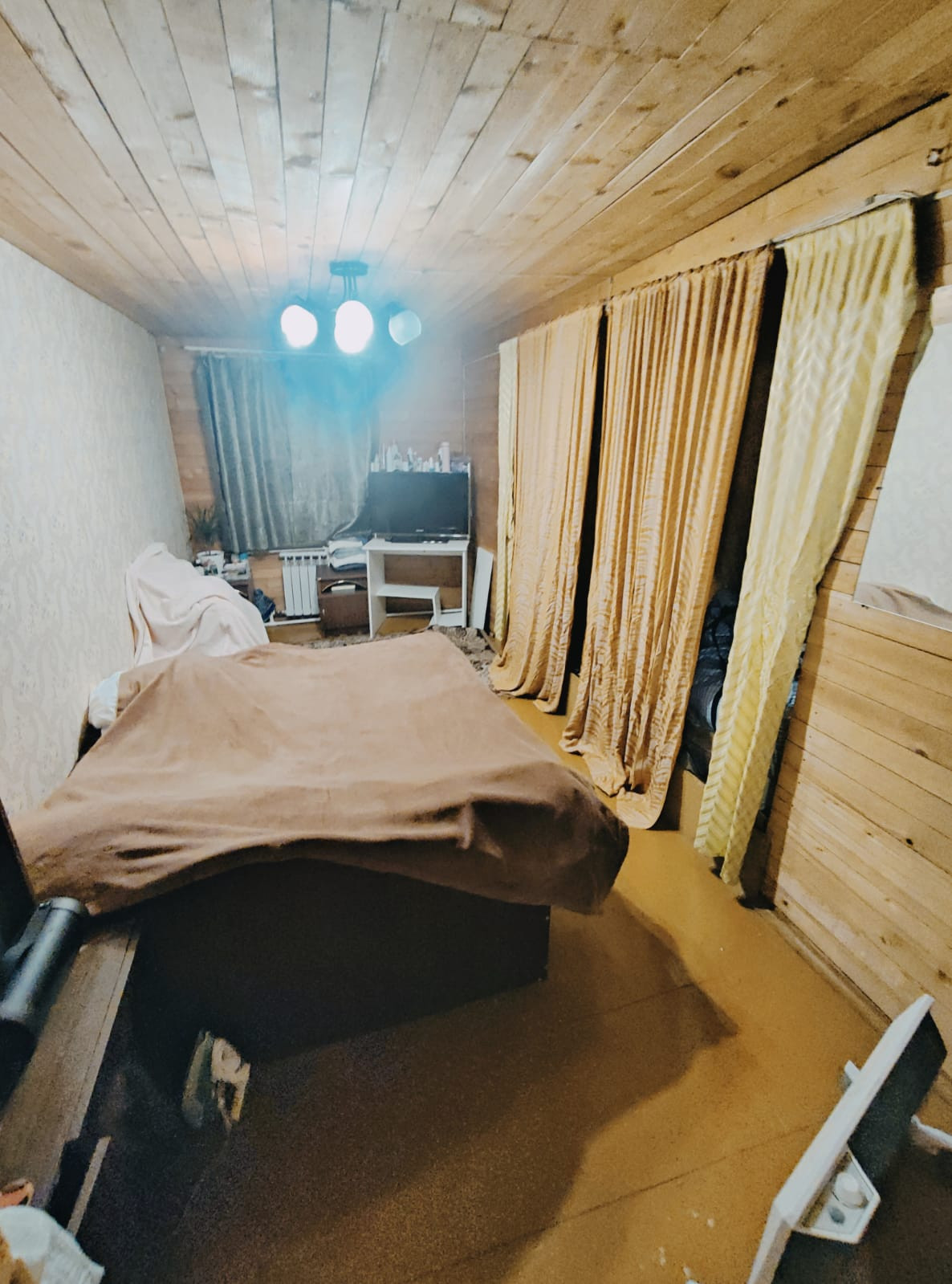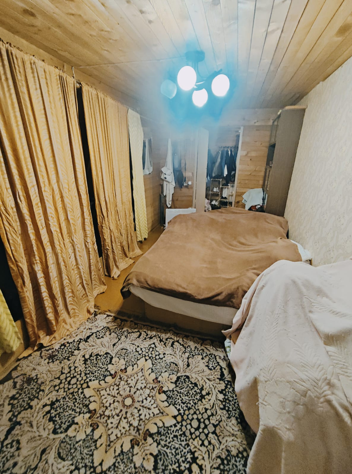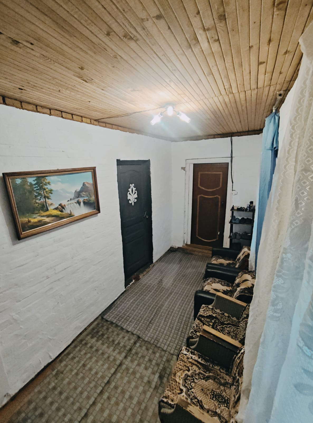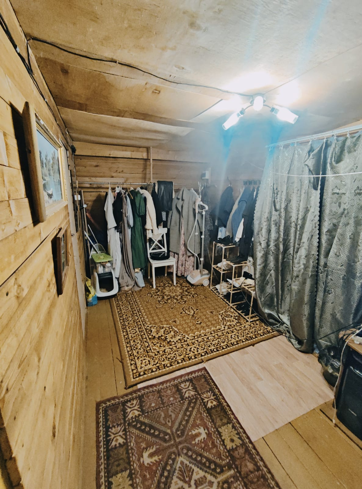 1-й этаж - большая веранда с установленным твердотопливным комбинированным котлом + холл 20 кв. метров, спальня и кухня с дровяной печкой.