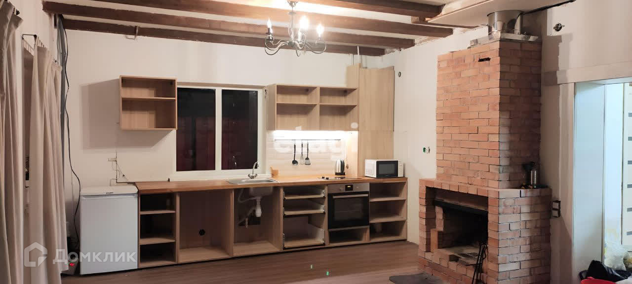 Первый этаж большая гостинная-кухня с камином. Установлен каркас кухни осталось только выбрать фасады на свой вкус, столешница натуральный дуб. Большой совмещенный санузел. Спальня.