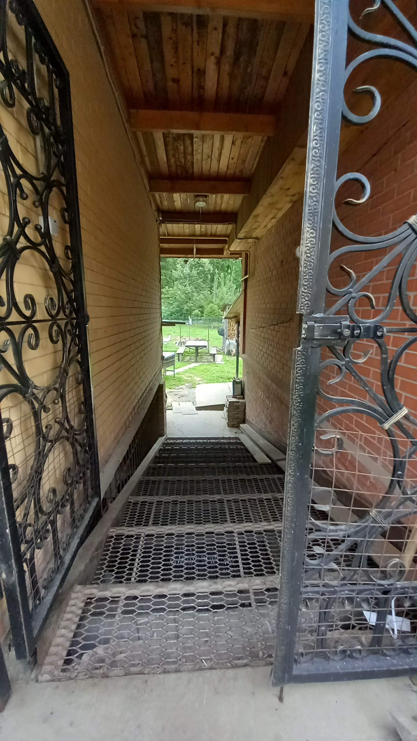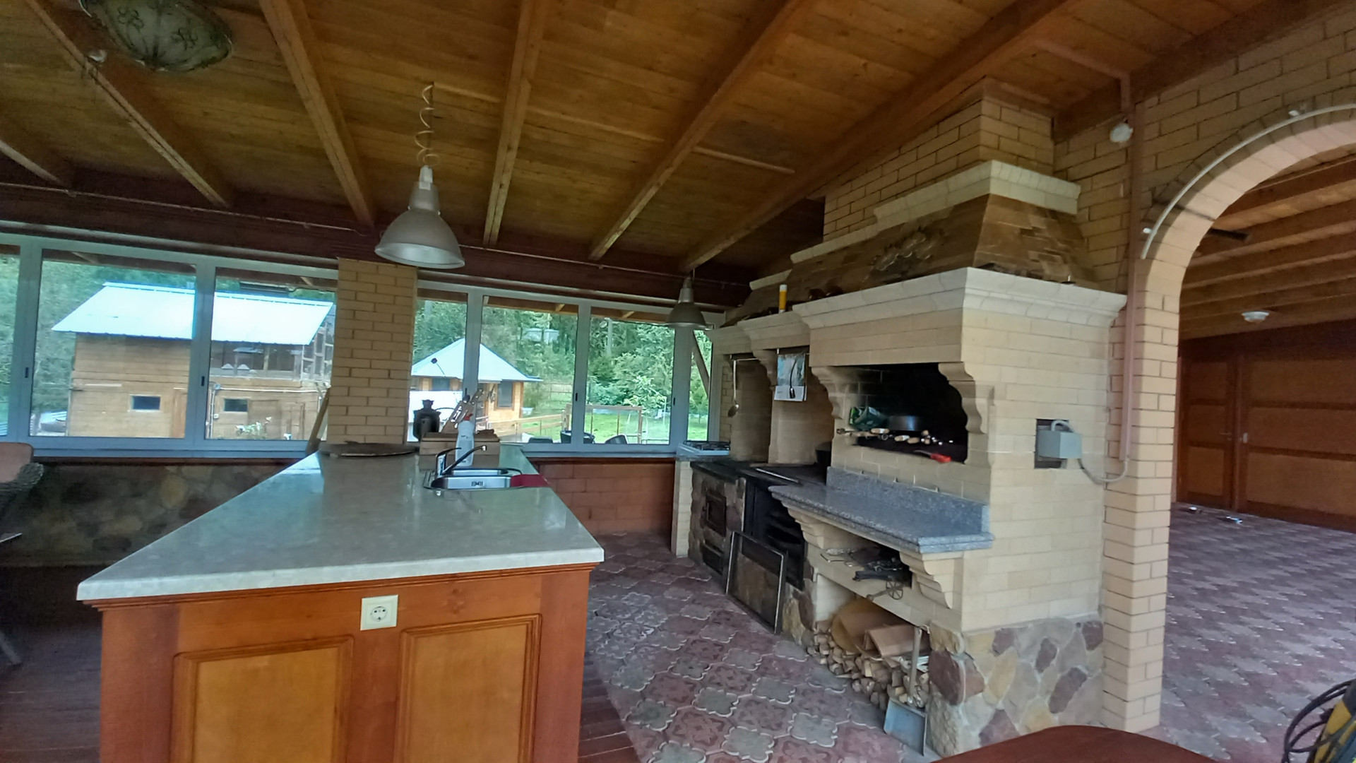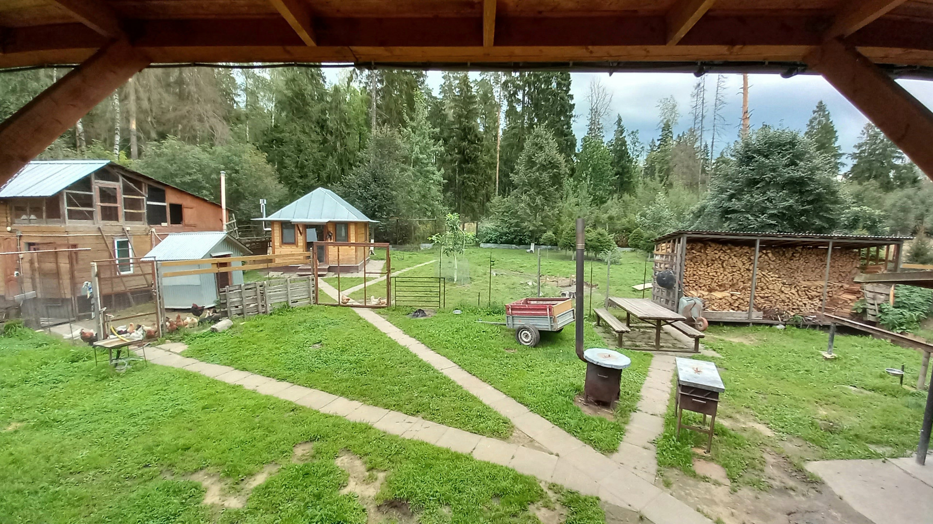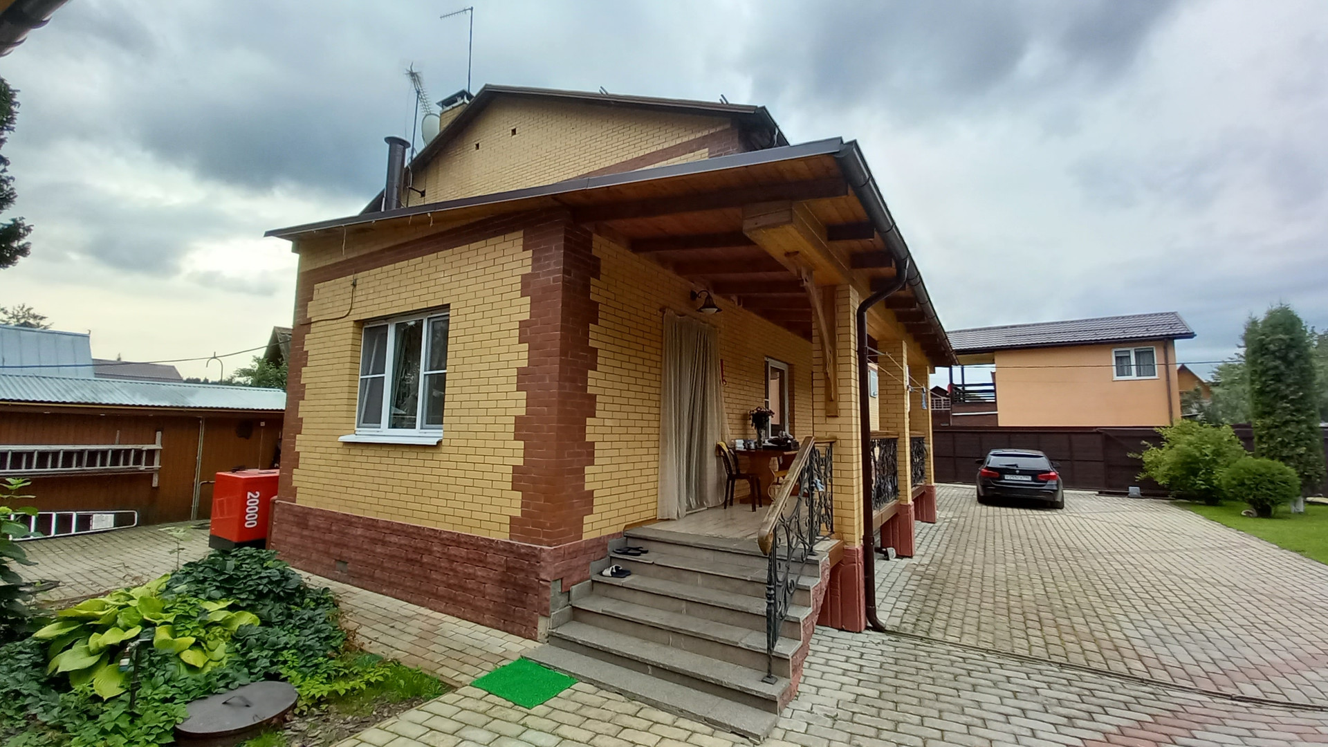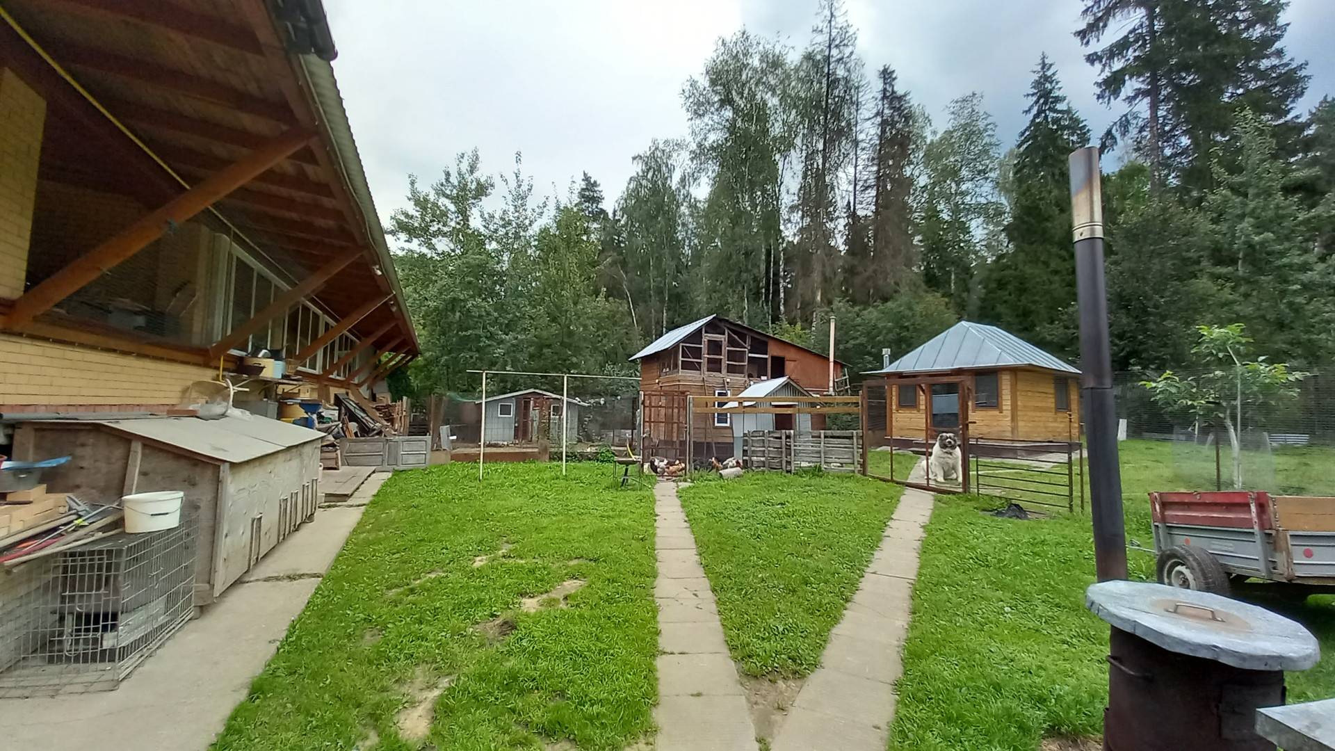 На территории кроме дома есть другие постройки: гараж на две машины, хоз. помещение для инструмента, зона барбекю 100 м2, баня, домик для работника, курятник, вольер для собак.