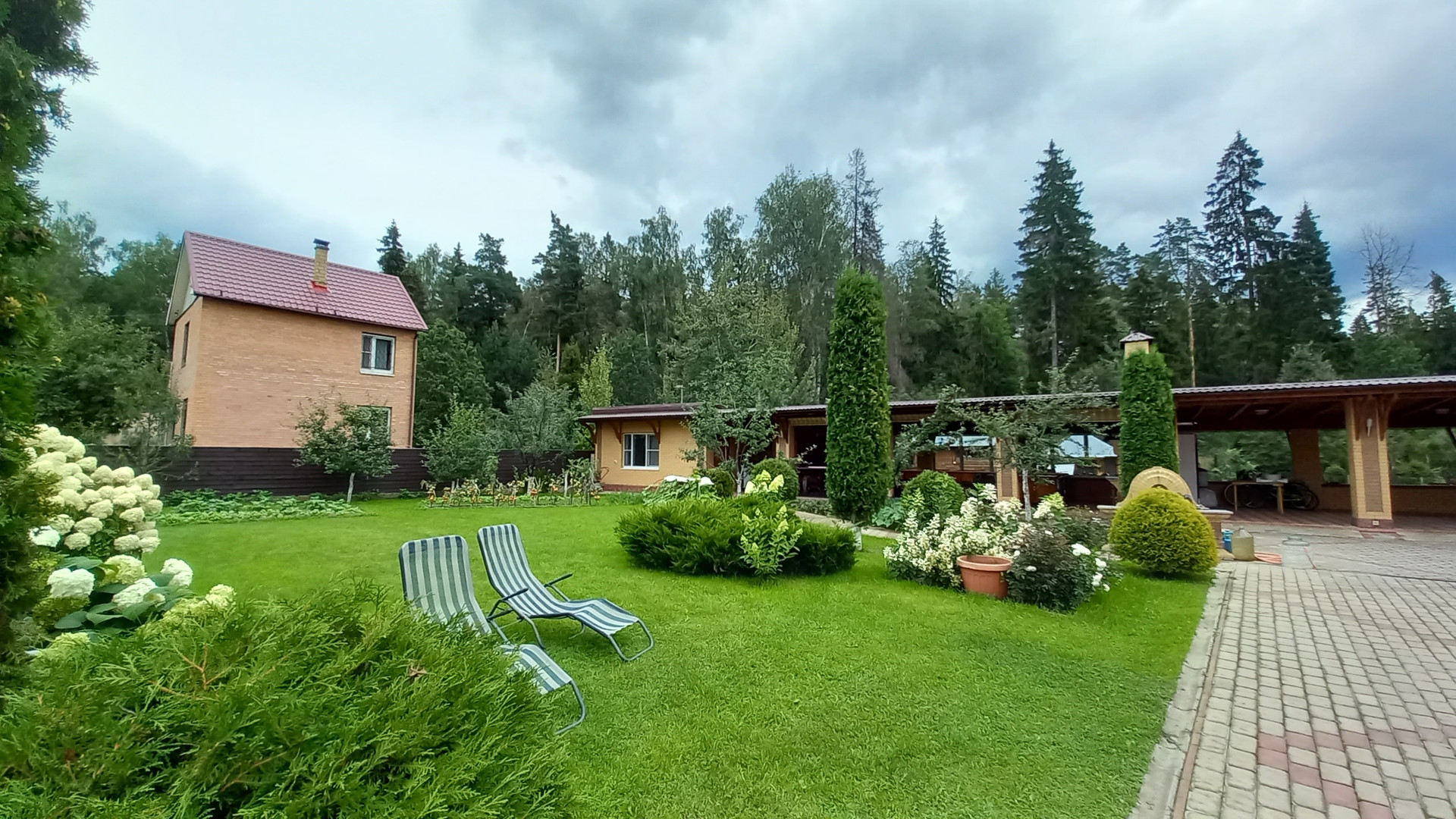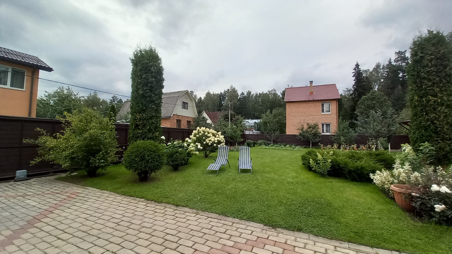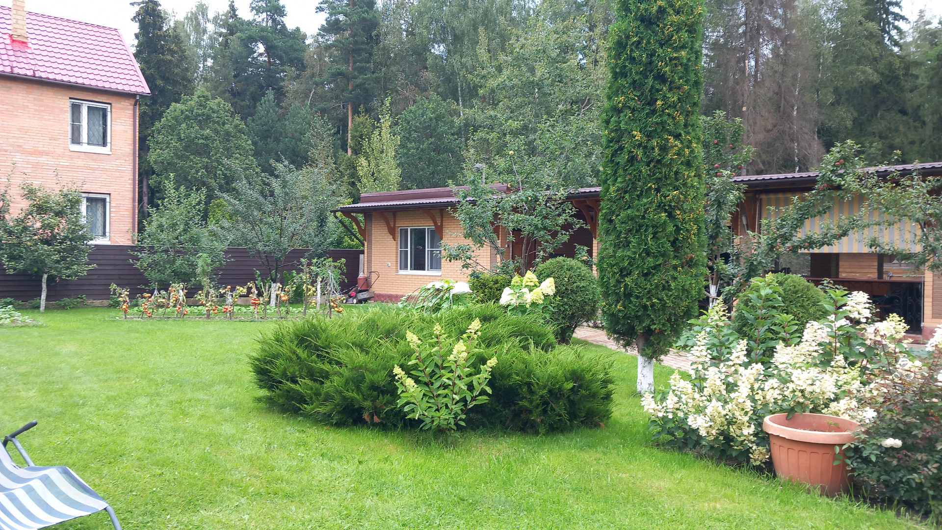 На участке посажены плодовые деревья: груши, яблони, слива и калина. Растут туи, цветы, ухоженный газон.