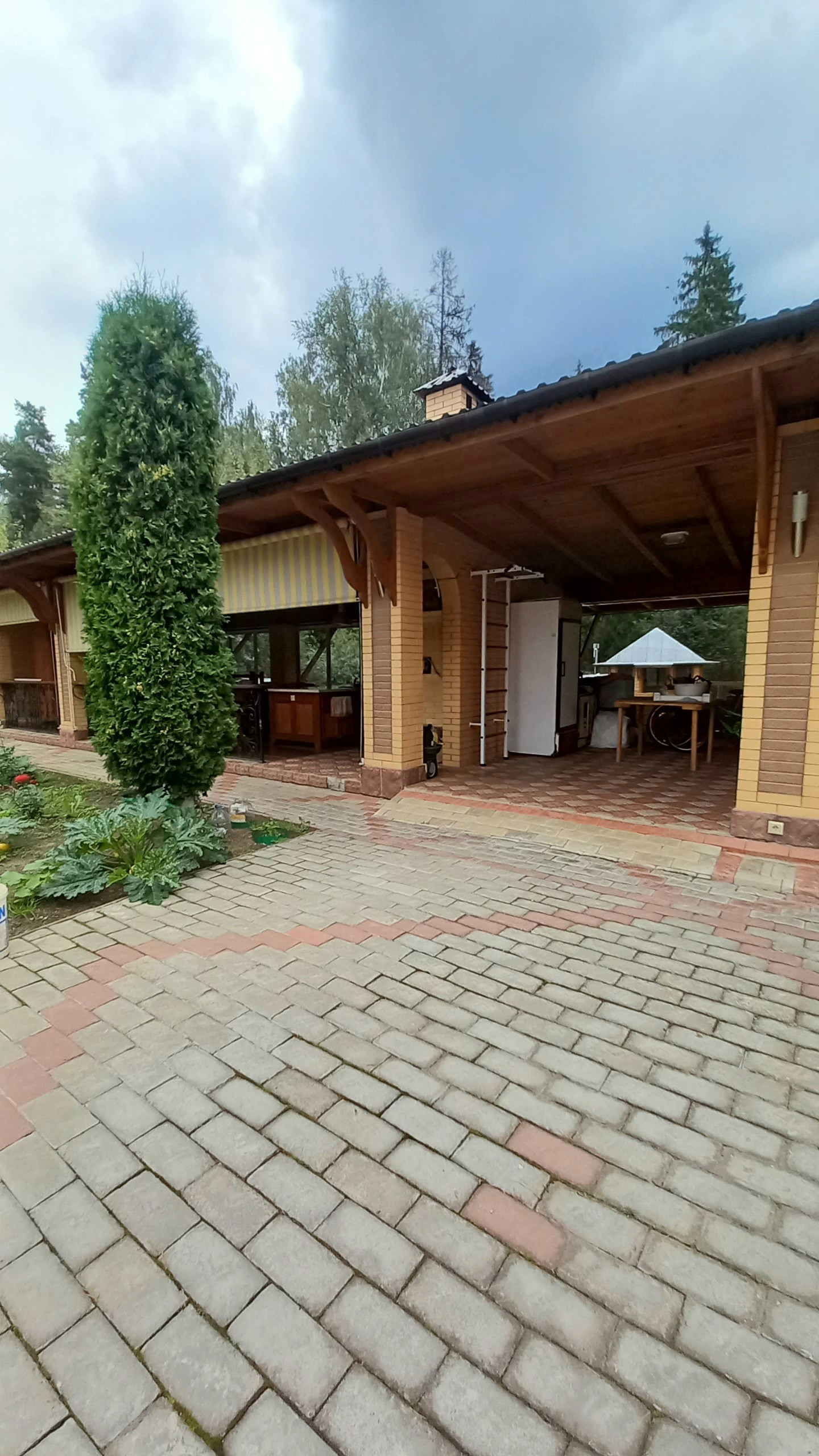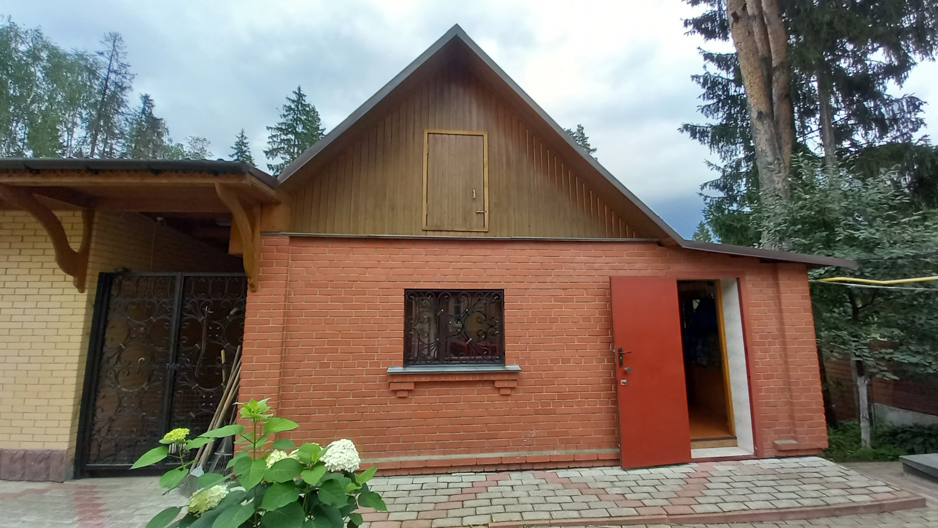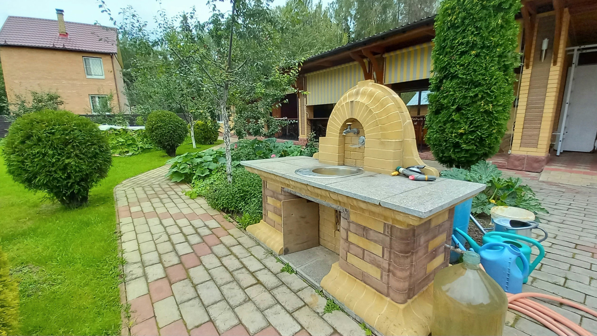 На участке посажены плодовые деревья: груши, яблони, слива и калина. Растут туи, цветы, ухоженный газон.