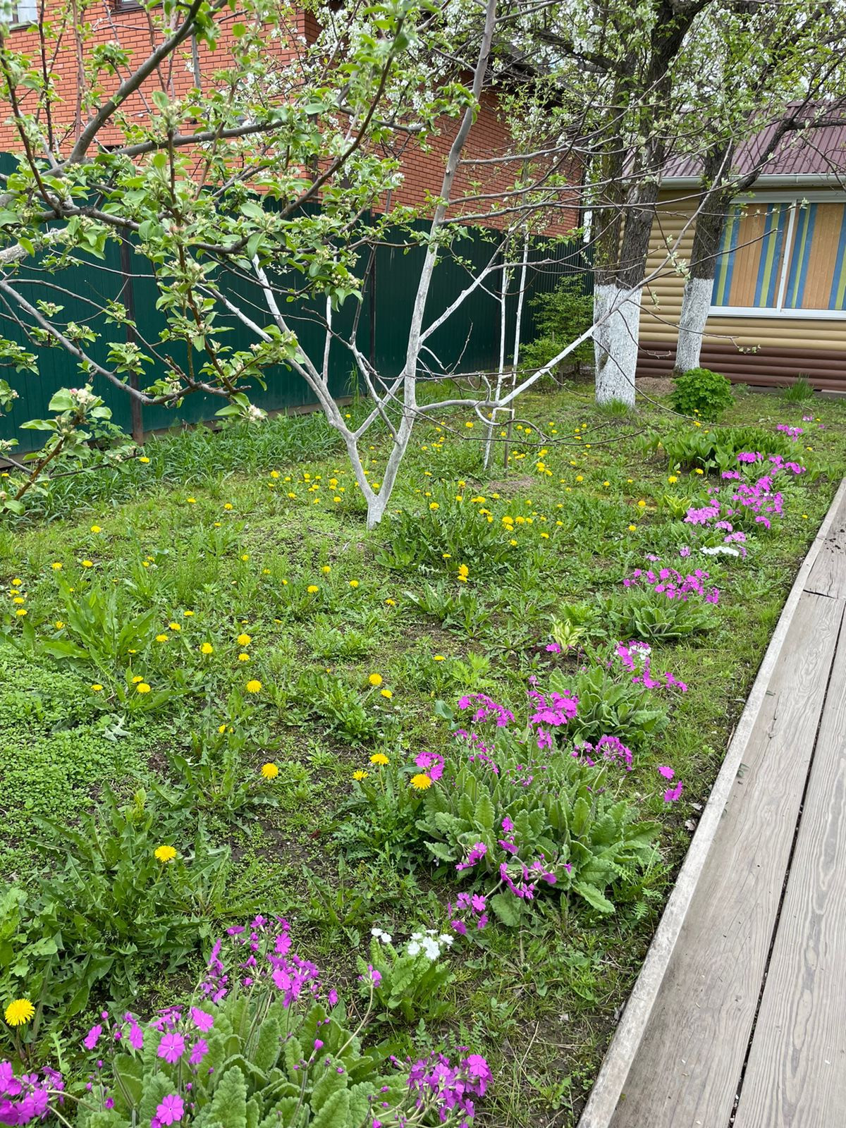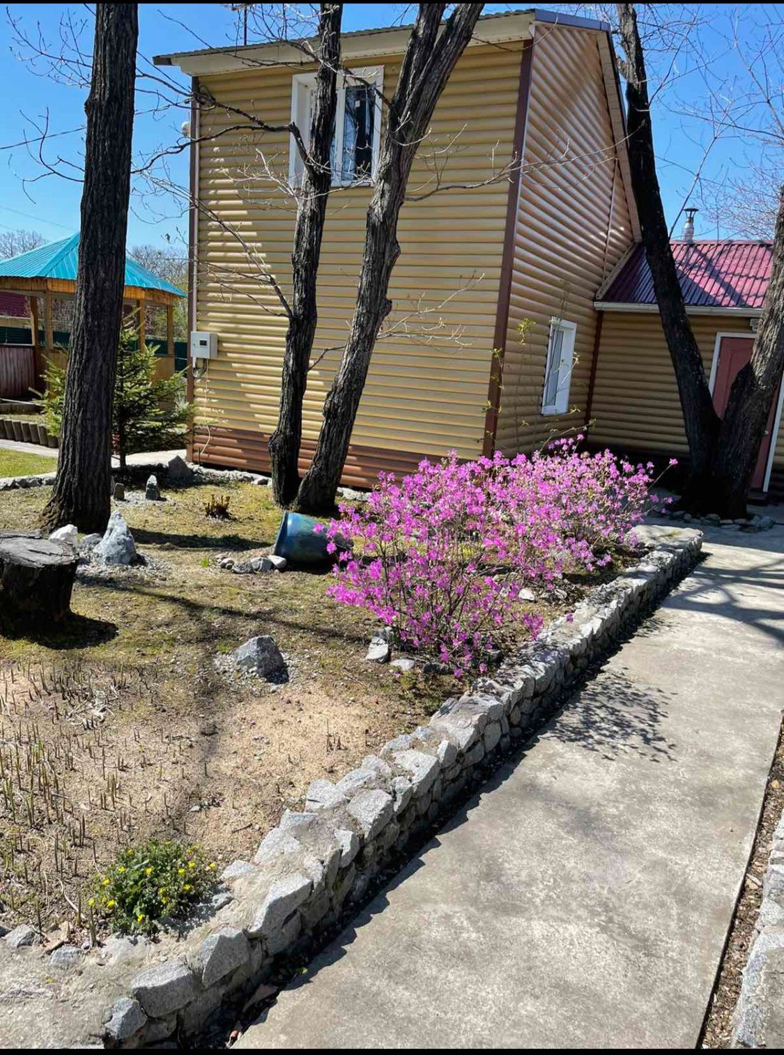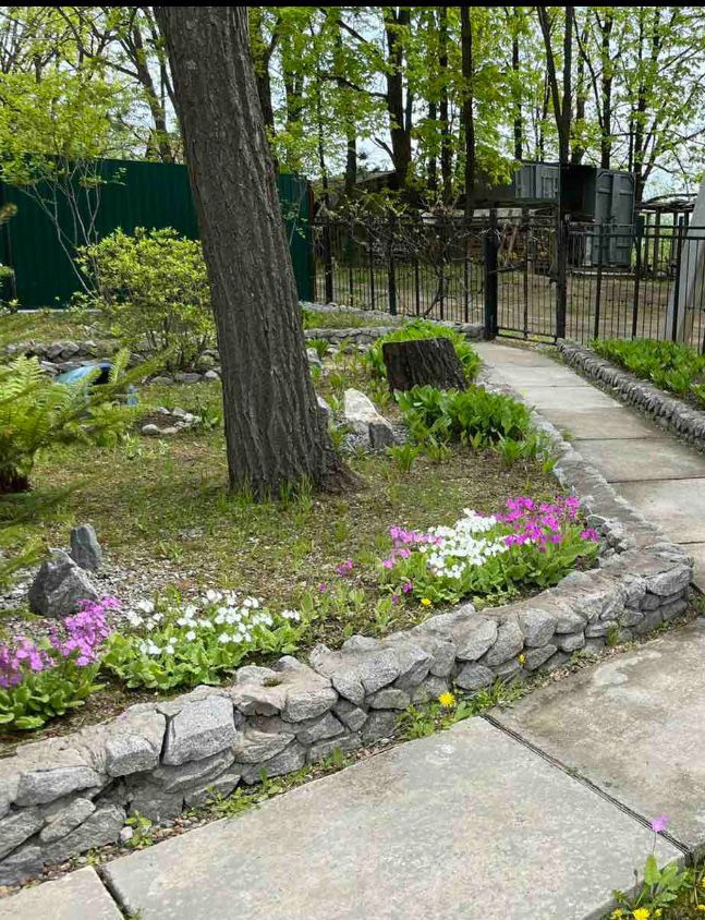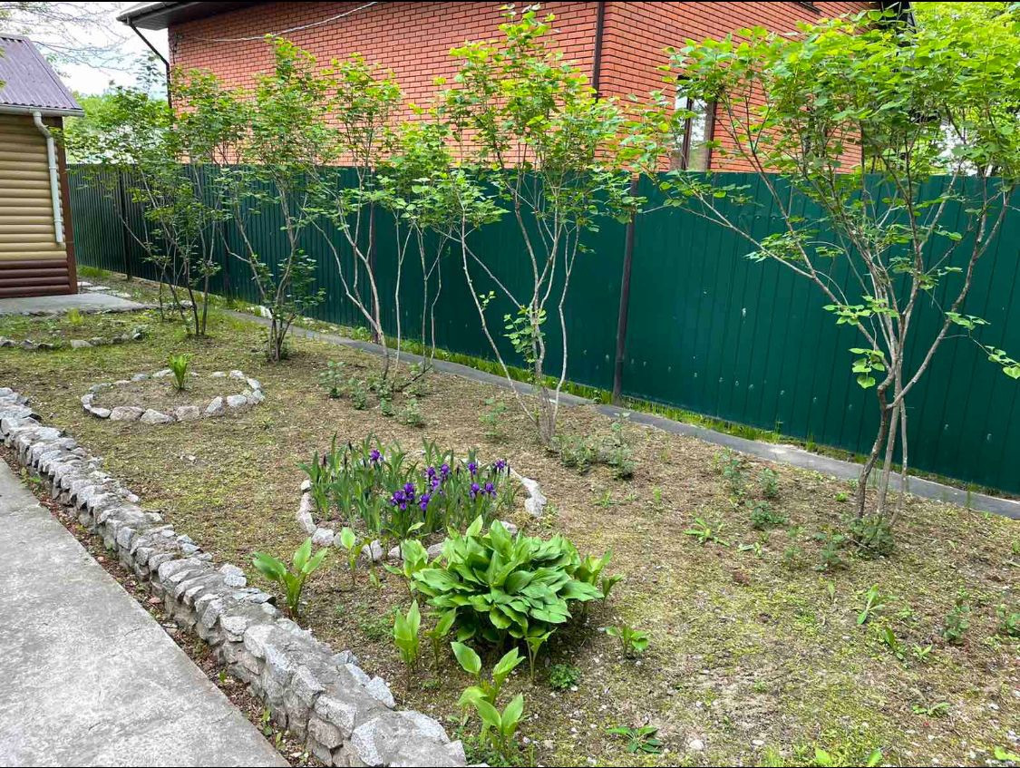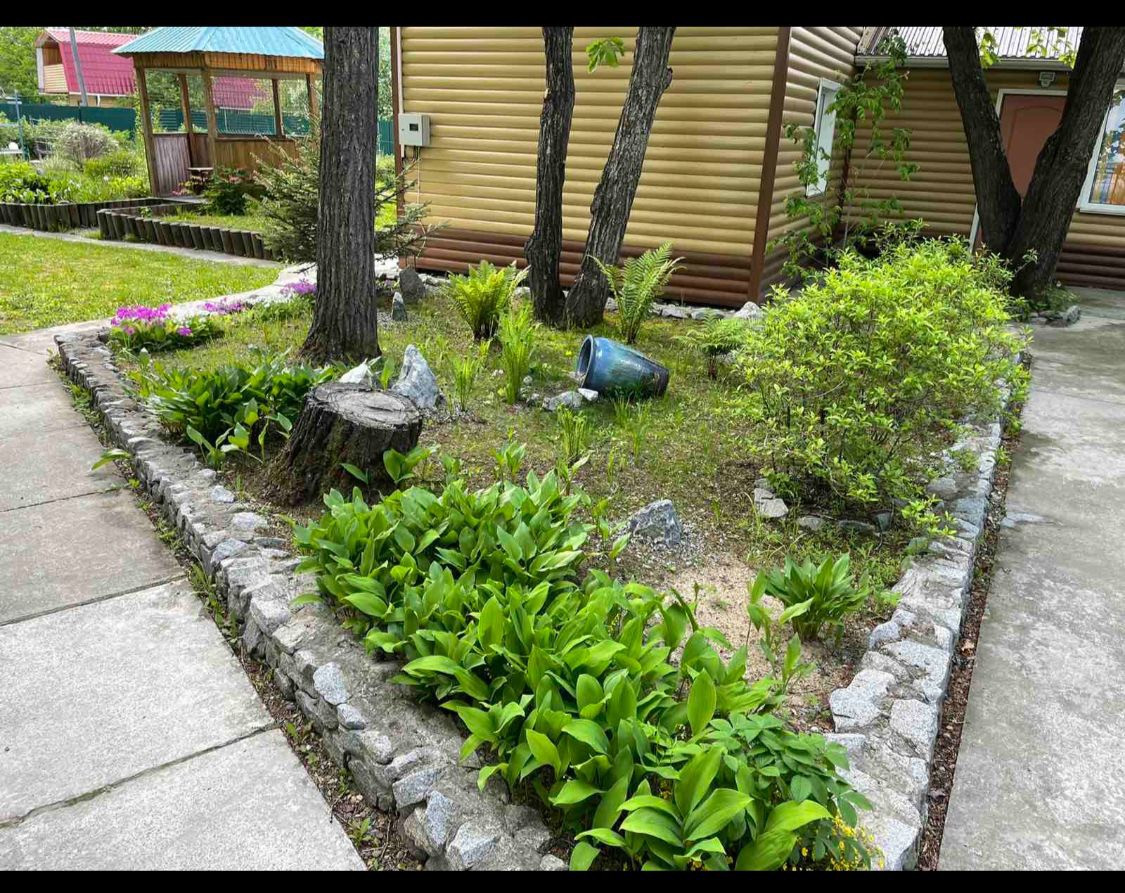 На территории есть большое количество плодородных деревьев ( яблоня, груша) и кустарников ( Калина, малина , в том числе и ремонтантная, виноград, жимолость, чёрная и красная смородина, крыжовник. Многолетние декоративные растения( богульник, сирень)и цветы ( ирисы, пионы, лилии, колокольчики, бархатцы) в клумбах и вдоль дорожек.