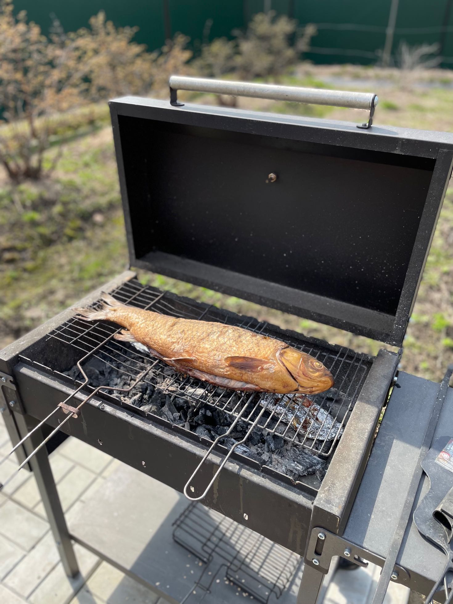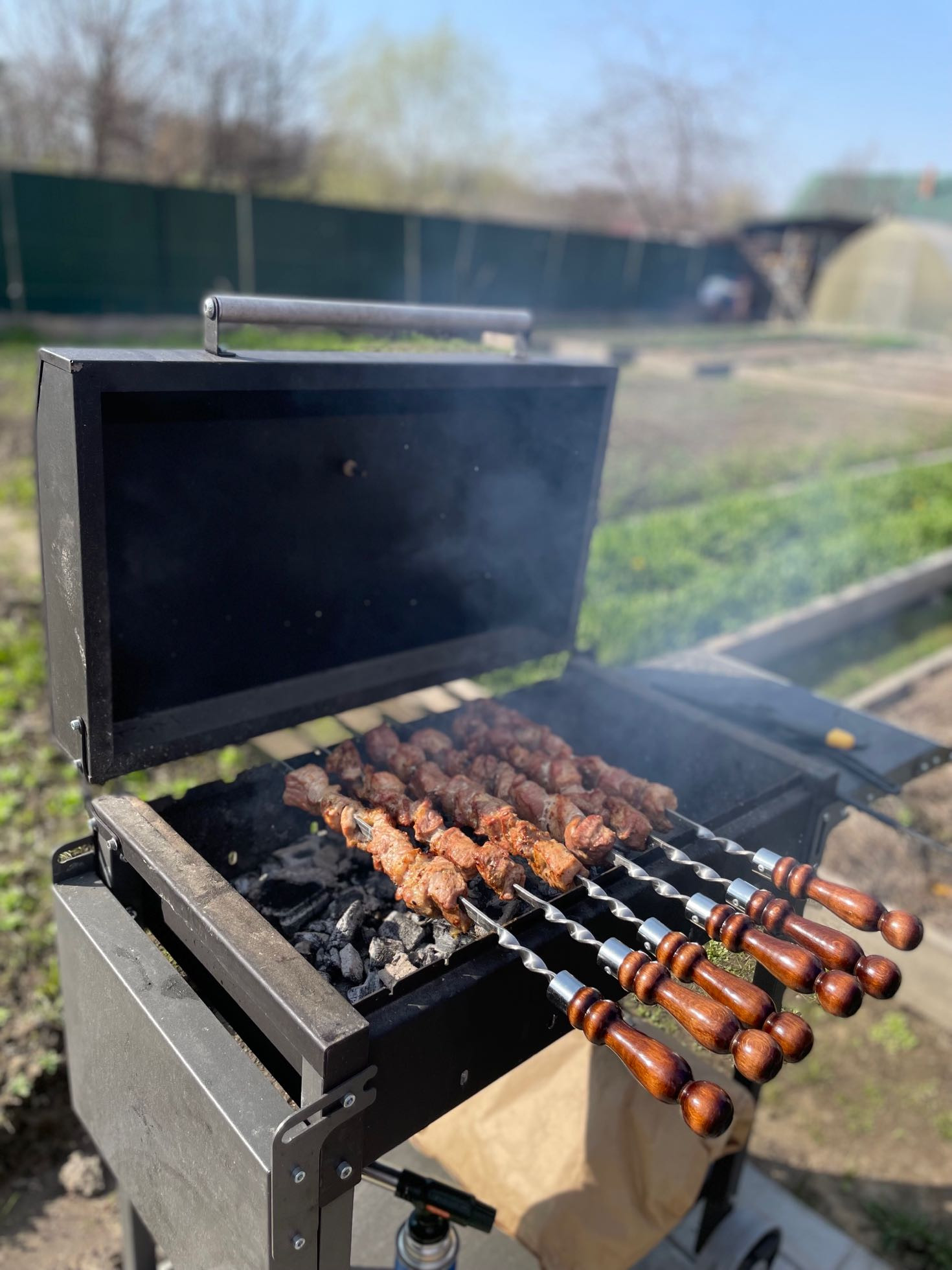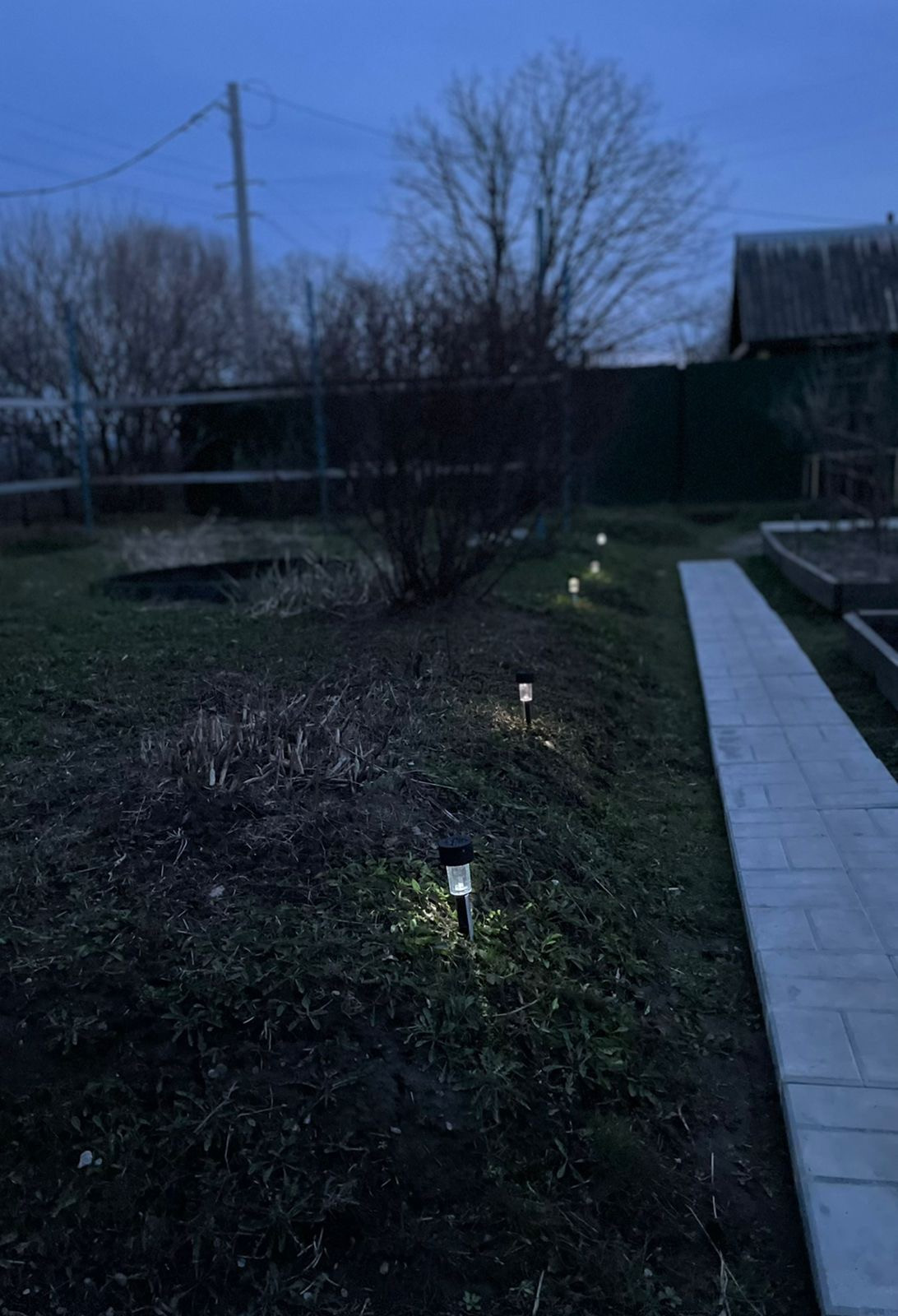 Грядки околочены. Есть 2 газона, бетонные тропинки, мангальная зона.
