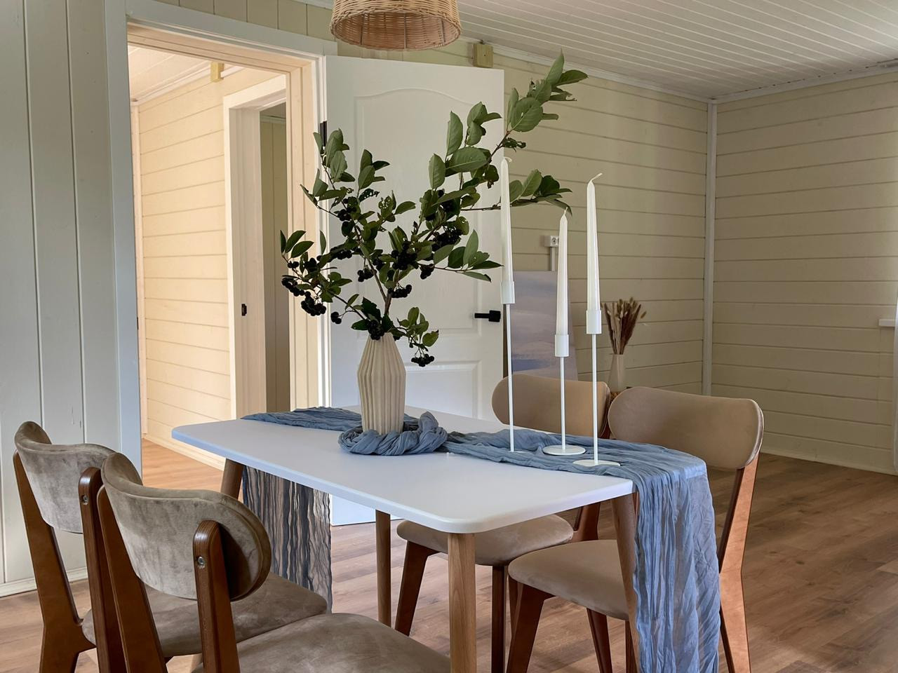 На 1 этаже располагается кухня-гостиная, 2 спальни и санузел.
