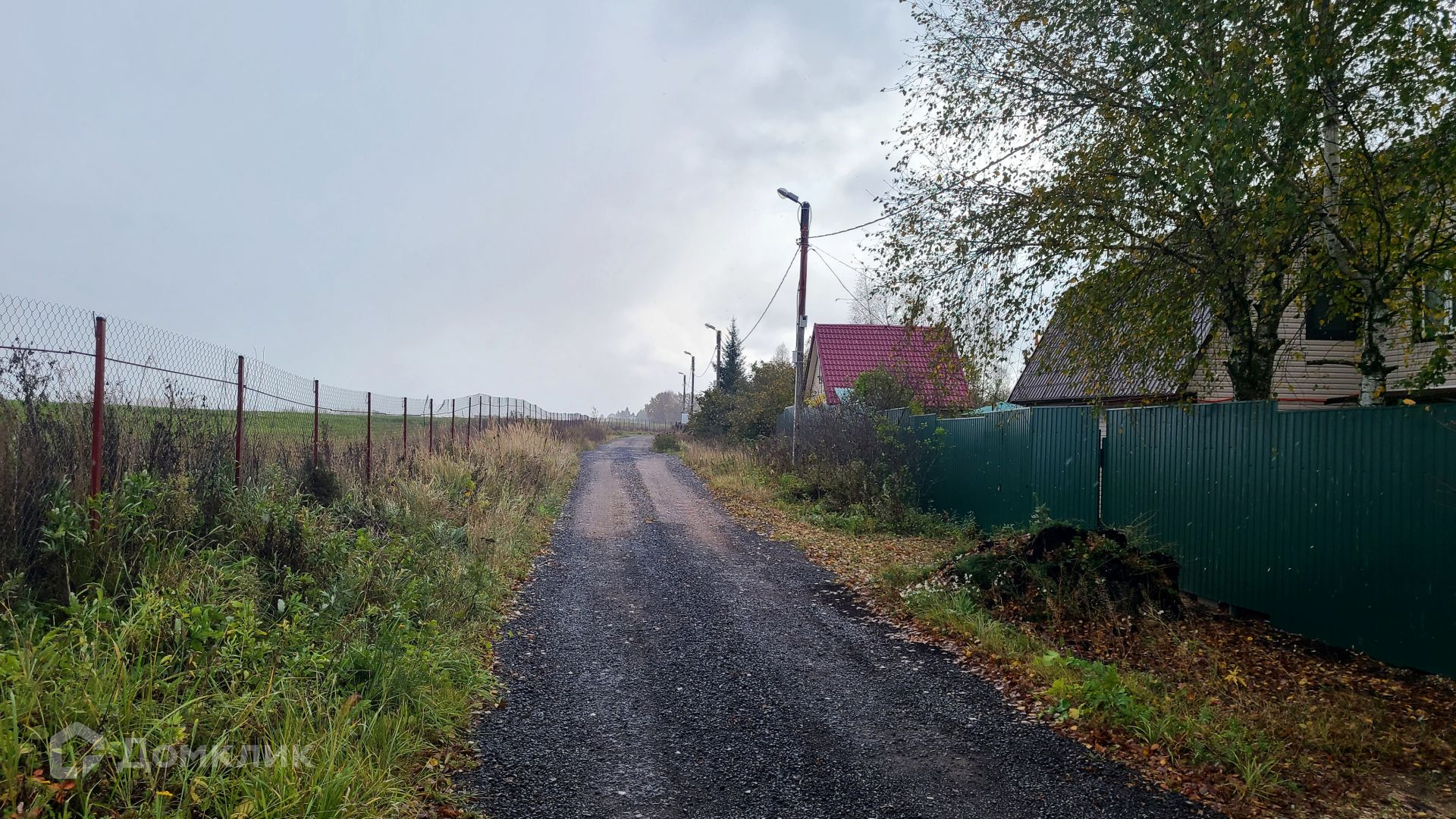 Въезд в поселок через шлагбаум. Поселок граничит с одной стороны с полем, с другой с лесом. Место очень тихое и живописное.